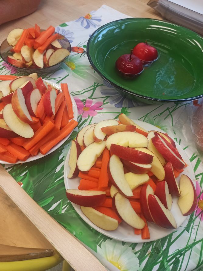 Podczas jednych z porannych zajęć dzieci wykonały pracę plastyczną – owoce i warzywa z masy solnej. Nie zabrakło też rozmów o witaminach oraz zdrowego owocowo-warzywnego poczęstunku.