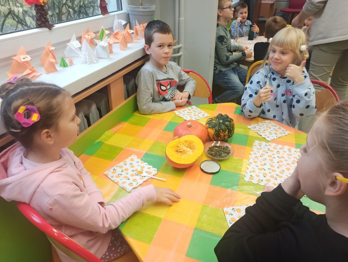W świetlicy obchodziliśmy tydzień dyni. W poniedziałek 27 października odbyły się zajęcia „Dyniowo-kuchcikowo”. Dzieci mogły spróbować ciasta dyniowego, konfitury z dyni oraz chrupiących pestek. Degustacja wzbudziła duże zainteresowanie wśród uczniów.