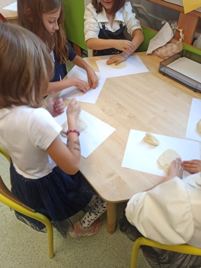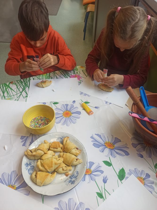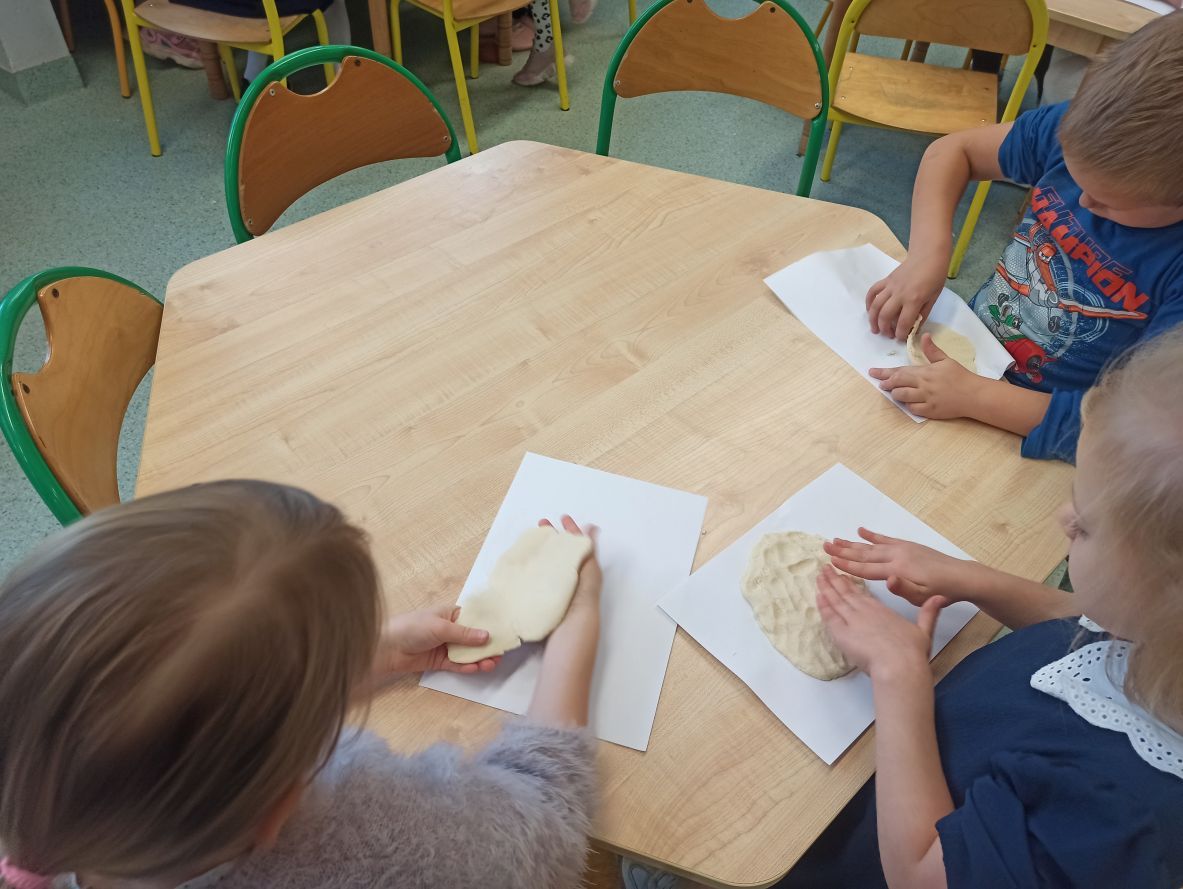 Podczas jednych z zajęć dzieci przygotowywały rogale z masy solnej, poznając przy tym listopadowe tradycje. Każdy uczeń ulepił rogalik i ozdobił go według własnego pomysłu.