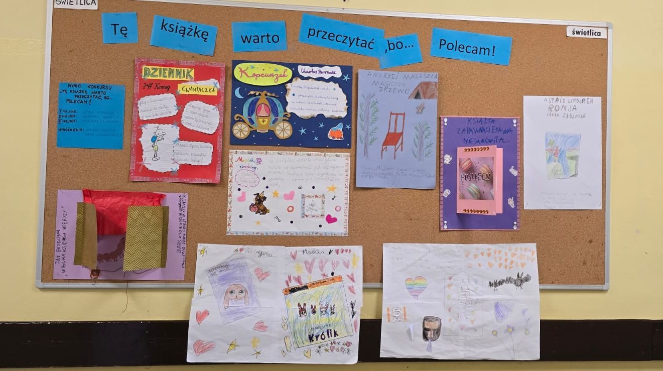 W świetlicy szkolnej odbył się konkurs plastyczny, w ramach którego dzieci przygotowały plakaty promujące wybrane przez siebie książki. Uczniowie wykazali się pomysłowością, a ich kolorowe prace zdobią teraz szkolny korytarz.