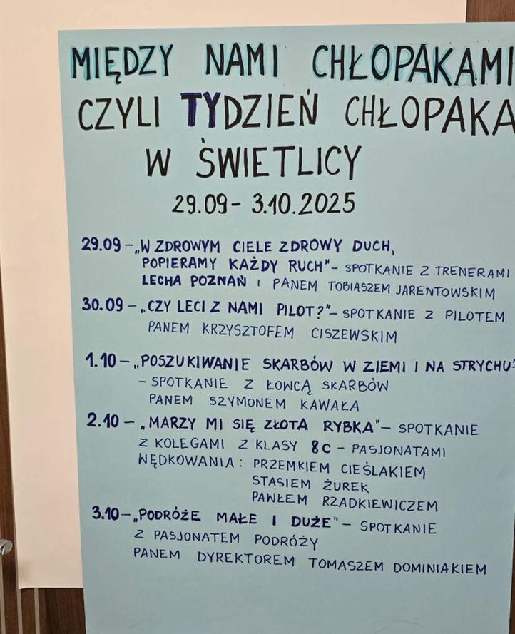 W świetlicy szkolnej odbył się cykl zajęć pod hasłem „Tydzień Mężczyzn”, podczas którego każdego dnia gościliśmy panów opowiadających o swojej pracy i pasjach. W poniedziałek 29 września, tydzień rozpoczął się sportowym akcentem ,,w zdrowym ciele zdrowy duch, popieramy każdy ruch”. Tego dnia odwiedzili nas trenerzy z Akademii Lecha Poznań, którzy poprowadzili dla uczniów wyjątkowy trening. Dzieci miały okazję poćwiczyć z profesjonalistami, poznać piłkarskie triki i aktywnie spędzić czas na świeżym powietrzu