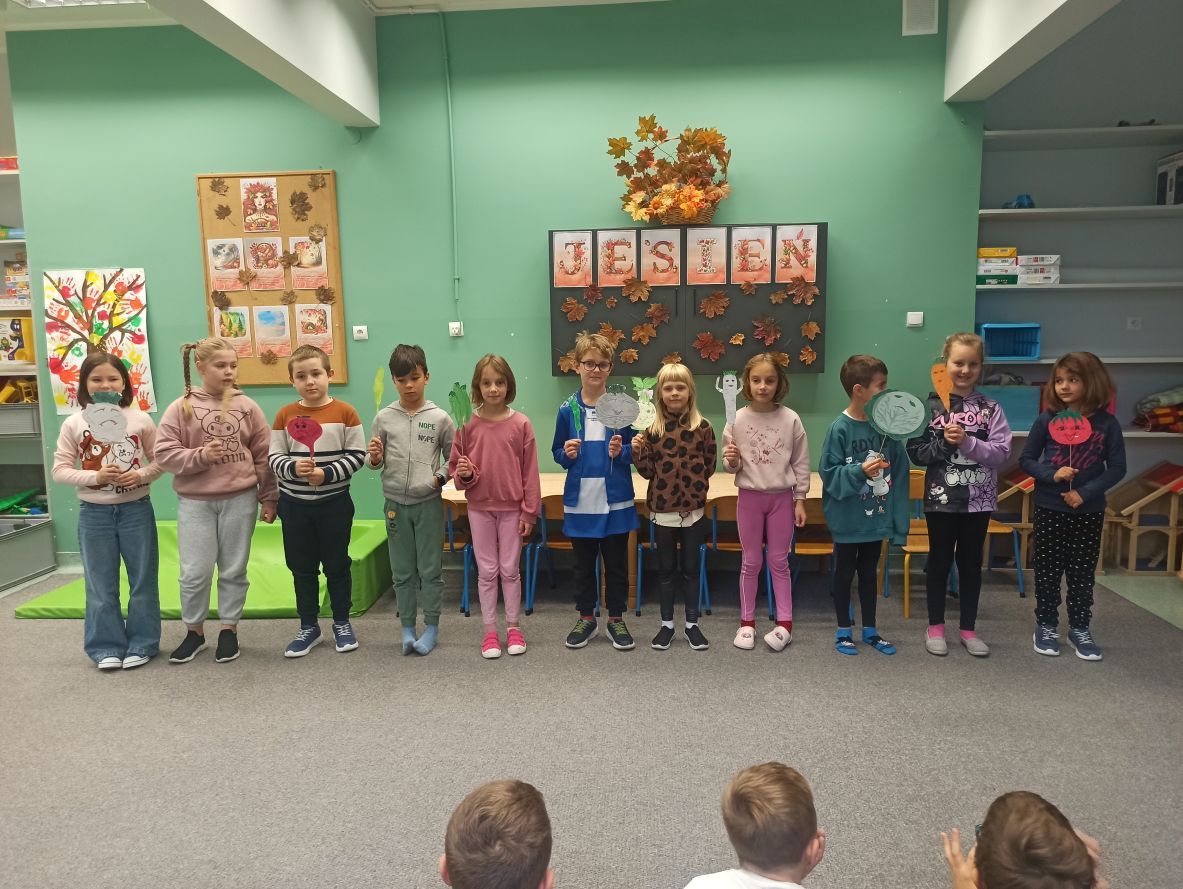 Dnia 9 października dzieci wzięły udział w zajęciach teatralnych, podczas których samodzielnie przygotowały kolorowe kukiełki przedstawiające warzywa. Następnie zaprezentowały inscenizację wiersza „Na straganie” Jana Brzechwy, bawiąc się i odgrywając scenki z udziałem swoich prac.