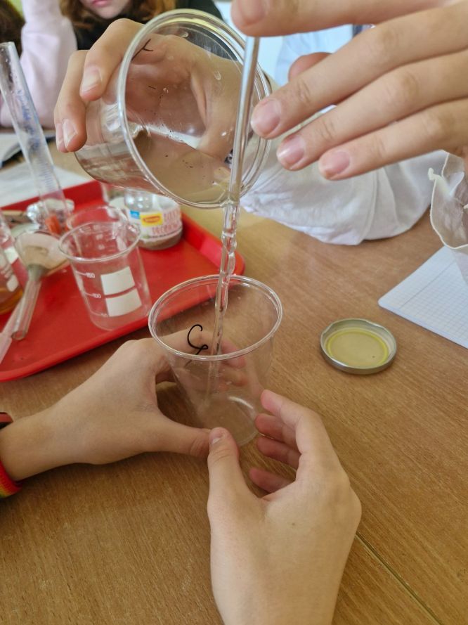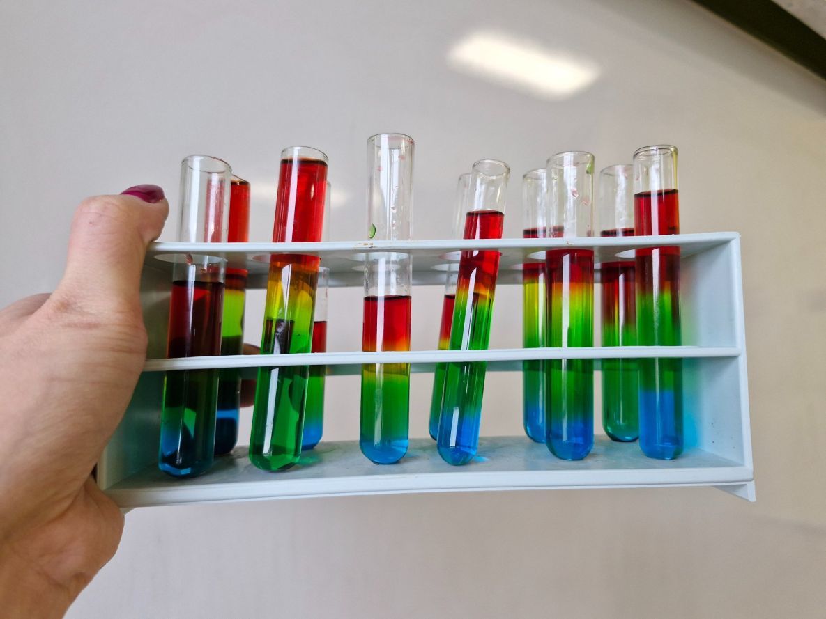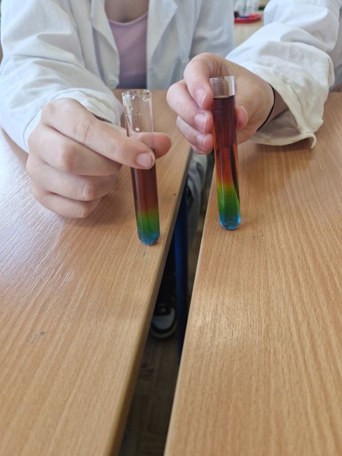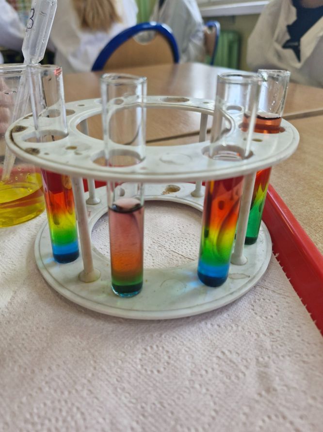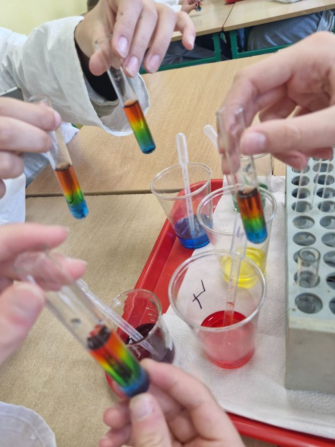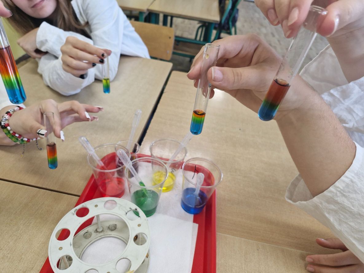 Uczniowie klas siódmych z zaangażowaniem odkrywają tajemnice chemii. Podczas lekcji poświęconej gęstości mieli okazję stworzyć własne, kolorowe i słodkie tęcze, wykorzystując różnice w gęstości barwnych roztworów. Eksperyment nie tylko cieszył oko, ale przede wszystkim pozwolił na praktyczne zrozumienie omawianego zjawiska.