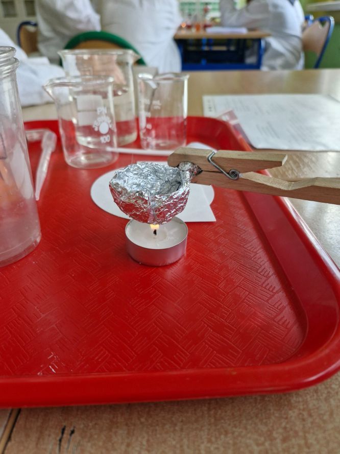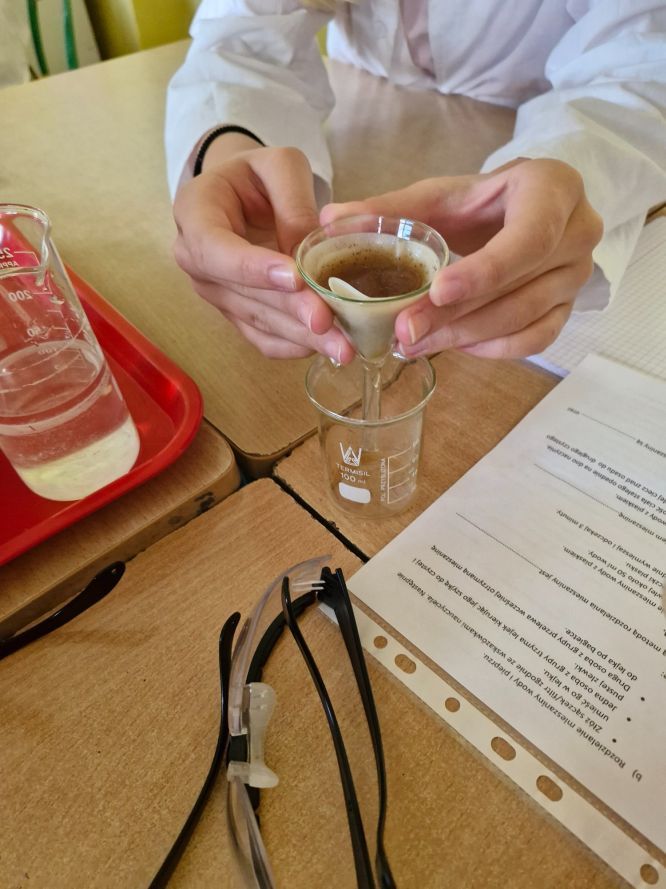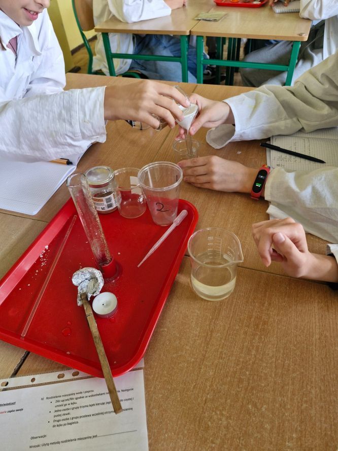Następnie przyszedł czas na temat mieszanin. Uczniowie wcielili się w rolę małych chemików i samodzielnie rozdzielali przygotowane wcześniej mieszaniny różnymi metodami: odparowywaniem, sączeniem, dekantacją oraz sedymentacją. Praktyczne działania przyniosły nie tylko mnóstwo frajdy, ale i solidną dawkę wiedzy.