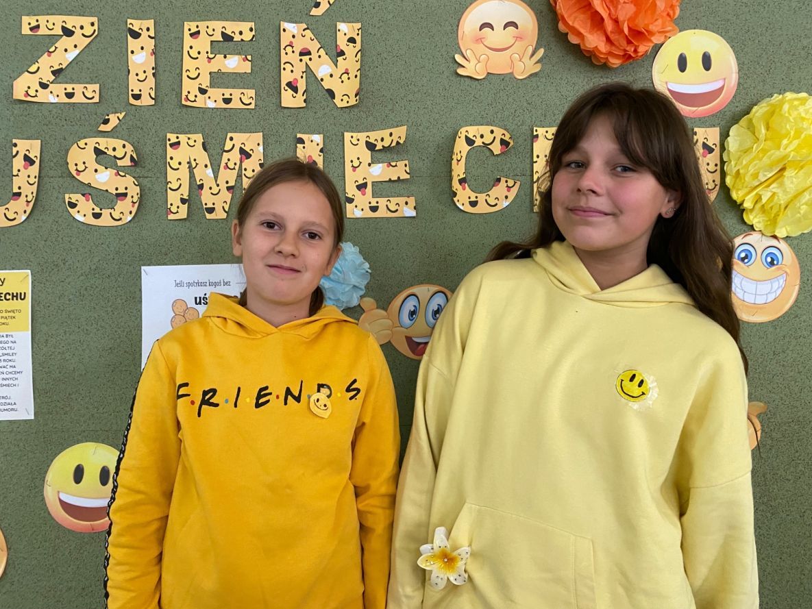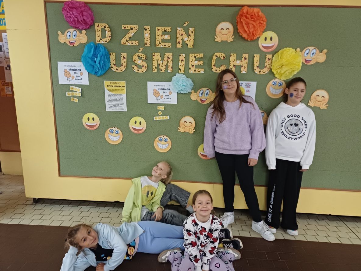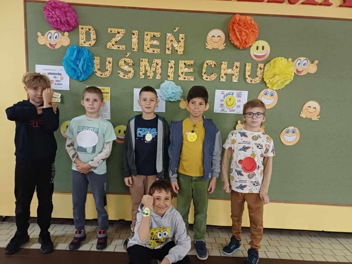 W ten uśmiechnięty dzień nasi uczniowie mieli za zadanie ubrać się w słoneczny kolor żółty, przyczepić do ubrania własnoręcznie wykonaną uśmiechniętą buźkę lub namalować ją na twarzy i podzielić się uśmiechem z drugim człowiekiem. W naszą akcję zaangażowało się sporo uczniów i uczennic z wszystkich klas. Zaangażowane osoby zrobiły sobie uśmiechnięte zdjęcia na tle uśmiechniętej ścianki znajdującej się w holu szkoły. Najciekawsze fotografie zostały wyróżnione i nagrodzone słodką niespodzianką.  Dziękujemy wszystkim za przyłączenia się do naszego wydarzenia.