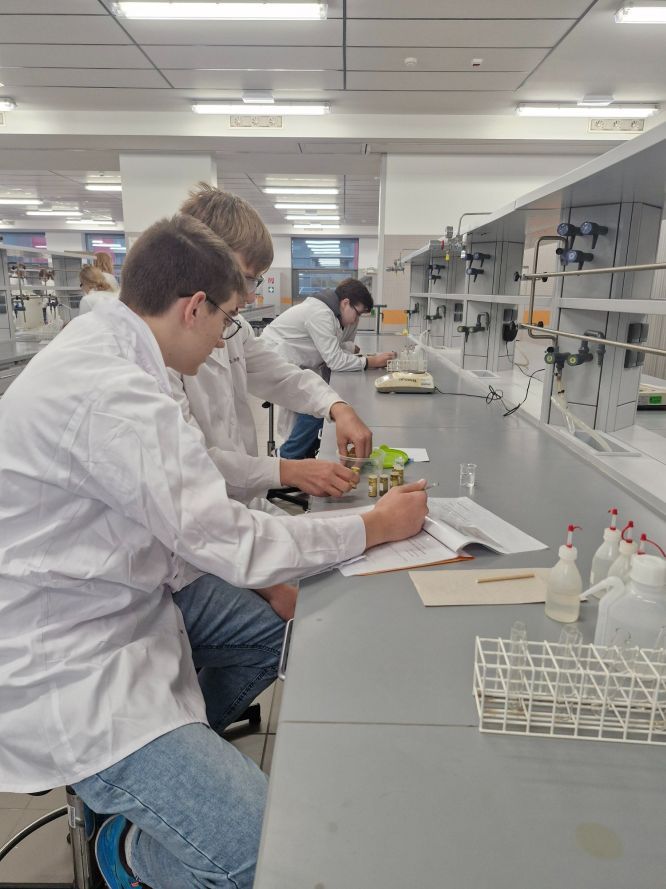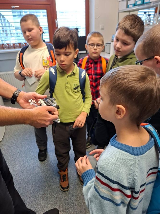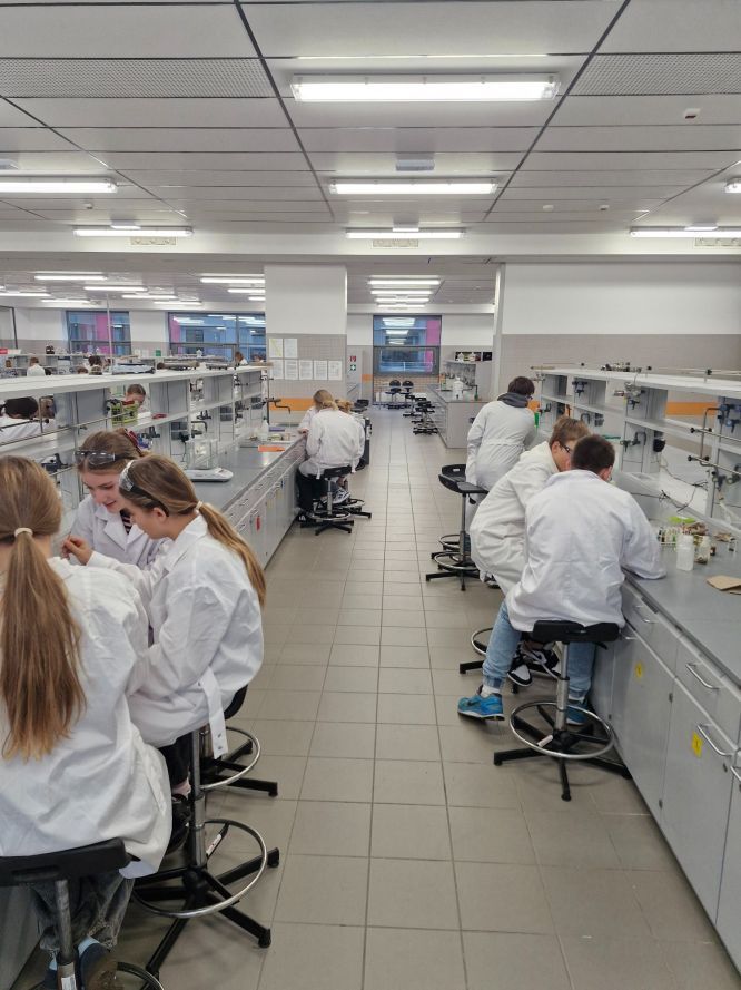 Uczniowie klas 8B, 8C oraz 8E dnia 28 października 2025 roku wybrali się na Wydział Chemii Uniwersytetu Adama Mickiewicza w Poznaniu w ramach współpracy szkoły z uczelnią w programie klas akademickich.