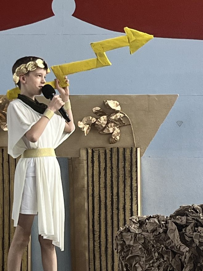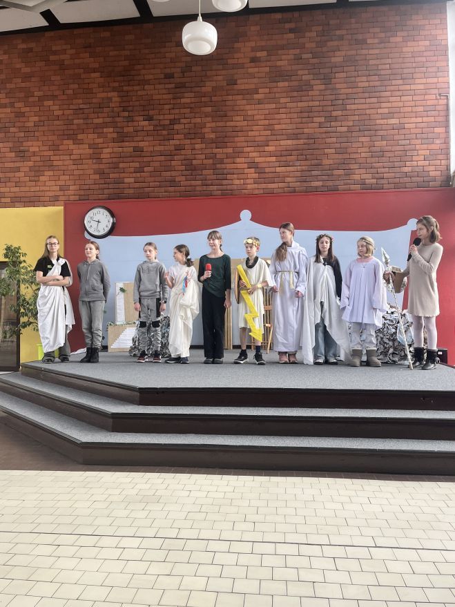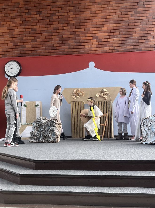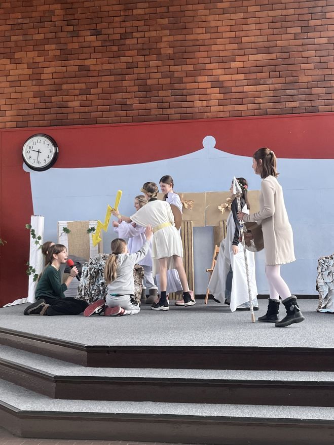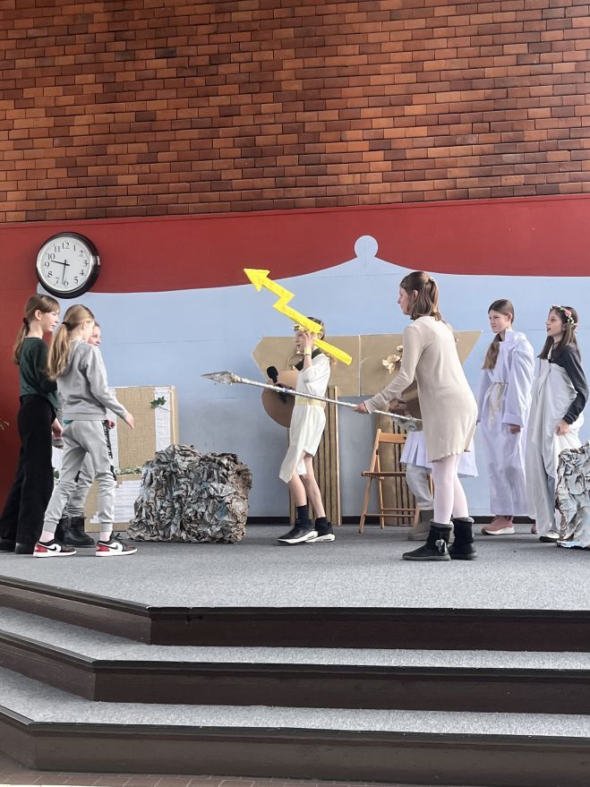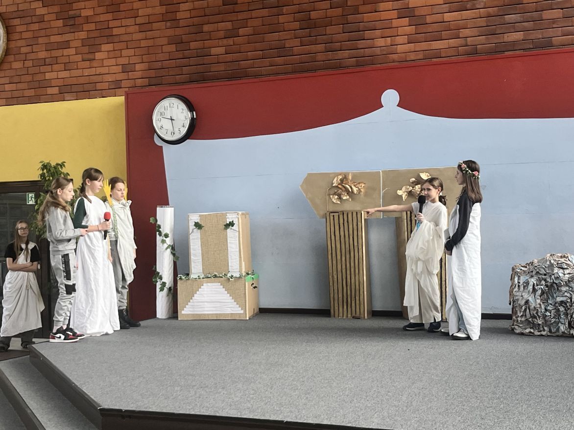 W ramach klasowego projektu uczniowie 5a przygotowali scenariusze oparte na wybranych mitach greckich. Jedna z grup projektowych postanowiła zaprezentować efekty swojej pracy zaproszonym klasom. Mogły one podziwiać przedstawienie opowiadające o powstaniu świata i narodzinach bogów według starożytnych. Każdy członek grupy odpowiedzialny był za realizację wyznaczonego wcześniej zadania i wszyscy świetnie się z tego wywiązali, prezentując ostatecznie bardzo ciekawe ujęcie tego mitu, wcielając się w role bogów i bogiń w otoczeniu własnoręcznie przygotowanej scenografii.