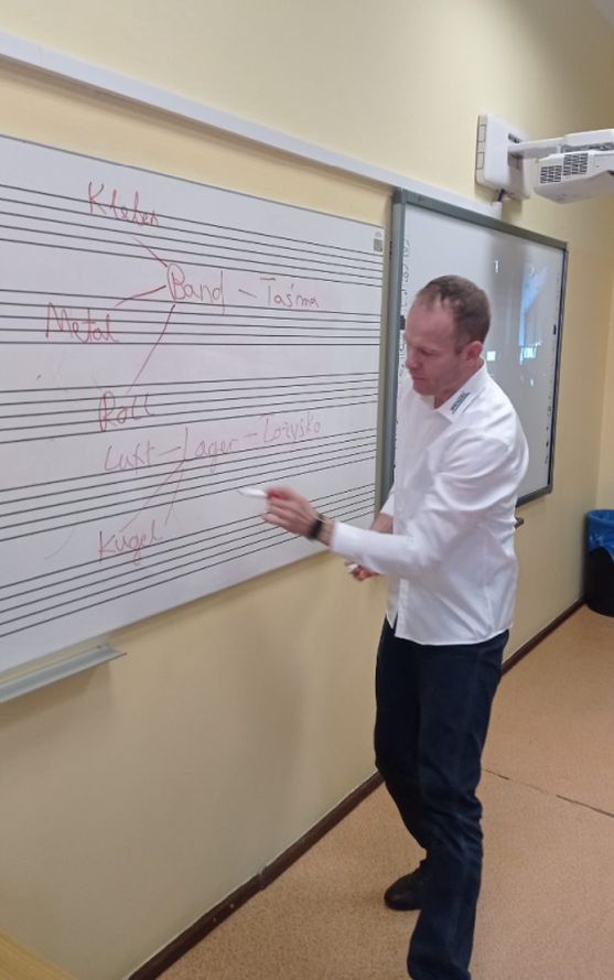 Pan Robert, ojciec jednego z uczniów klasy siódmej przeprowadził ciekawe zajęcia podczas lekcji języka niemieckiego, nawiązując do tematu „Zawody”. Zajęcia były prowadzone dwujęzycznie, uatrakcyjnione narzędziami nazywanymi w języku niemiecki. Brawo dla rodzica z inicjatywą.