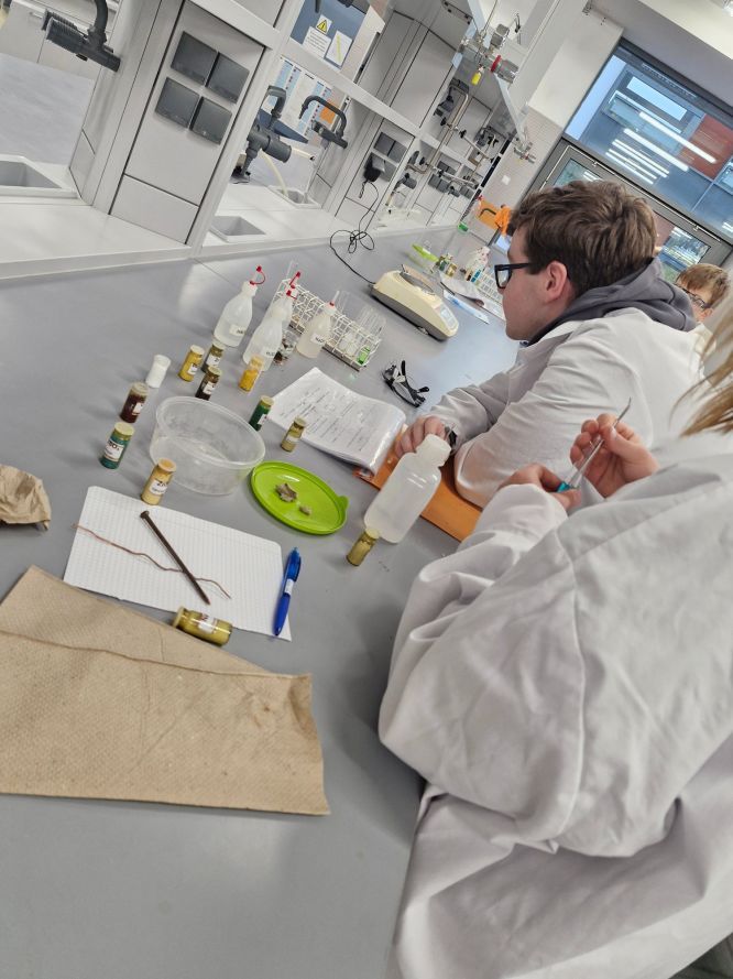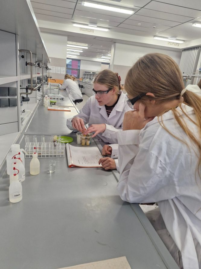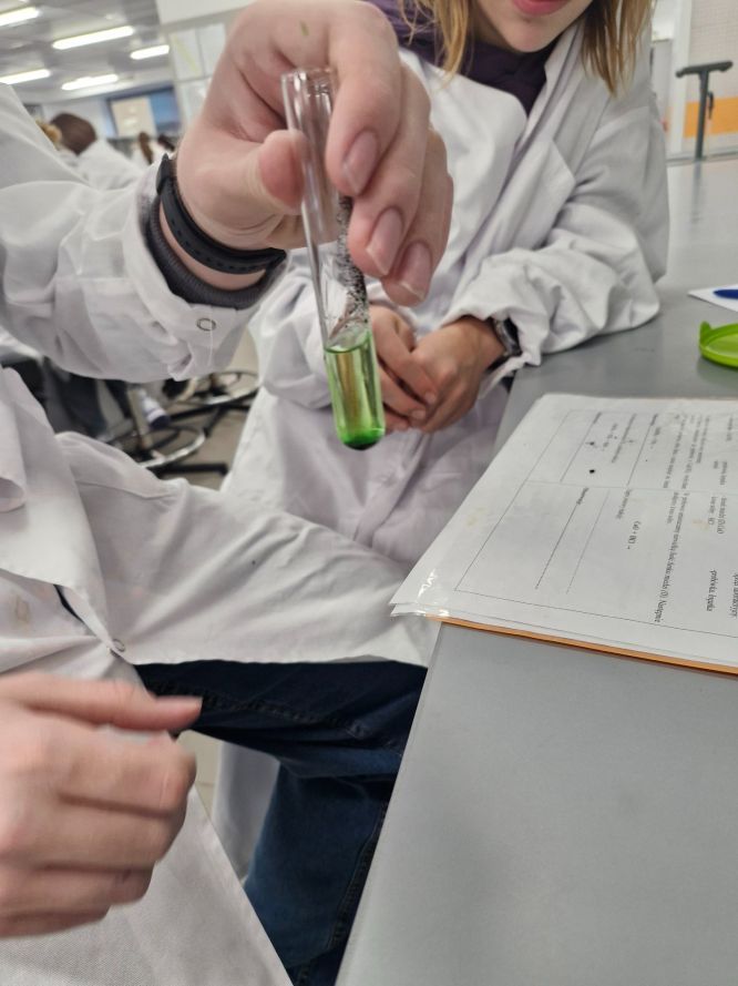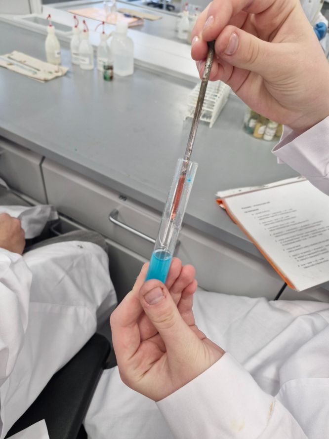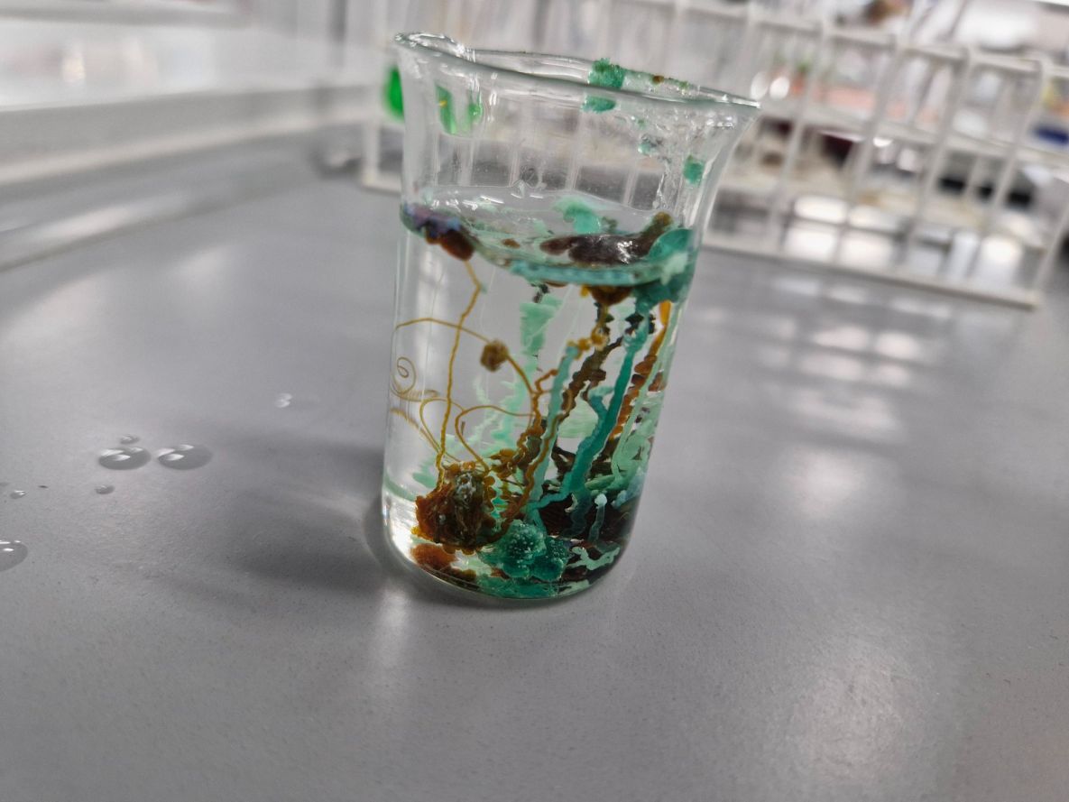 Podczas zajęć laboratoryjnych uczniowie wykonywali wiele eksperymentów związanych z działem chemii „sole”. Samodzielnie przeprowadzali reakcje otrzymywania różnobarwnych soli, tworzyli piękne ogrody chemiczne, a także poznawali działanie szeregu napięciowego metali, obserwując wypieranie miedzi z roztworu jej soli i osadzanie się jej na gwoździu.
