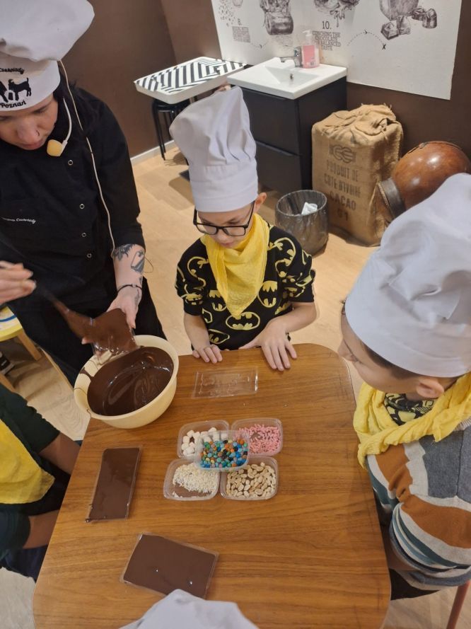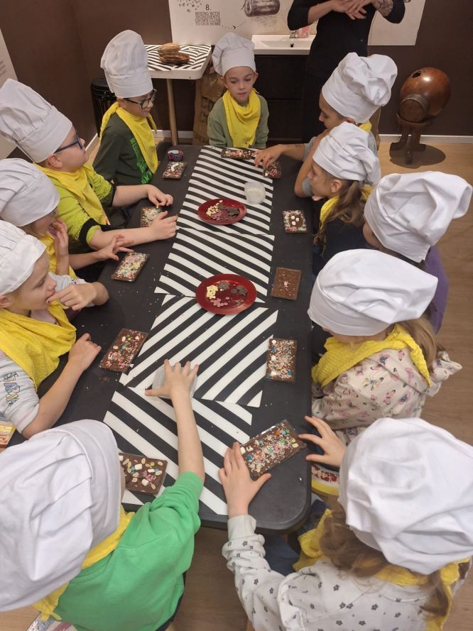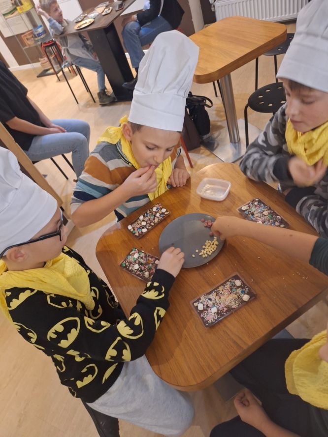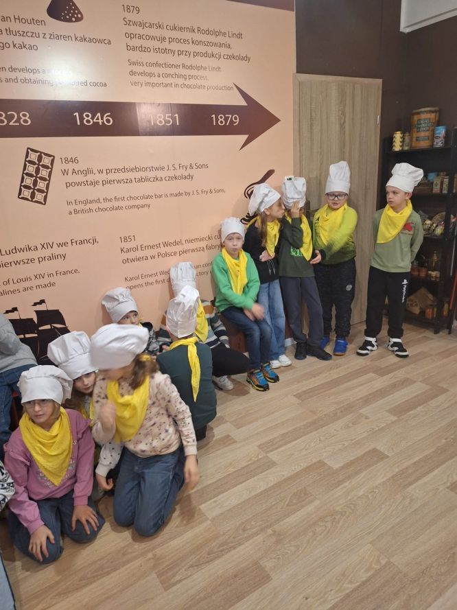 W ostatnim tygodniu października uczniowie klasy 3b wybrali się na słodką przygodę do Fabryki Czekolady, gdzie wzięli udział w warsztatach cukierniczych. Podczas zajęć dzieci poznały proces powstawania czekolady – od ziarna kakaowca aż po gotowy produkt. Utrwaliły również wiadomości z zakresu przyrody, geografii i techniki, obserwując drogę, jaką przebywa czekolada od surowca do wyrobu gotowego.