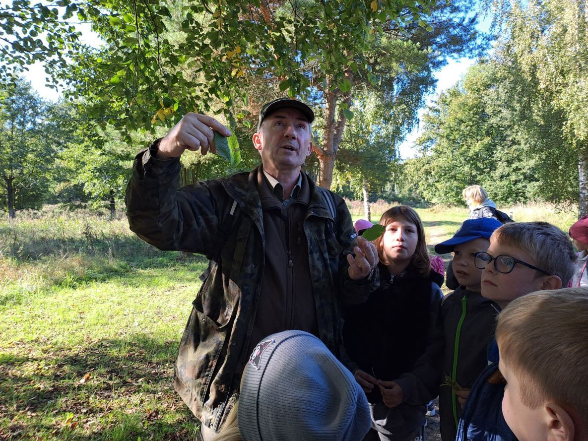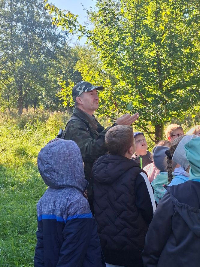 W dniach 24 i 25 września uczniowie klas drugich wybrali się na wyjątkową wycieczkę do lasu. Przewodnikiem był Pan Leśniczy, który z ogromną pasją opowiadał o drzewach, zwierzętach i tajemnicach przyrody. Dzieci uczyły się rozpoznawać różne gatunki drzew, dotykały kory, oglądały liście. Po wspólnym spacerze nadszedł czas na ognisko i kiełbaski. Potem wszyscy bawili się na leśnej polanie. Było dużo śmiechu, radości i wspólnej zabawy na świeżym powietrzu. To był dzień pełen przygód, wiedzy i niezapomnianych chwil.