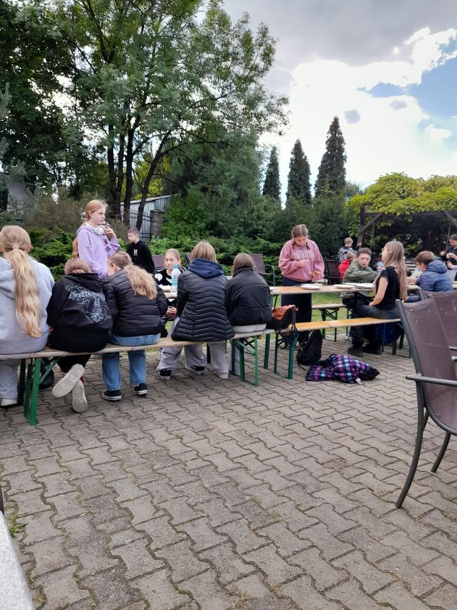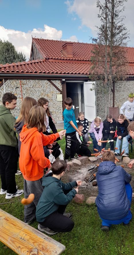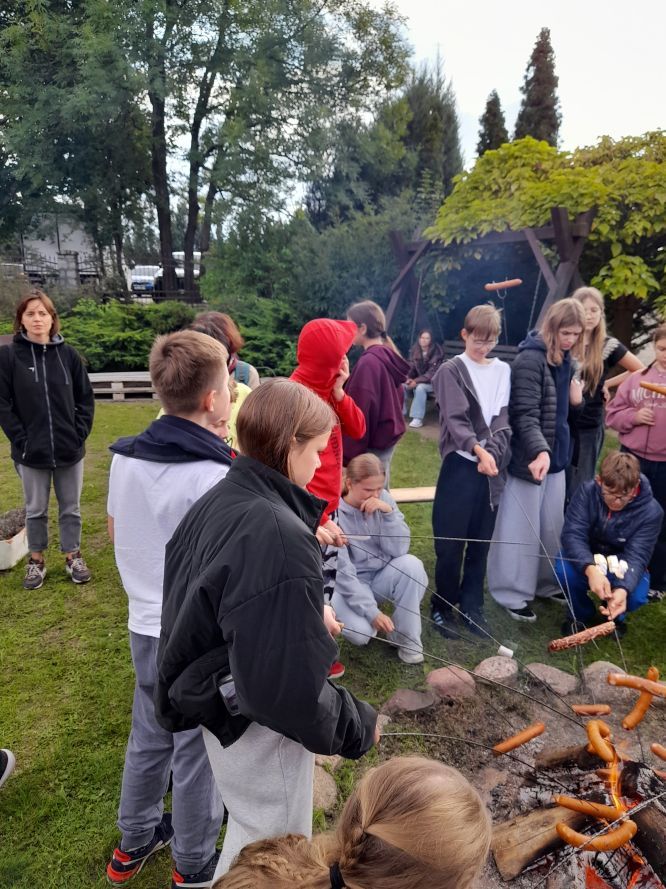Po intensywnej nauce w plenerze, nadszedł czas na zasłużony odpoczynek. Rozpaliliśmy ognisko, przy którym wspólnie upiekliśmy pyszne kiełbaski. To był doskonały moment na integrację, rozmowy i śmiech na łonie natury.