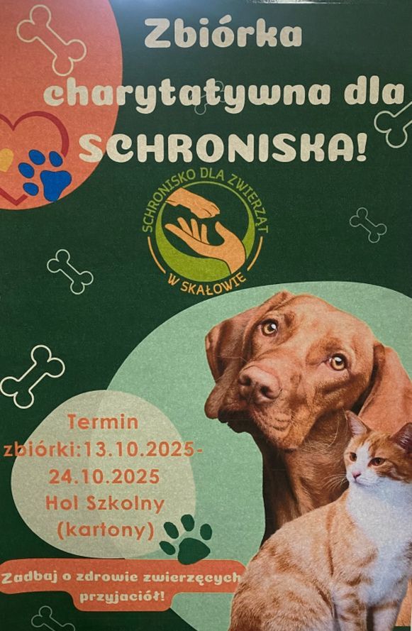 W miesiącu październiku Samorząd Uczniowski wraz z opiekunami podjął się zorganizowania zbiórki charytatywnej dla Schroniska dla zwierząt w Skałowie. Zbiórka trwała od 13.10-28.10.2025 i pozwoliła na zebranie potrzebnych rzeczy dla zwierząt przebywających pod opieką schroniska. Uczniowie i rodzice wykazali się ogromnym sercem i empatią dla zwierząt przynieśli karmę dla psów, puszki dla kotów, zabawki, gryzaki, koce, ręcznik. Każdy darczyńca okazał ogromne zaangażowanie w pomoc dla psów i kotów w potrzebie szczególnie w trudnym czasie jesienno-zimowym.