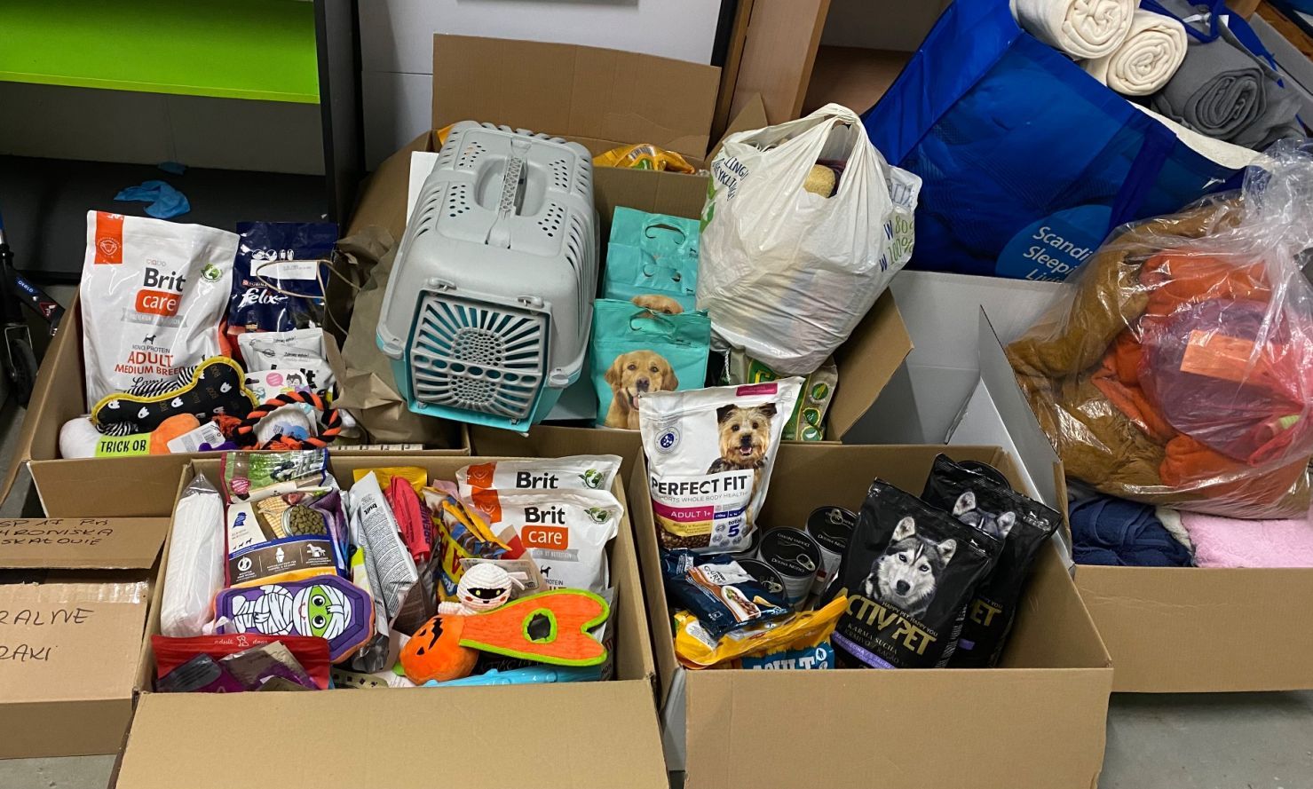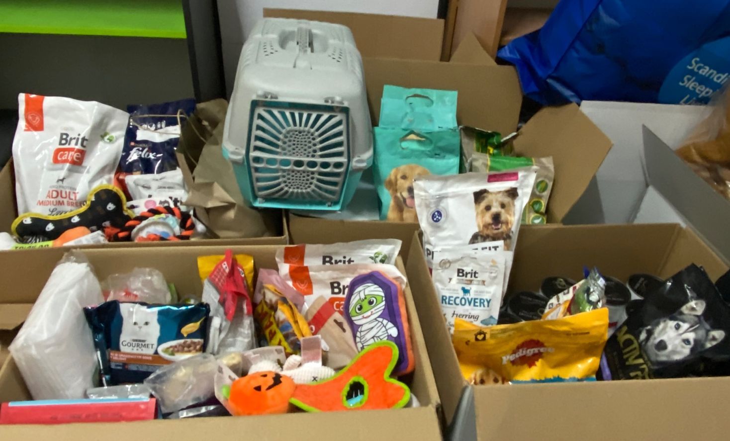 - 4 kartony z karmą, puszkami, żwirkiem