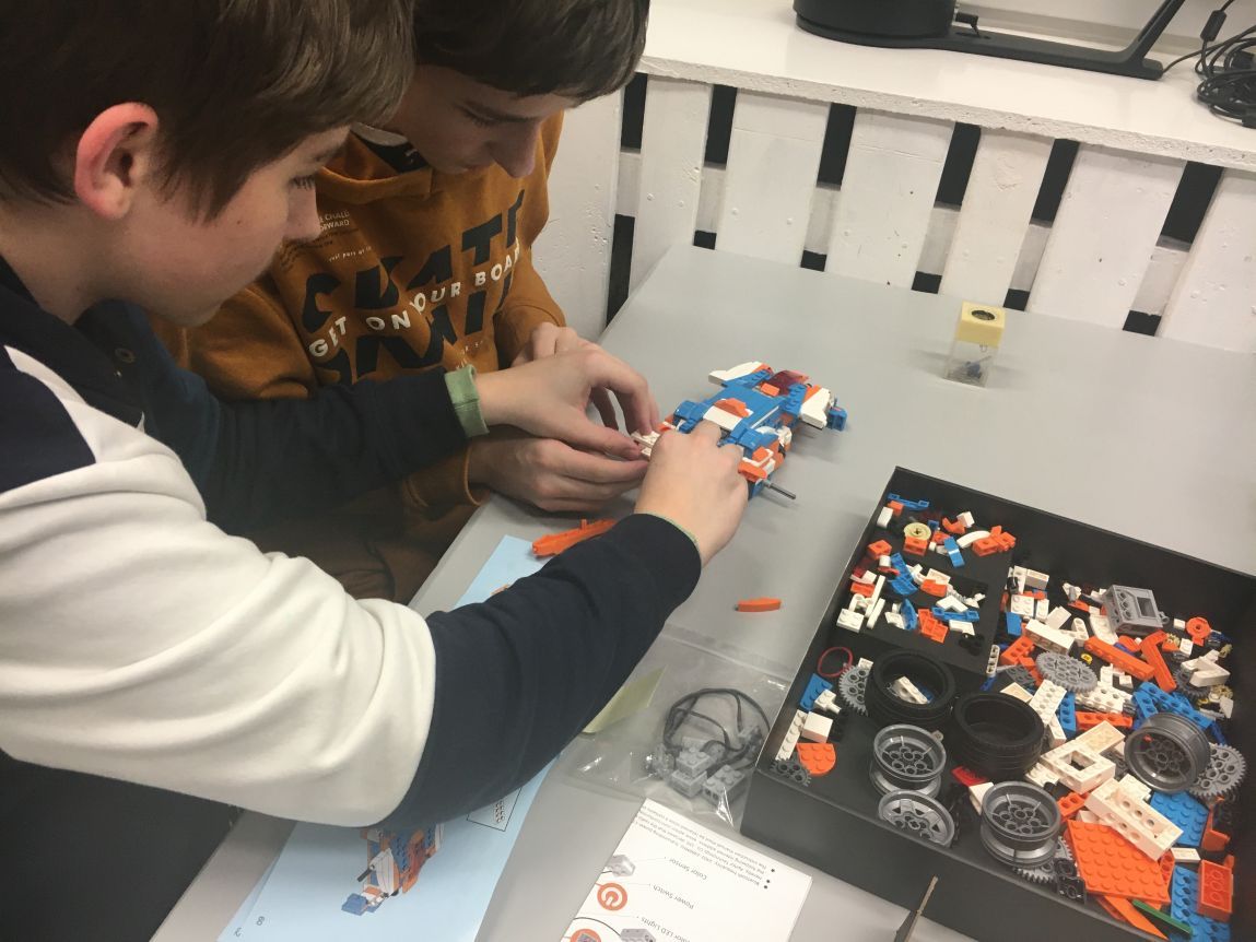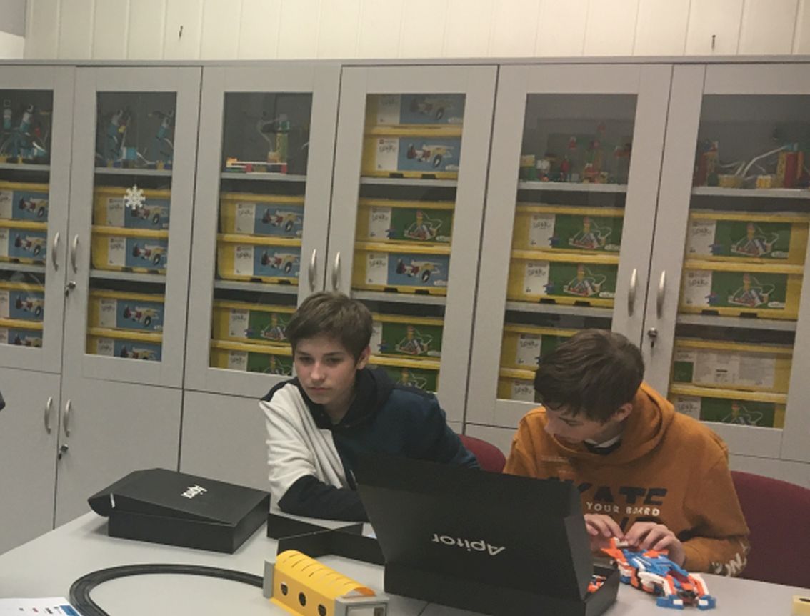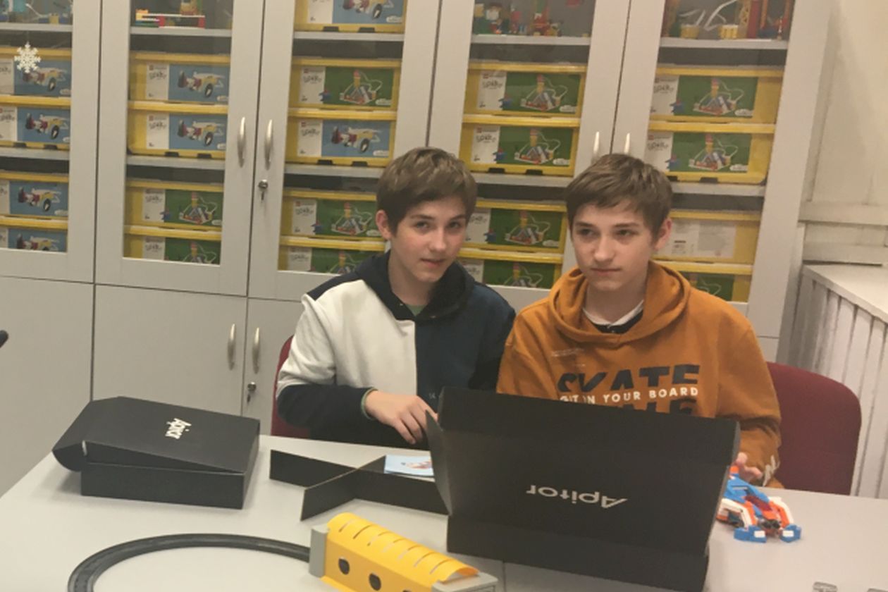 Uczniowie klas 7 na zajęciach robotyki konstruowali samochód wyścigowy z zestawu klocków Apitor X.