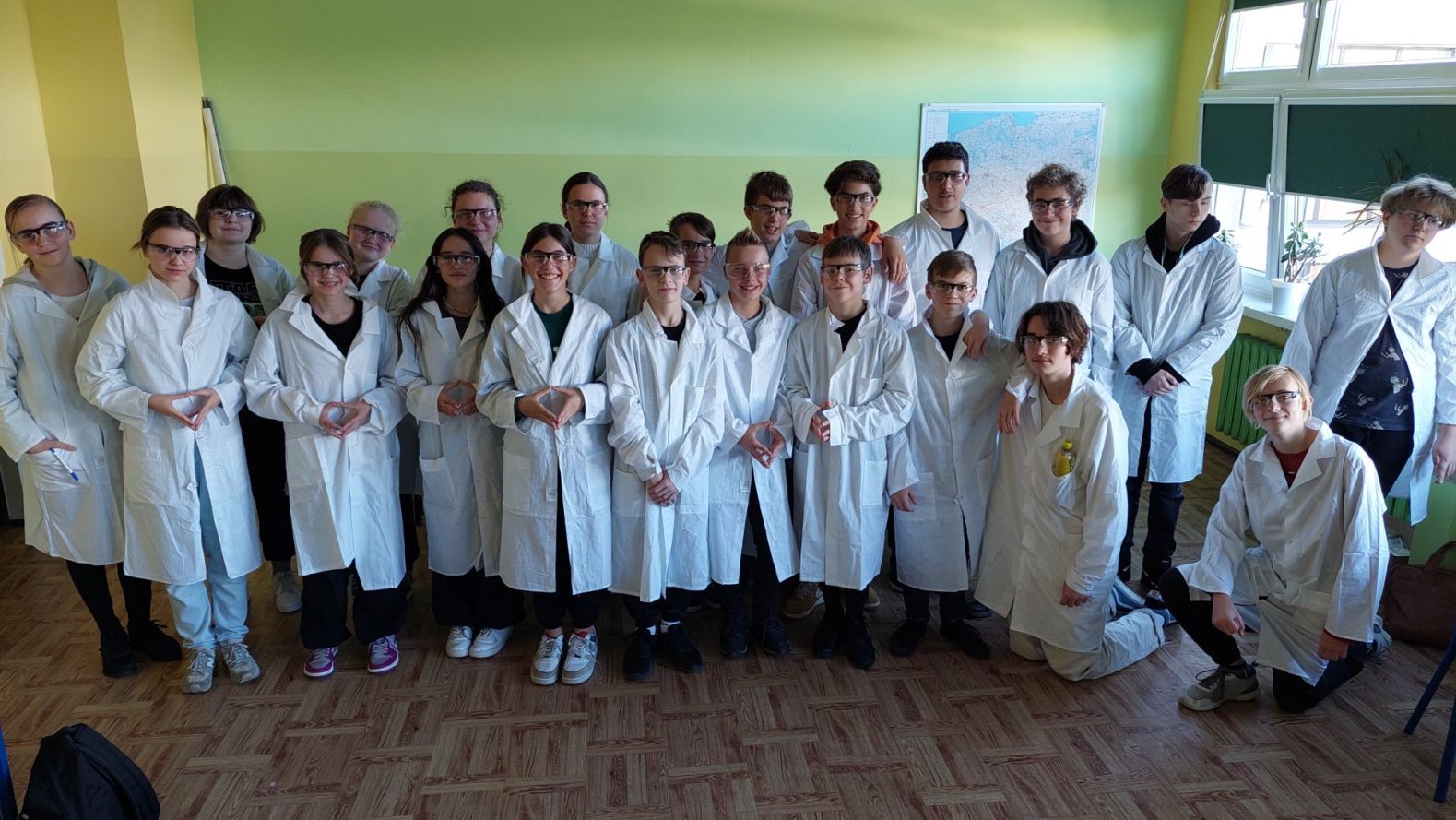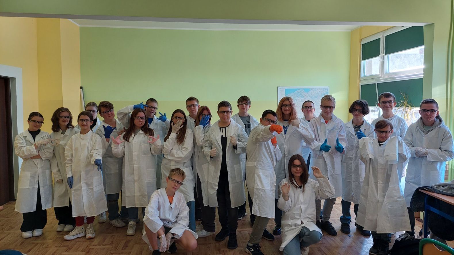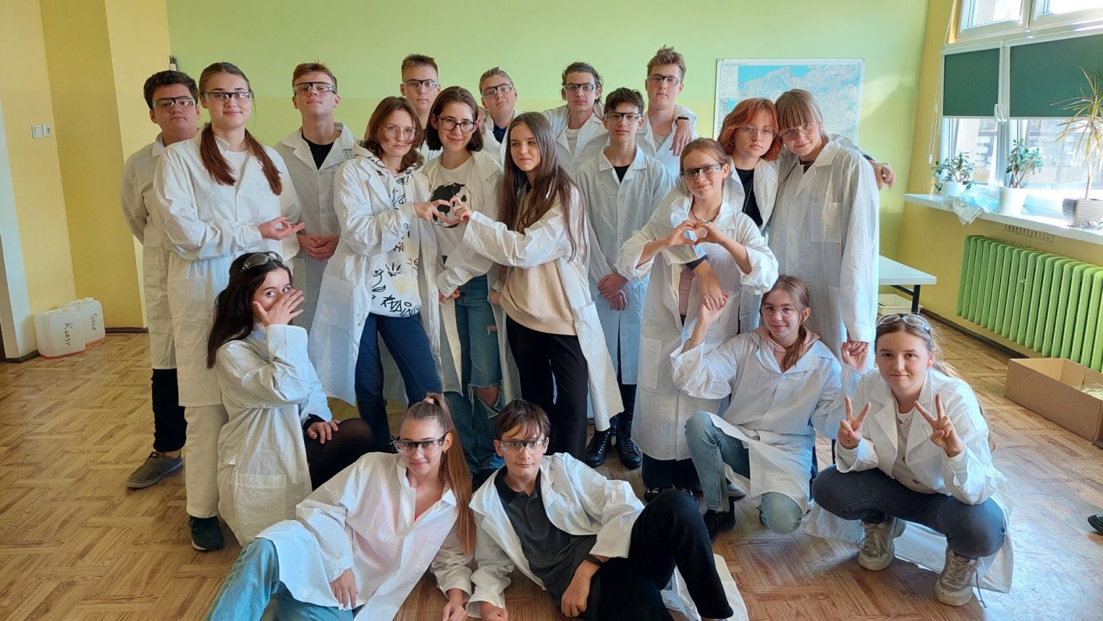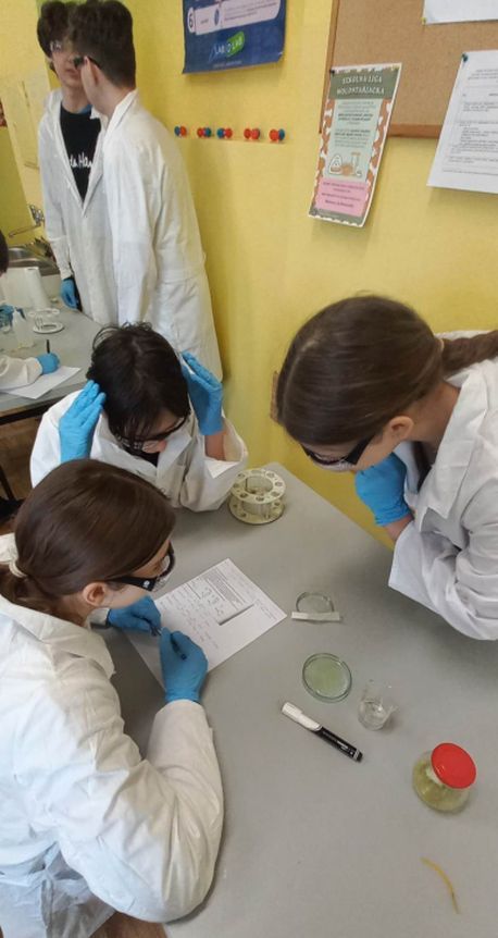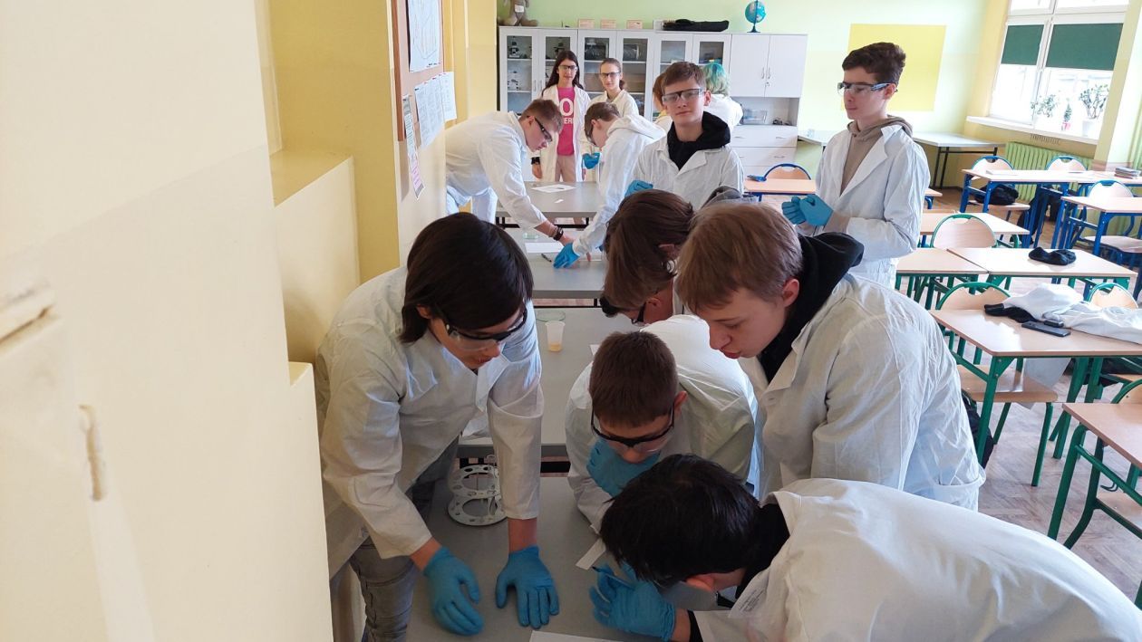 Podczas październikowych lekcji chemii uczniowie klas 8 określali odczyny różnych substancji, które używane są w życiu codziennym jak np. ocet czy płyn do prania. Młodzi adepci chemii pracowali w kilkuosobowych grupach rozwijając swoje umiejętności laboratoryjne. Wykorzystywali do tego celu podstawie szkło laboratoryjne oraz wskaźniki np. oranż metylowy czy uniwersalny papierek wskaźnikowy. Swoją pracę wykonywali zgodnie z zasadami BHP czyli w fartuchach i okularach ochronnych, które zostały zakupione z projektu ” Laboratoria Przyszłości”