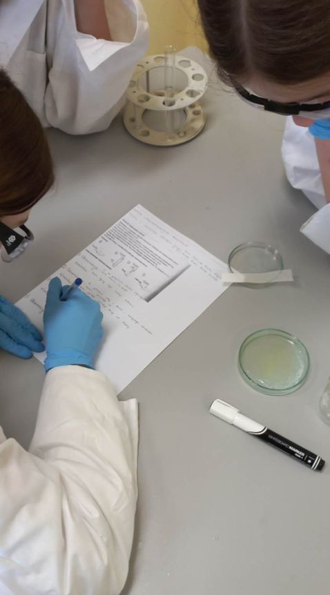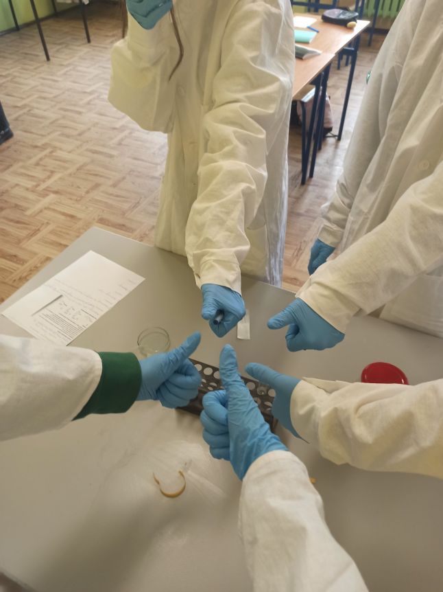 W ostatnim czasie uczniowie klas 8 pracowali laboratoryjnie, wykorzystując fartuchy i okulary, które zostały zakupione z programu ” Laboratoria Przyszłości”. W ramach zajęć chemii badali właściwości fizyczne i chemiczne alkoholu etylowego. Młodzi adepci bardzo dobrze radzili sobie z powierzonym zadaniem i z niezwykłym skupieniem badali zjawisko kontrakcji czy proces denaturacji.