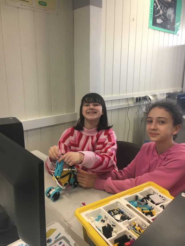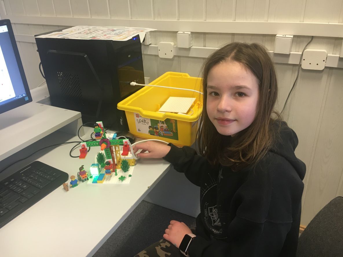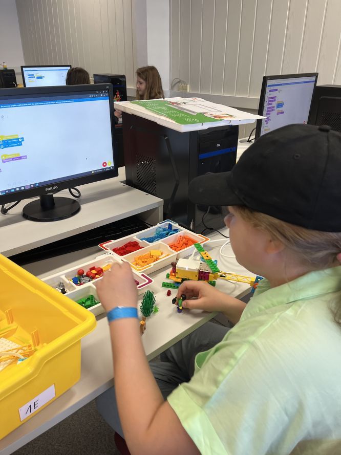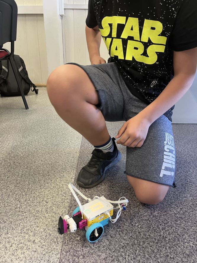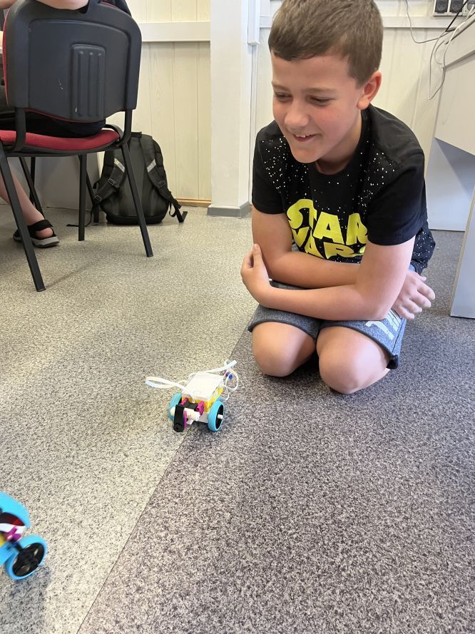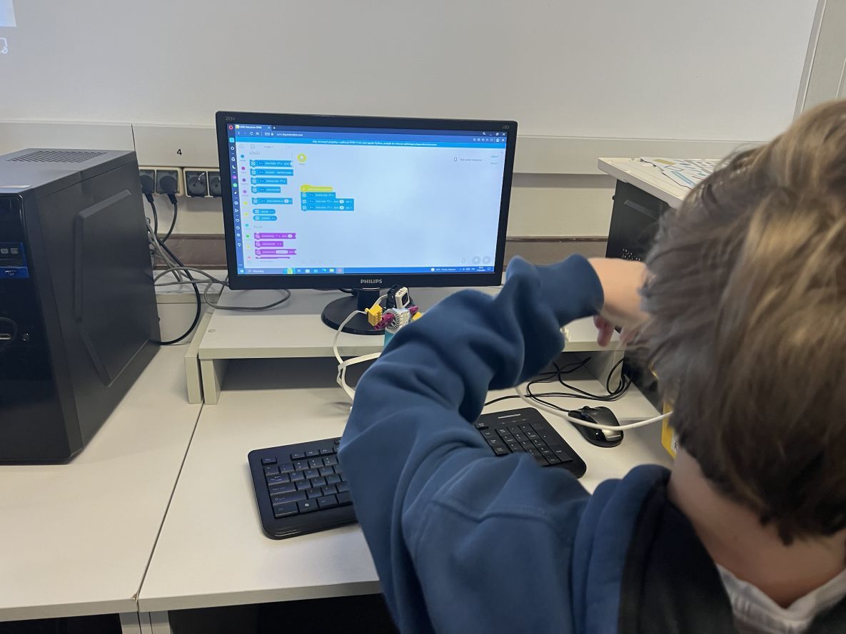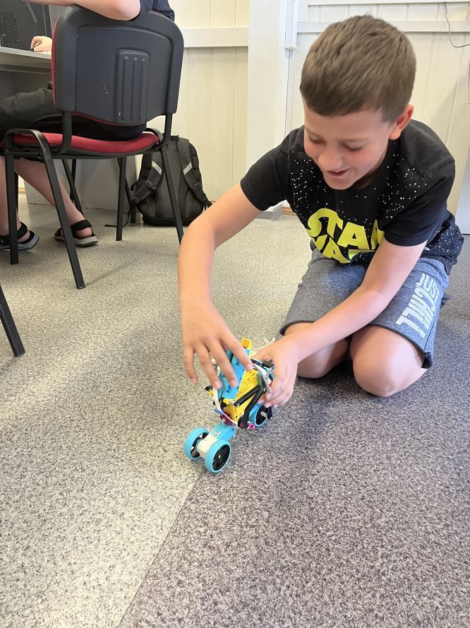 Uczniowie klas 4 i 5 na lekcjach informatyki konstruowali i programowali wizualnie jaskiniowy samochód z klocków Lego Spike Essential. Po zbudowaniu modelu tworzyliśmy program kontrolujący światło pojazdu.