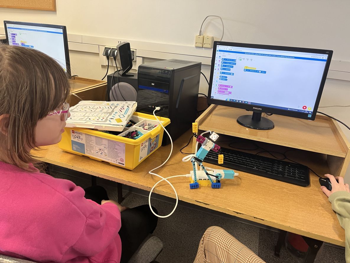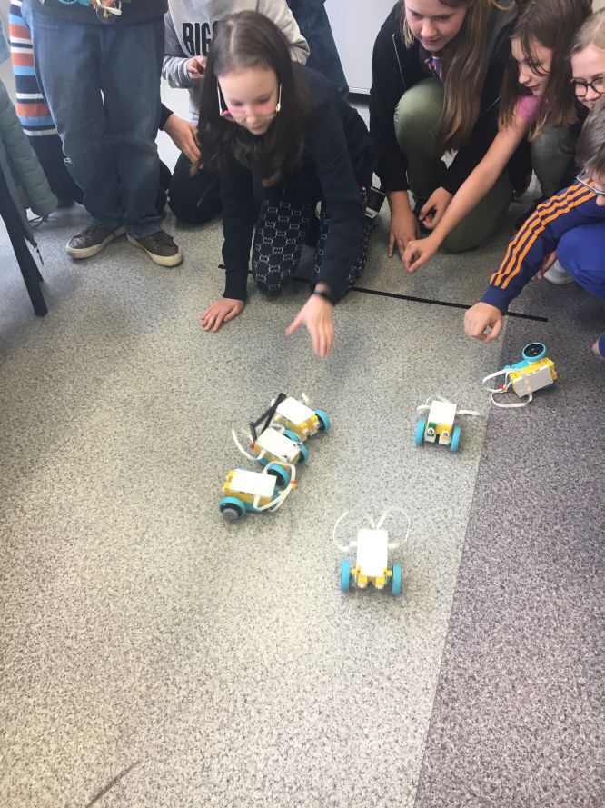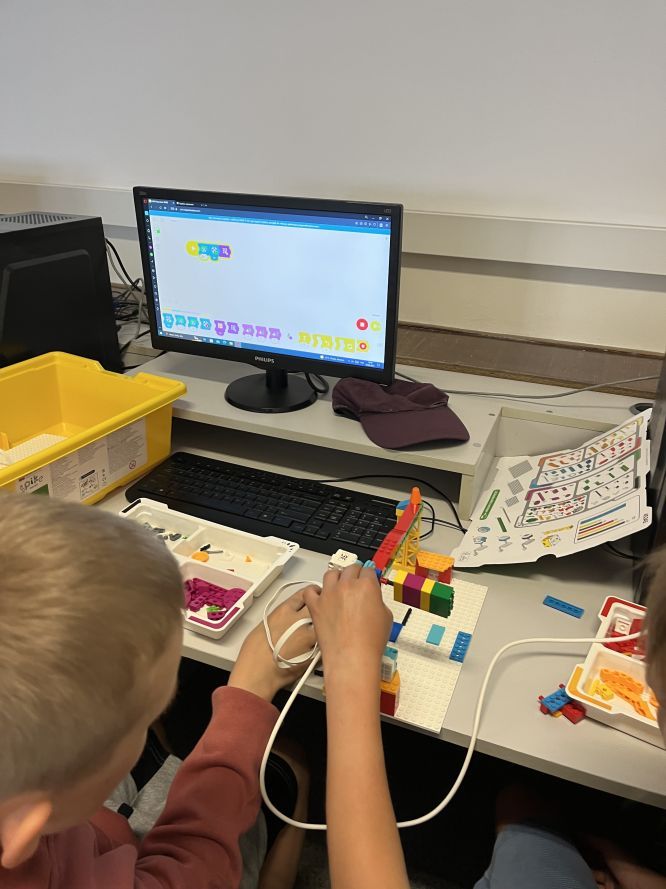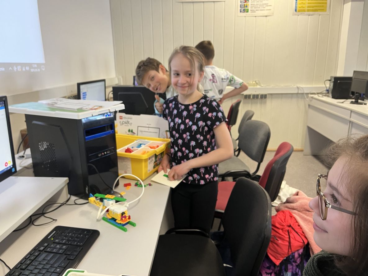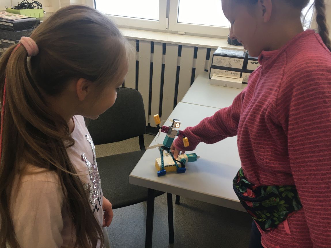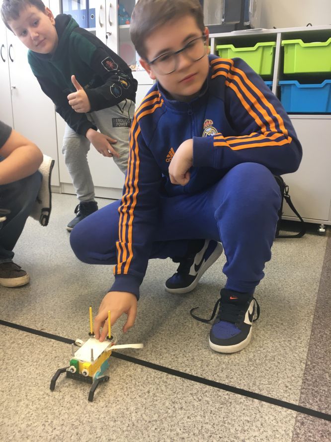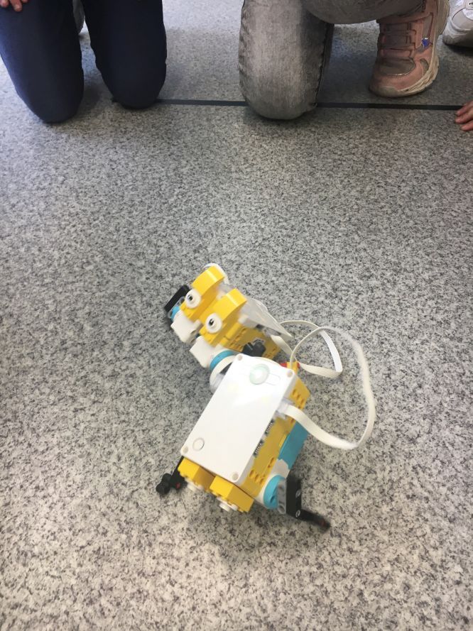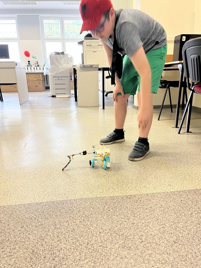 Na lekcjach informatyki w klasach czwartych i piątych zorganizowaliśmy wyścigi skoczków Lego Spike Prime. Po zbudowaniu skoczka według instrukcji, wprawieniu go w ruch i wypróbowaniu jego możliwości w wyścigu, nastąpiło tworzenie prototypu nowych odnóży, aby skoczek posuwał się naprzód szybciej.