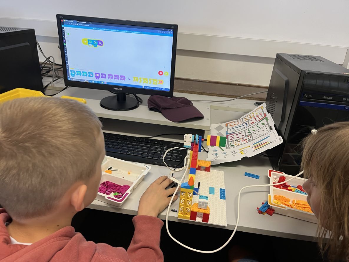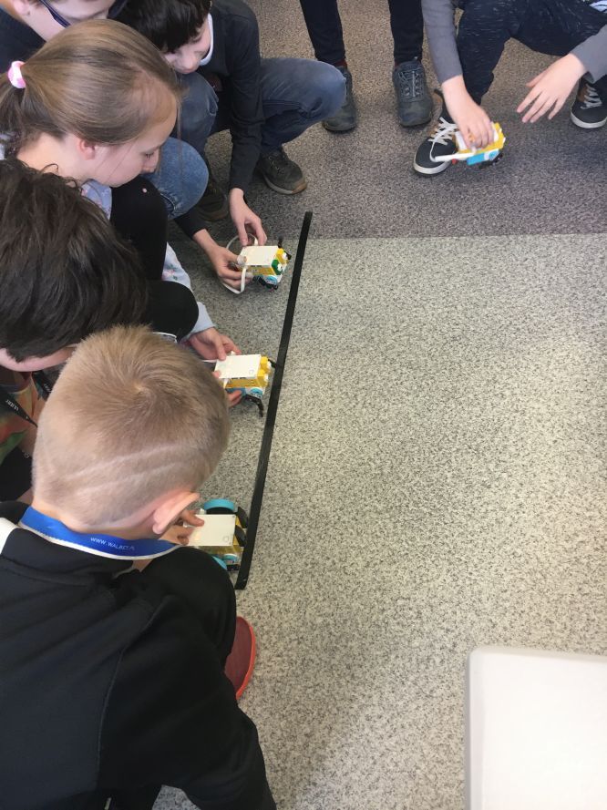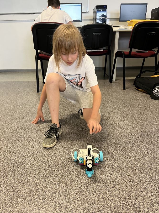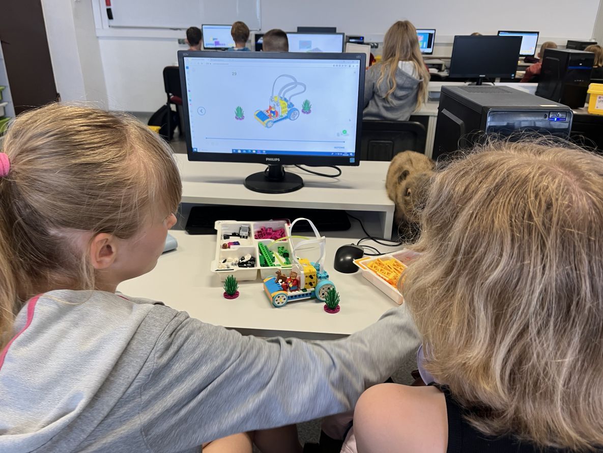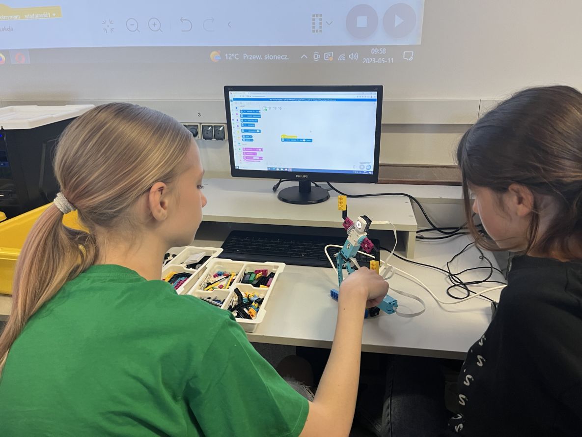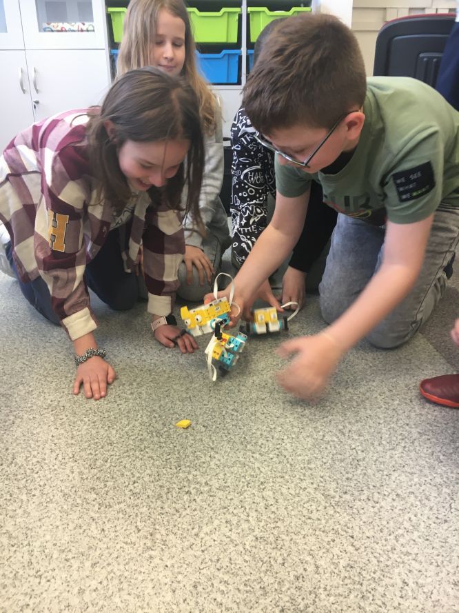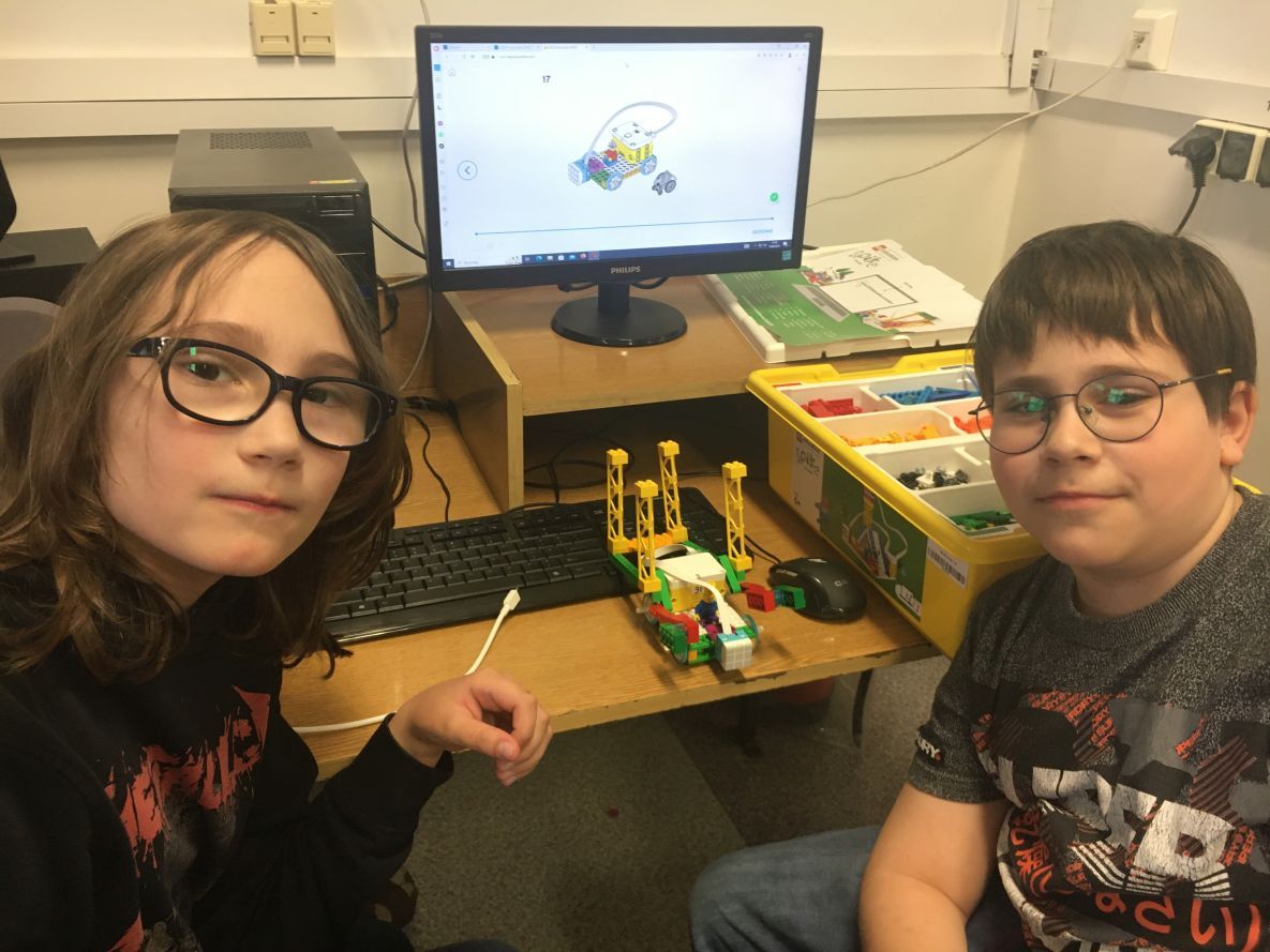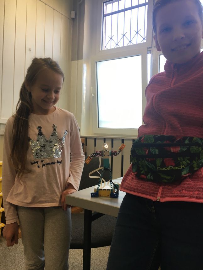 Na lekcjach informatyki w klasach czwartych i piątych zorganizowaliśmy wyścigi skoczków Lego Spike Prime. Po zbudowaniu skoczka według instrukcji, wprawieniu go w ruch i wypróbowaniu jego możliwości w wyścigu, nastąpiło tworzenie prototypu nowych odnóży, aby skoczek posuwał się naprzód szybciej.