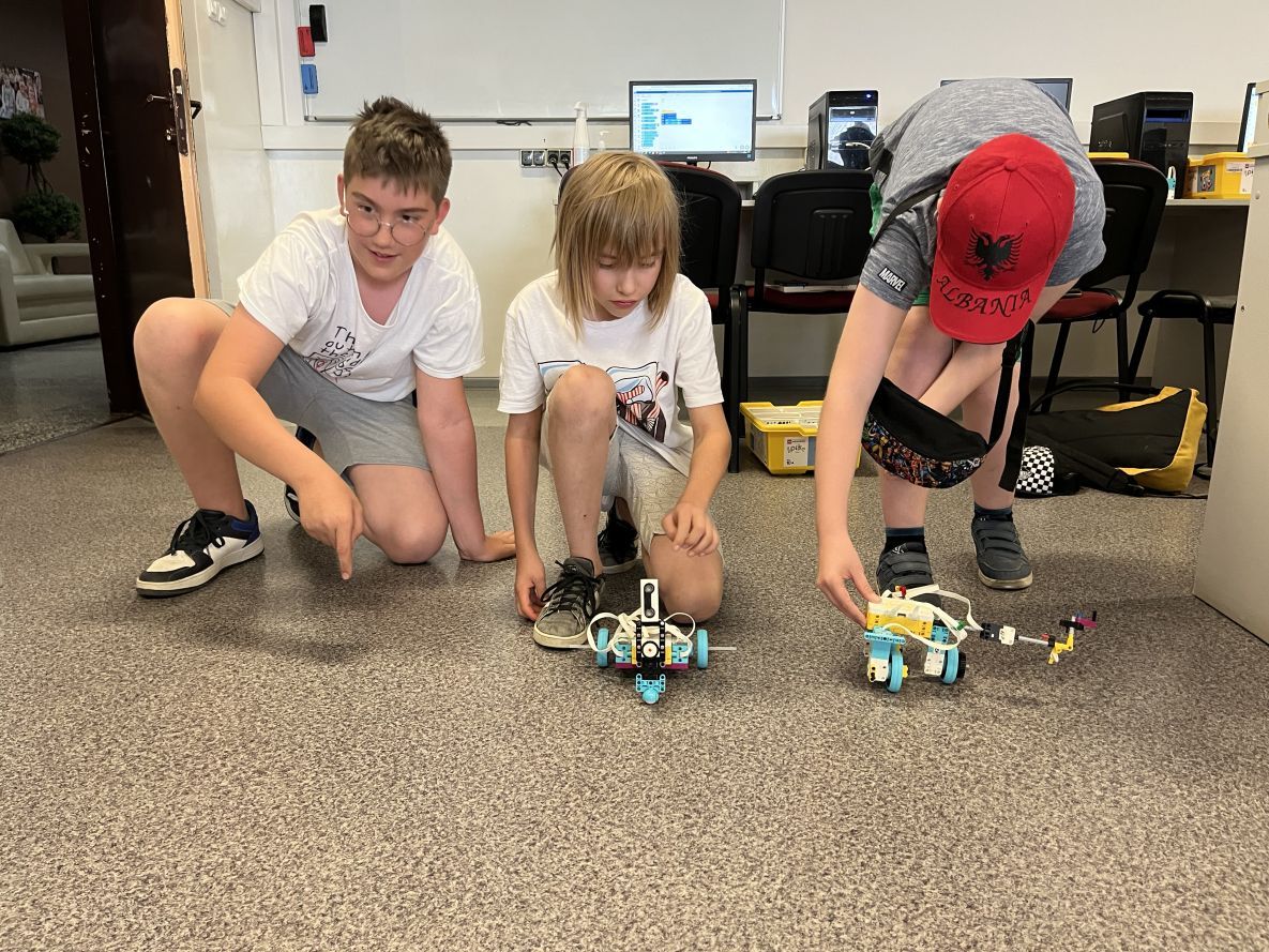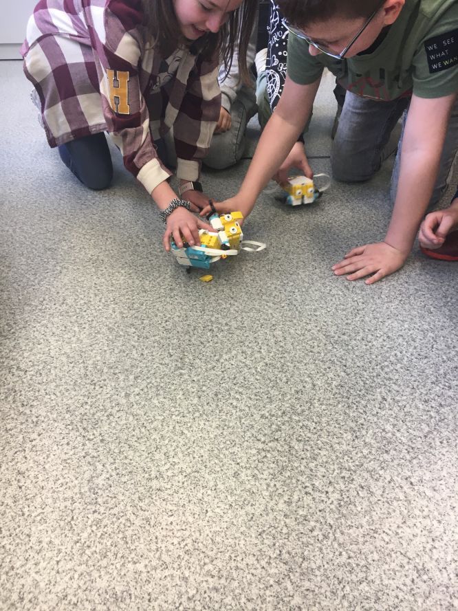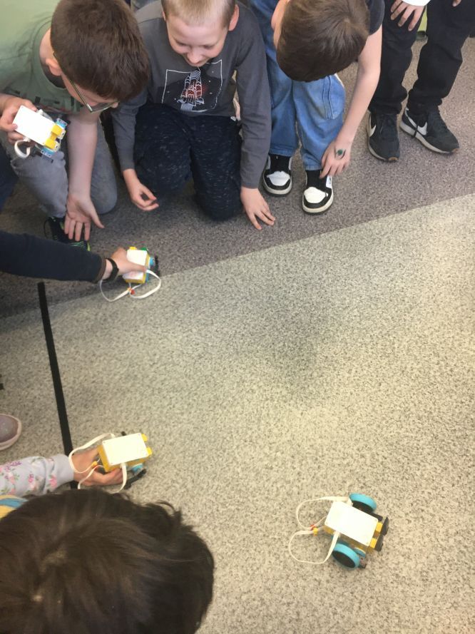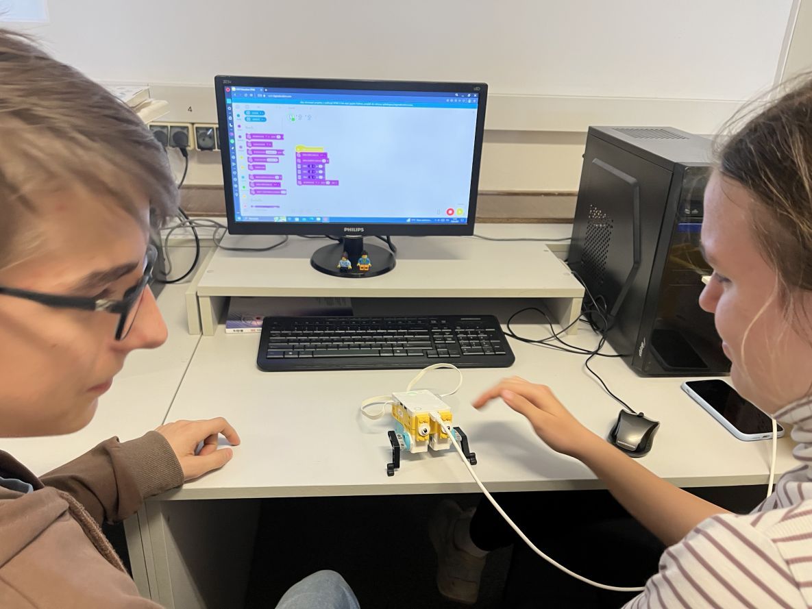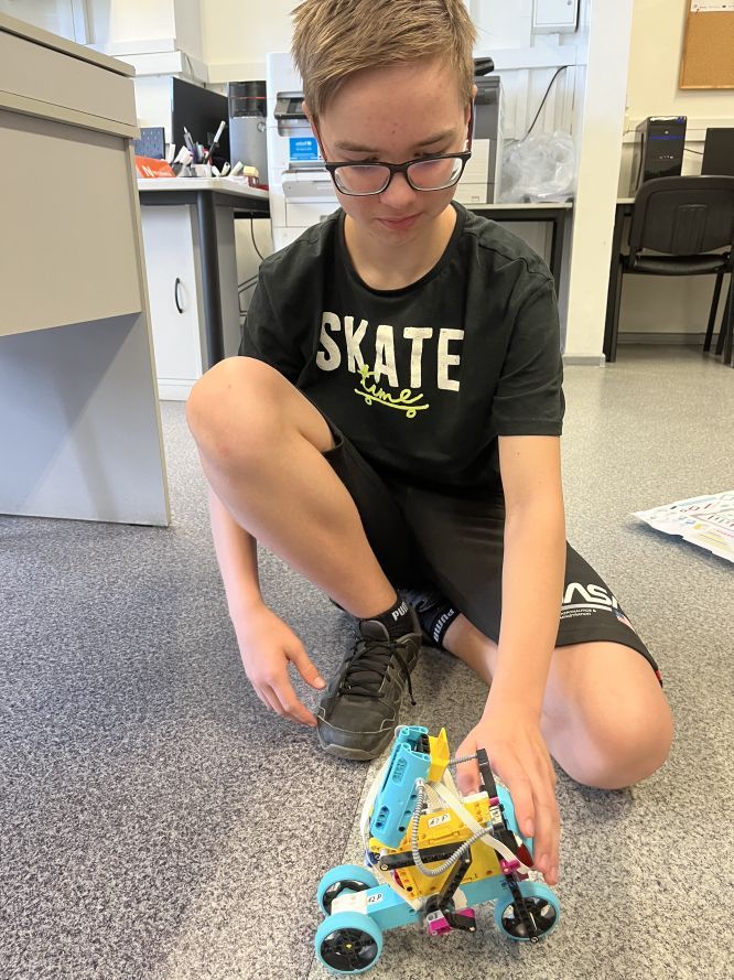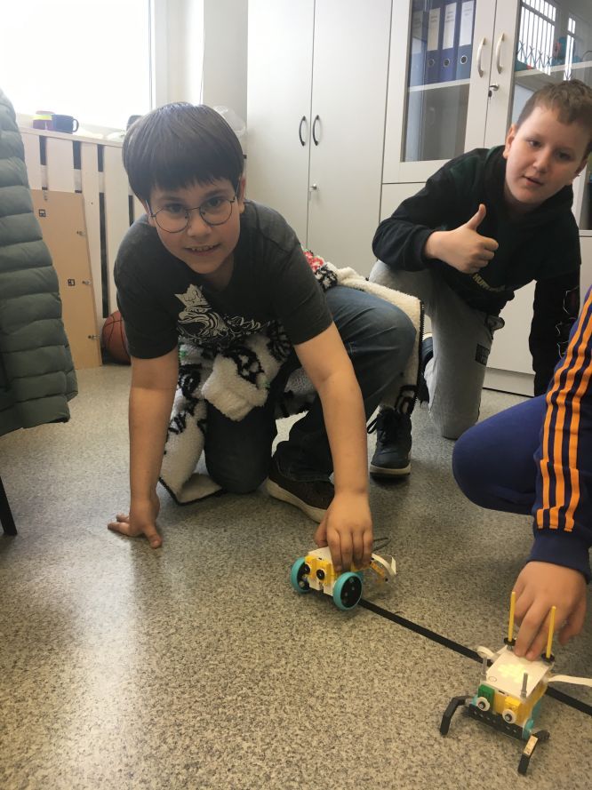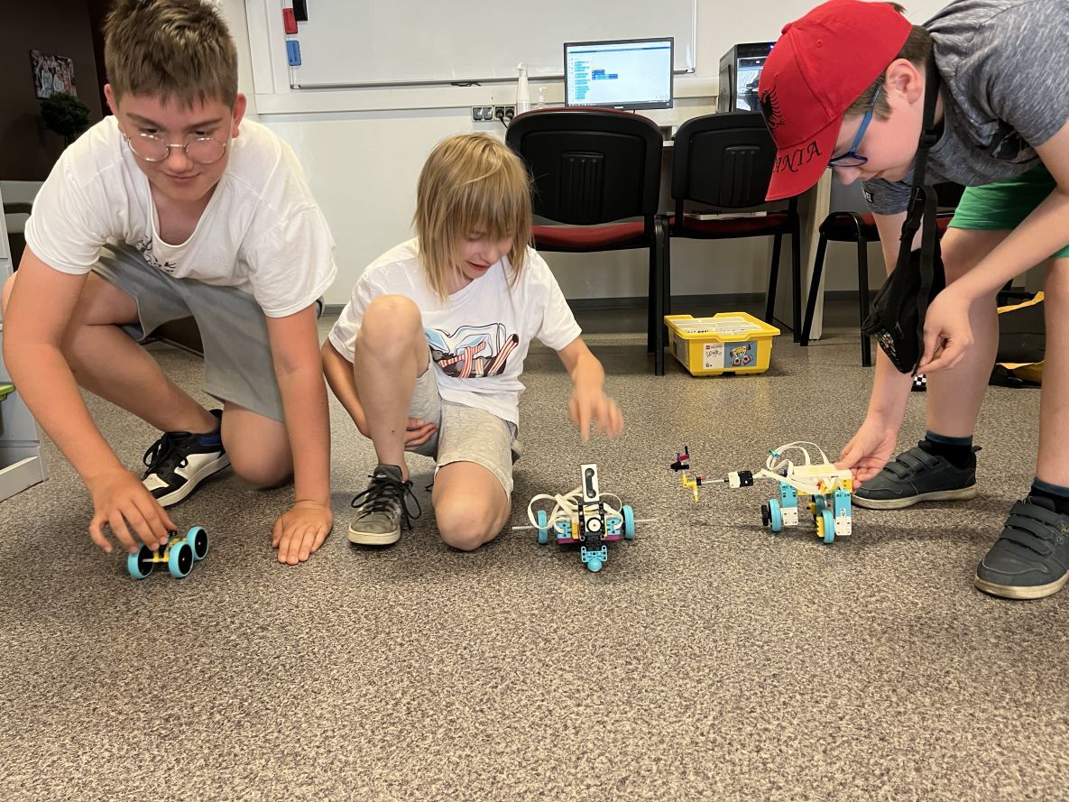 Na lekcjach informatyki w klasach czwartych i piątych zorganizowaliśmy wyścigi skoczków Lego Spike Prime. Po zbudowaniu skoczka według instrukcji, wprawieniu go w ruch i wypróbowaniu jego możliwości w wyścigu, nastąpiło tworzenie prototypu nowych odnóży, aby skoczek posuwał się naprzód szybciej.