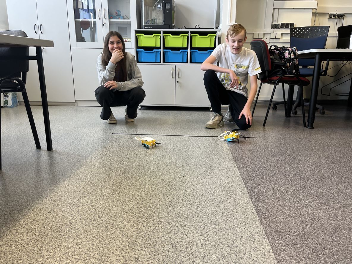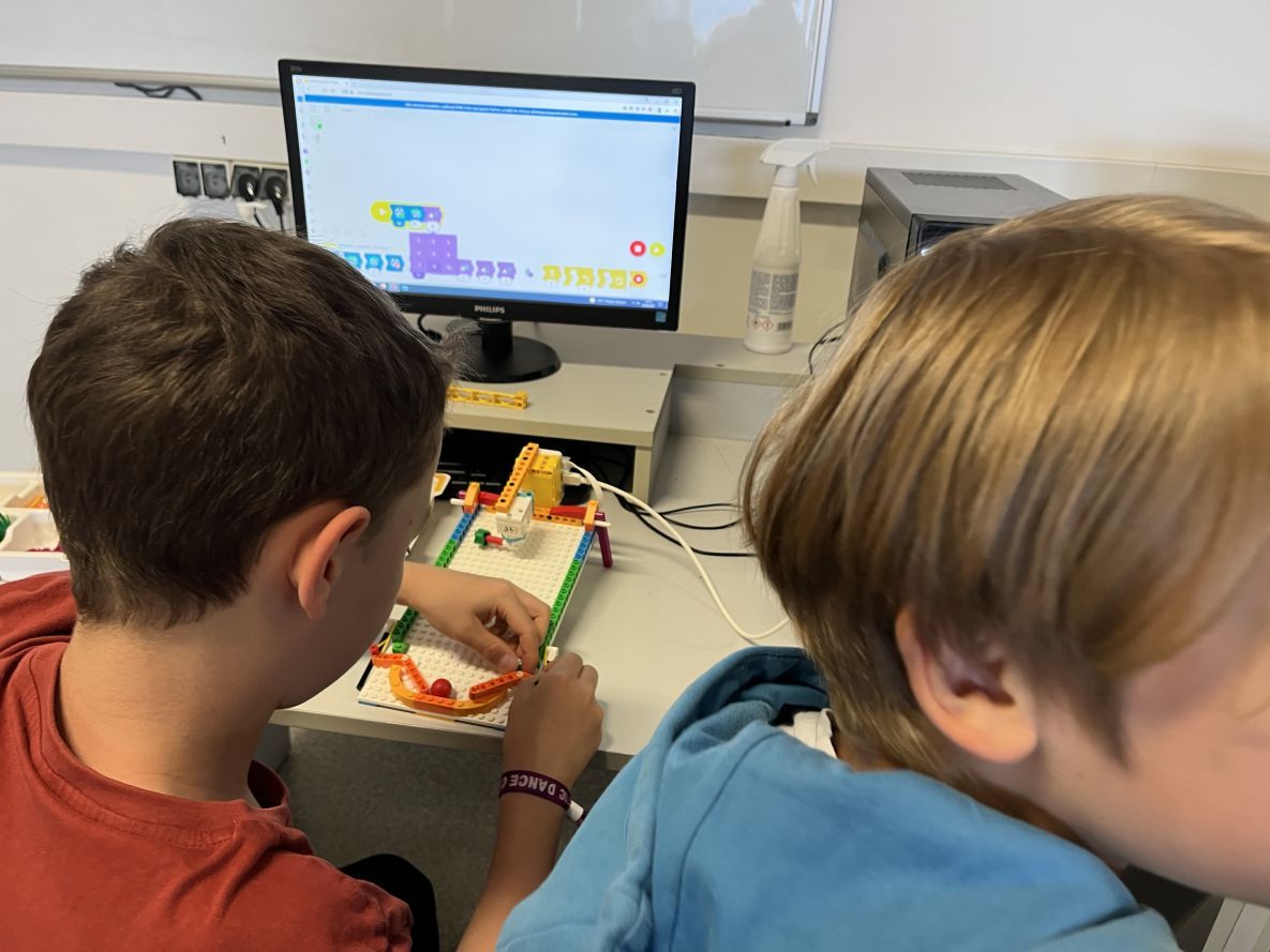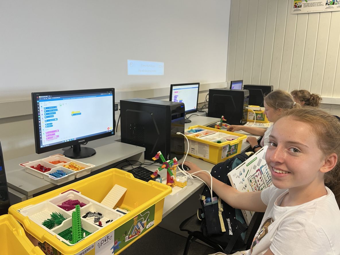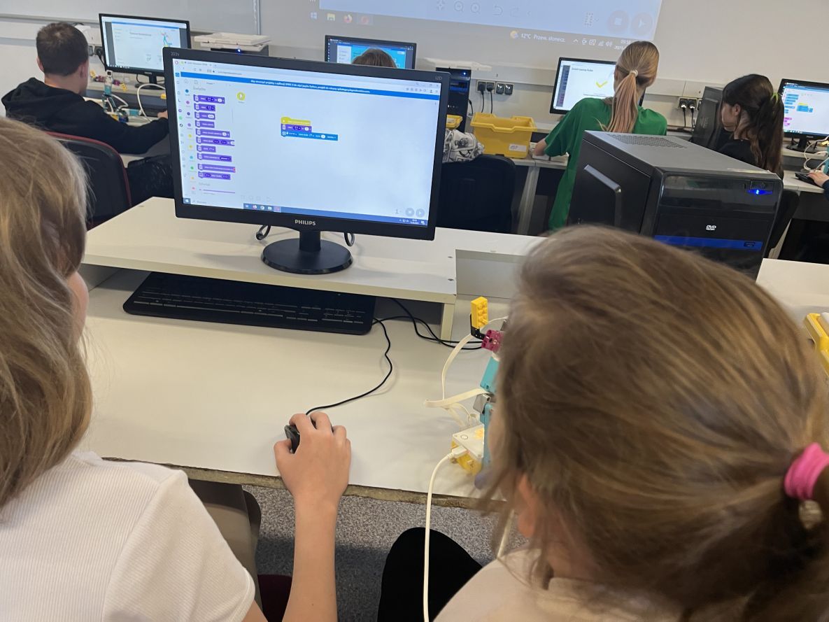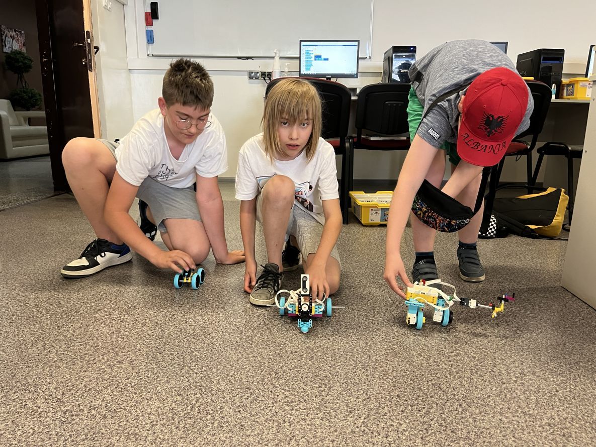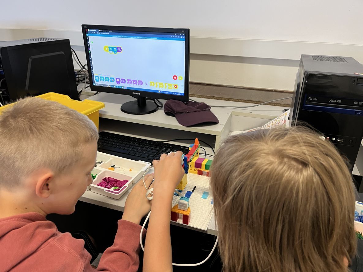 Na lekcjach informatyki w klasach czwartych i piątych zorganizowaliśmy wyścigi skoczków Lego Spike Prime. Po zbudowaniu skoczka według instrukcji, wprawieniu go w ruch i wypróbowaniu jego możliwości w wyścigu, nastąpiło tworzenie prototypu nowych odnóży, aby skoczek posuwał się naprzód szybciej.