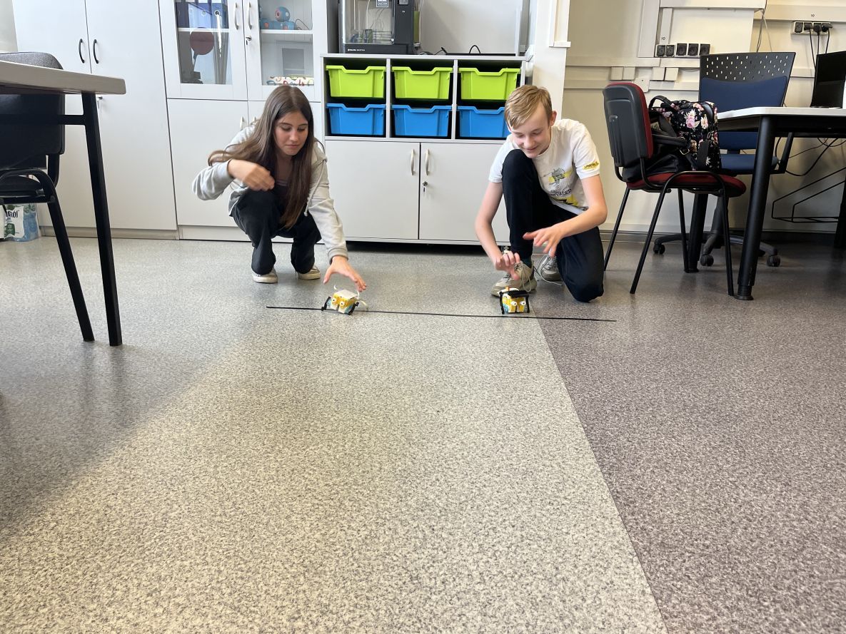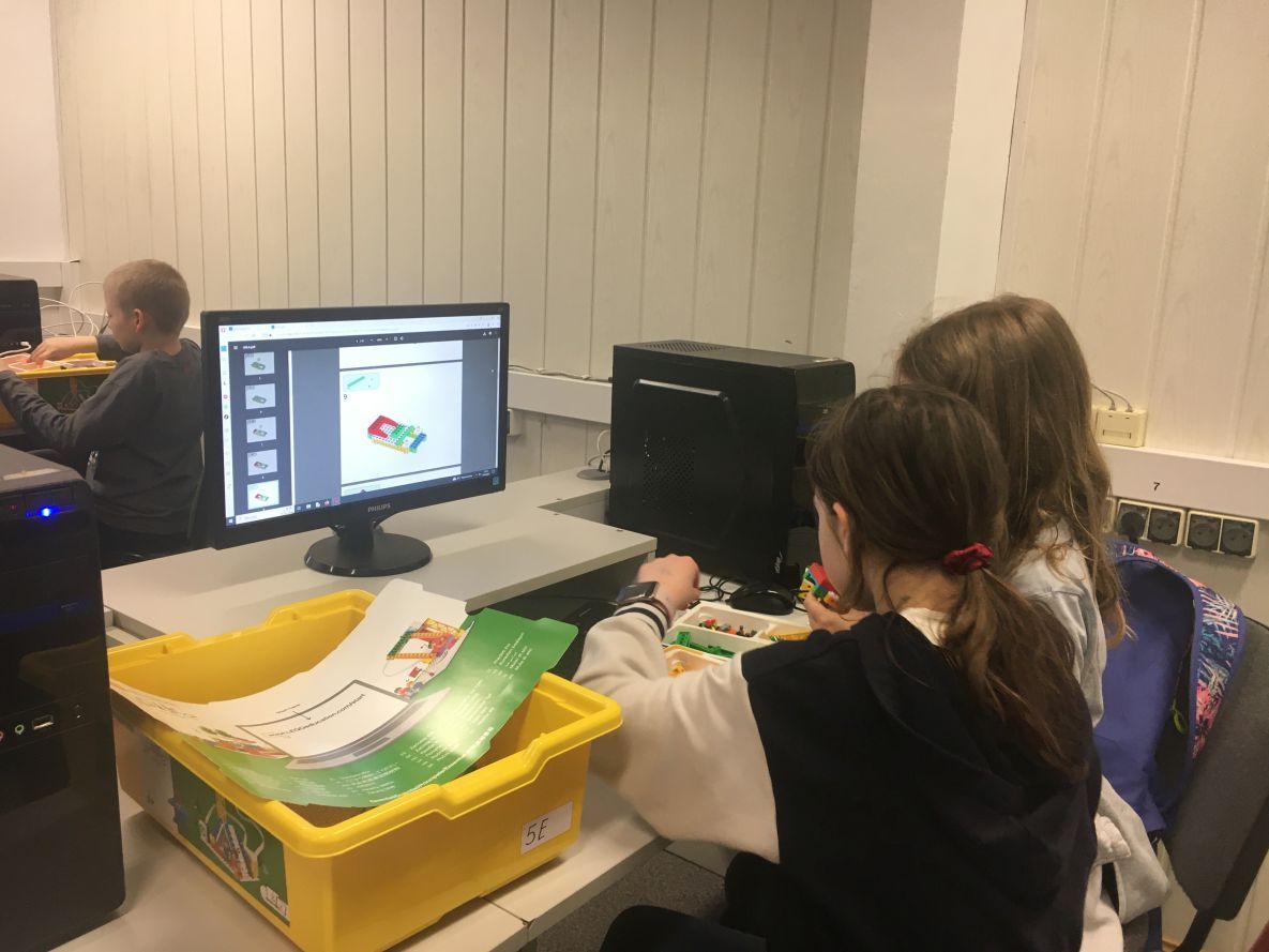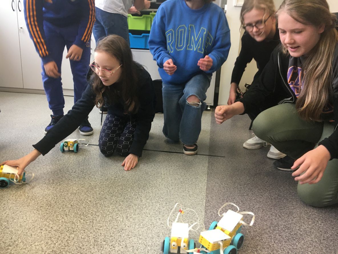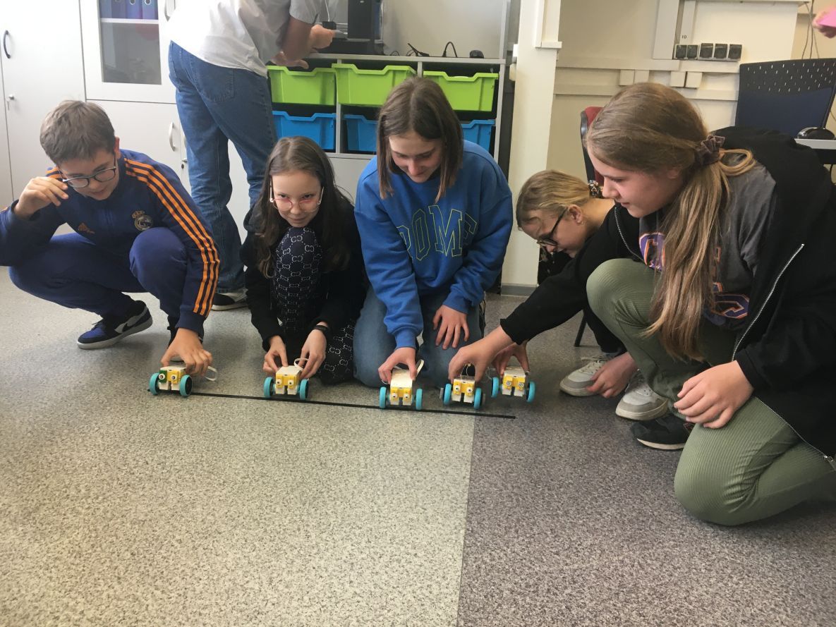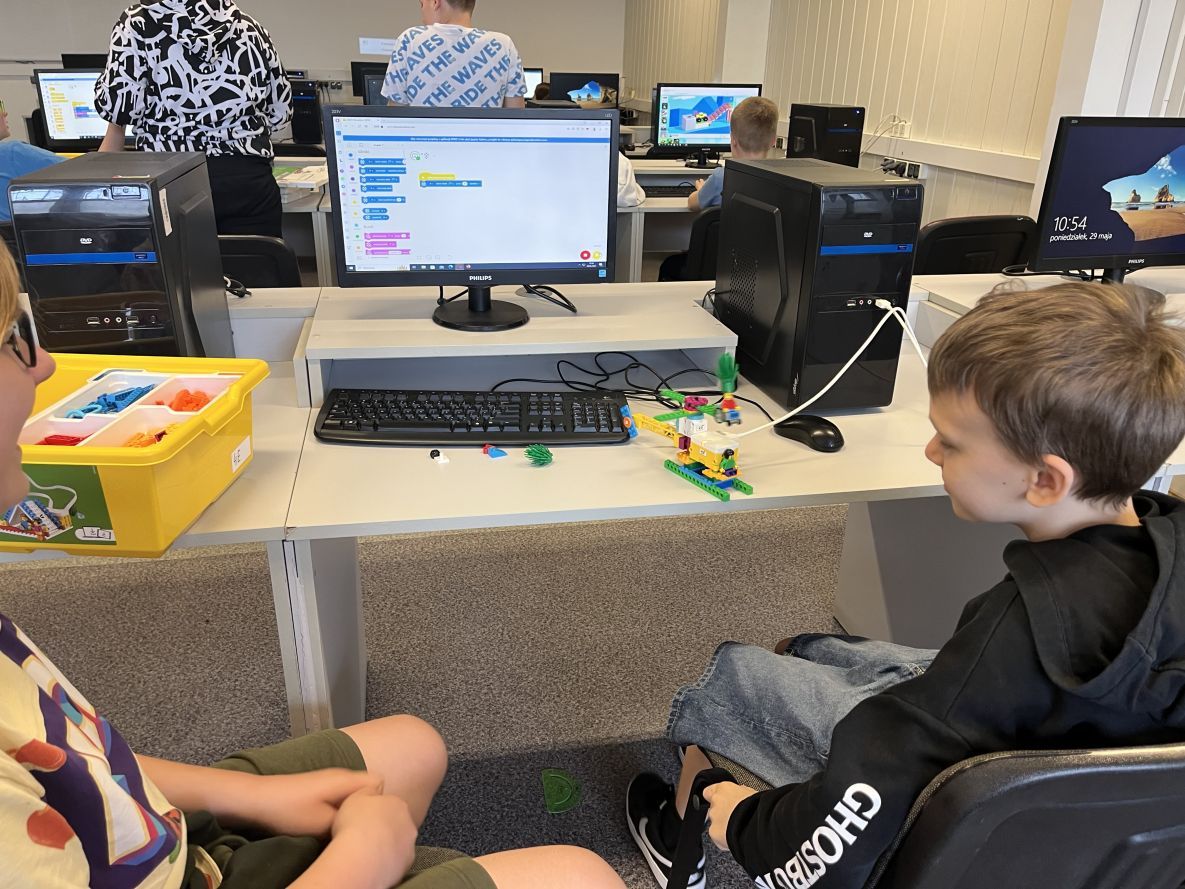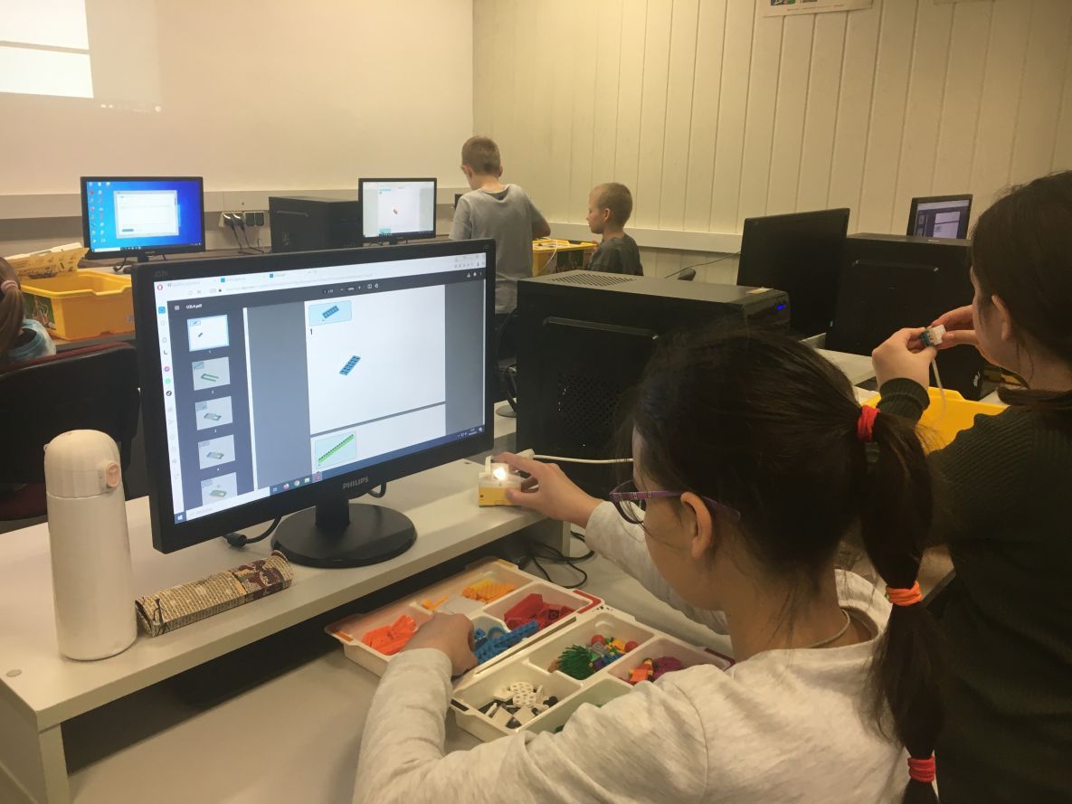 Na lekcjach informatyki w klasach czwartych i piątych zorganizowaliśmy wyścigi skoczków Lego Spike Prime. Po zbudowaniu skoczka według instrukcji, wprawieniu go w ruch i wypróbowaniu jego możliwości w wyścigu, nastąpiło tworzenie prototypu nowych odnóży, aby skoczek posuwał się naprzód szybciej.