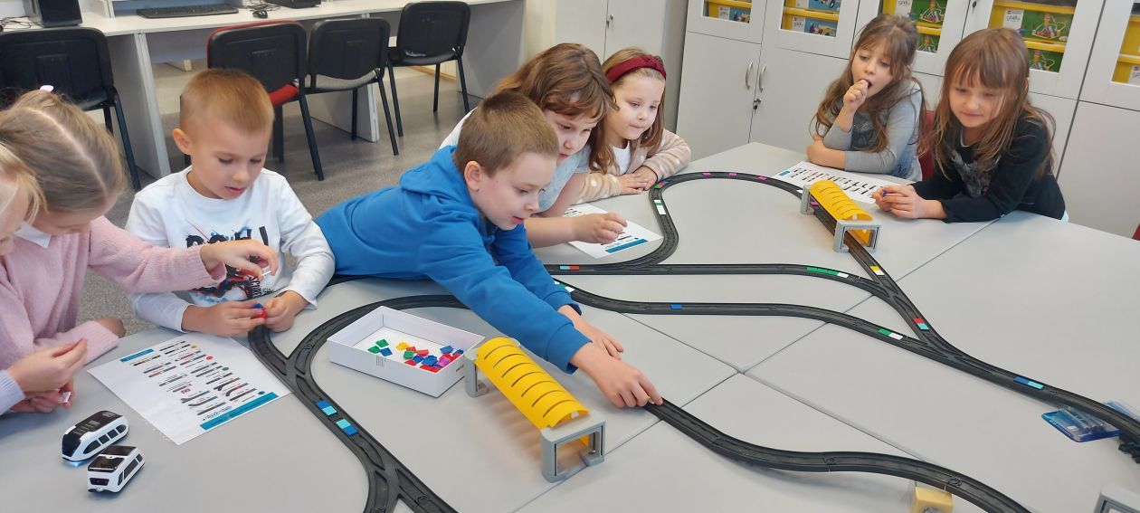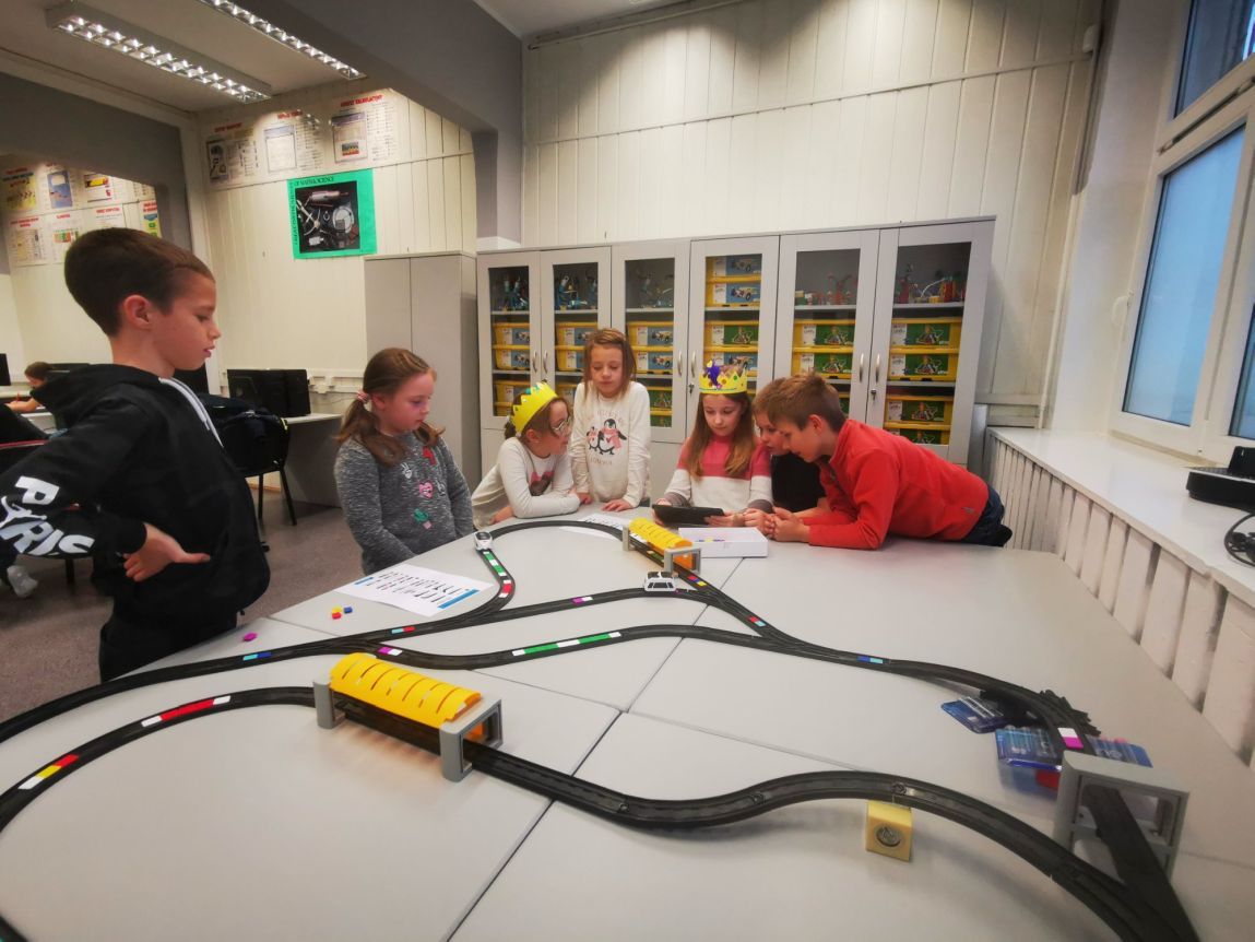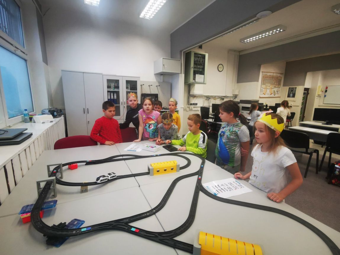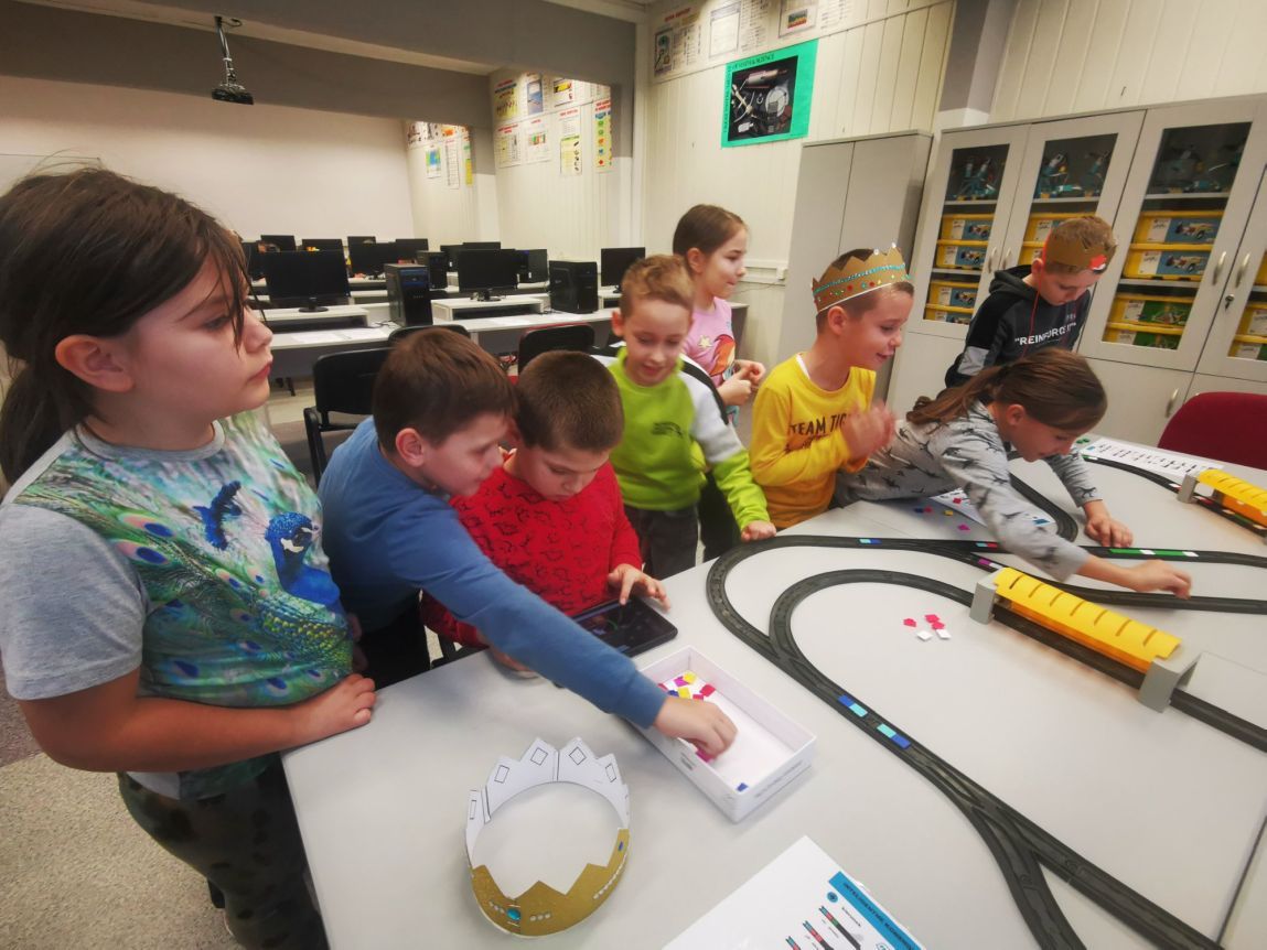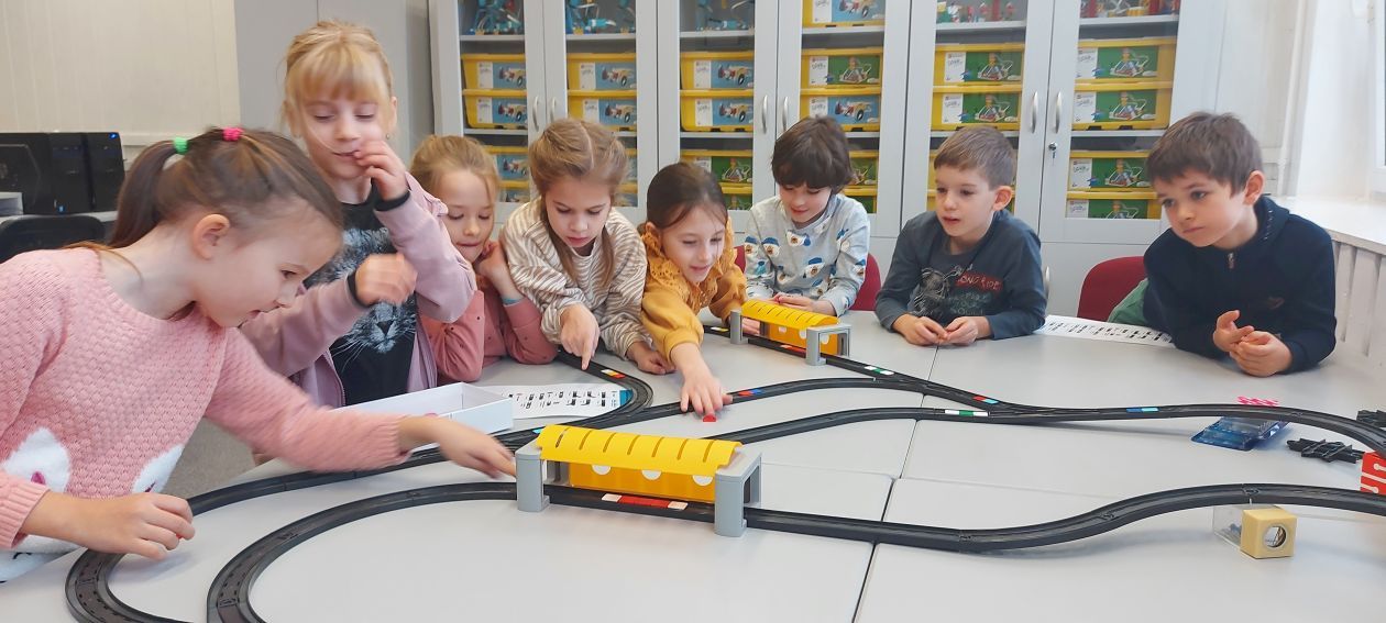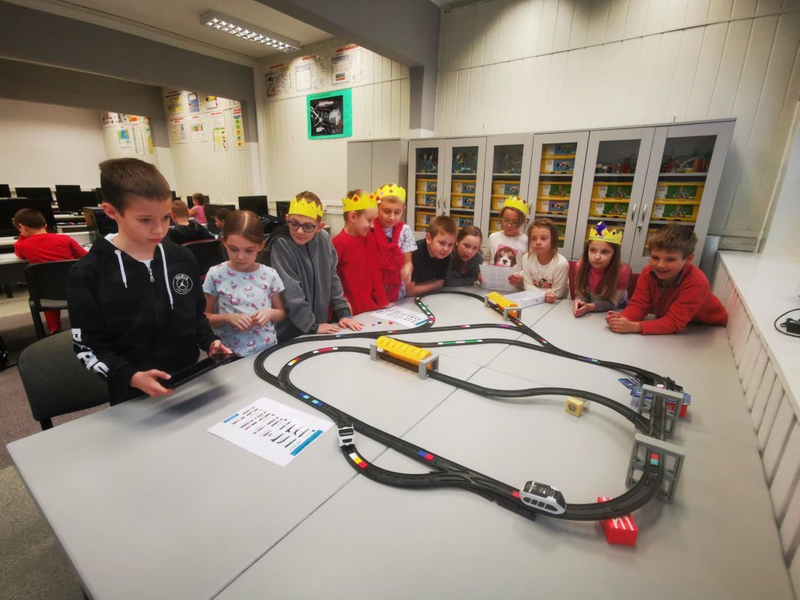 Uczniowie klas 1b, 1d, 2b, 2d, 3b i 3c w listopadzie odwiedzili szkolną pracownię informatyczną i wzięli udział w cyklu lekcji kodowania z inteligentnym pociągiem INTELINO. Pociąg wykorzystuje najnowszą technologię w dziedzinie robotyki, dzięki czemu można sterować nim zdalnie za pośrednictwem aplikacji. Uczniowie uczyli się programowania w zabawnej grze i wykorzystywali nowoczesne technologie w praktyce. Dodatkowo dzieci zapoznały się z robotami DASH , CUE i tancerzem LEGO SPIKE PRIME.