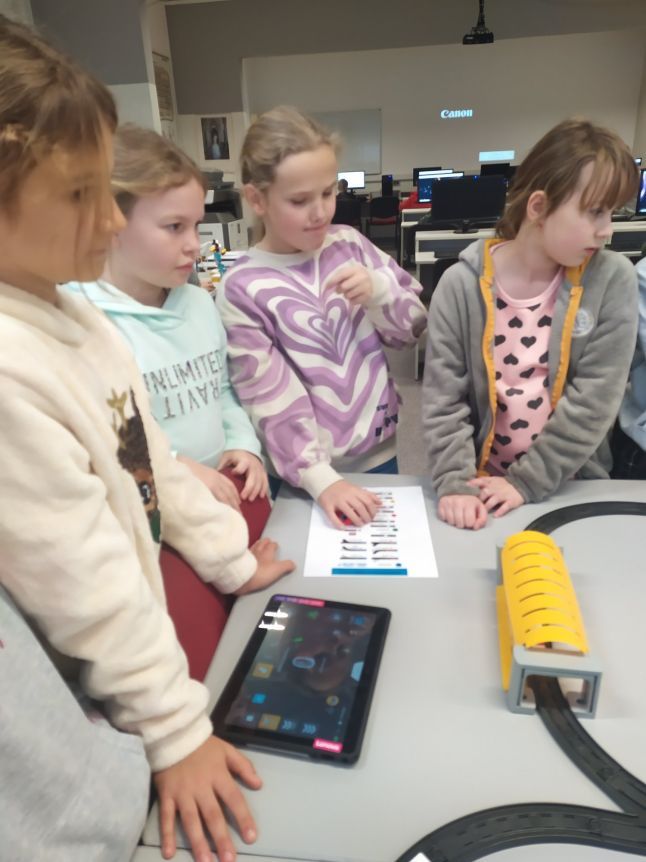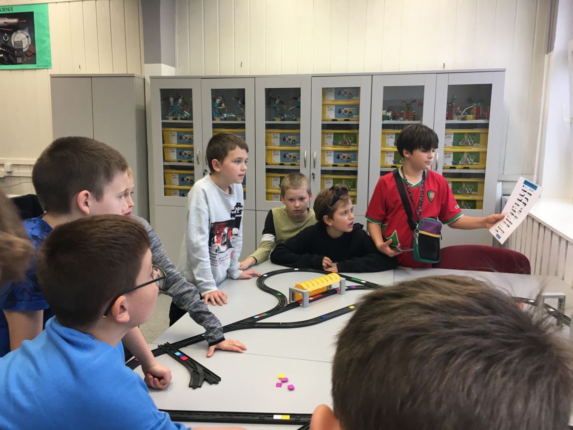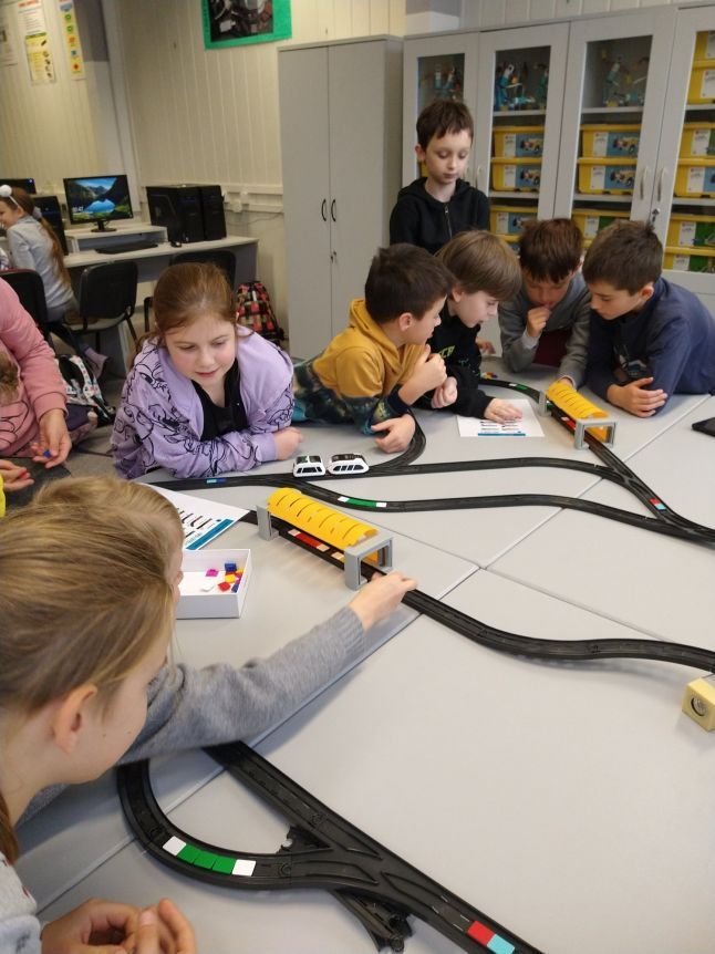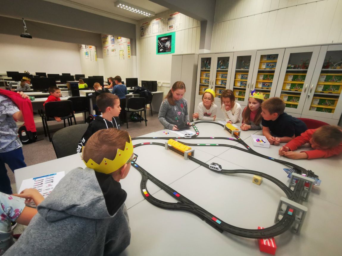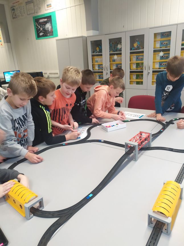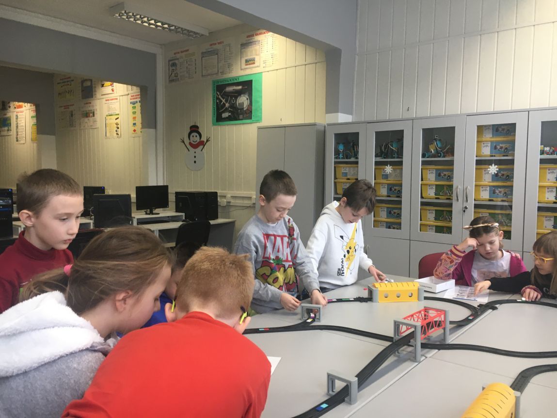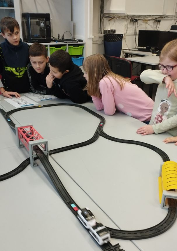 Uczniowie klas 1b, 1d, 2b, 2d, 3b i 3c w listopadzie odwiedzili szkolną pracownię informatyczną i wzięli udział w cyklu lekcji kodowania z inteligentnym pociągiem INTELINO. Pociąg wykorzystuje najnowszą technologię w dziedzinie robotyki, dzięki czemu można sterować nim zdalnie za pośrednictwem aplikacji. Uczniowie uczyli się programowania w zabawnej grze i wykorzystywali nowoczesne technologie w praktyce. Dodatkowo dzieci zapoznały się z robotami DASH , CUE i tancerzem LEGO SPIKE PRIME.