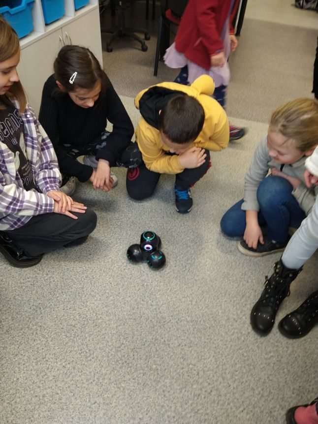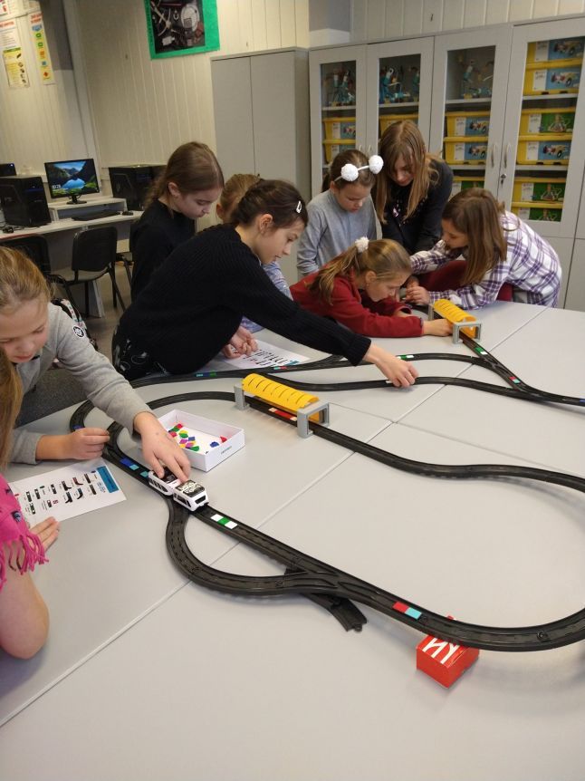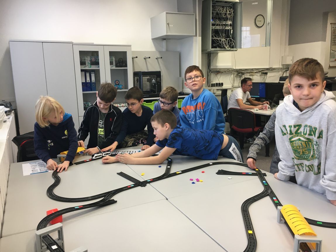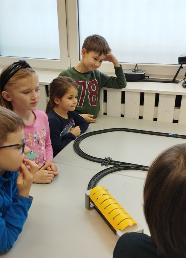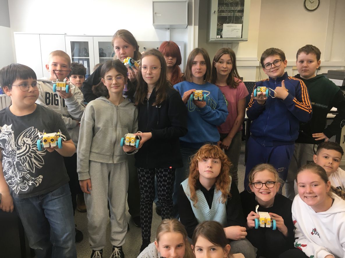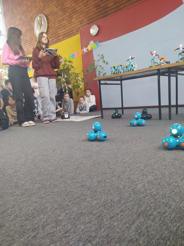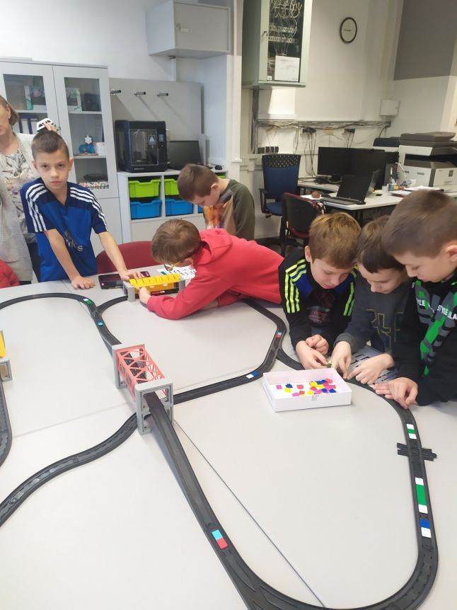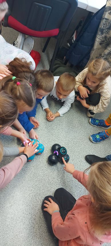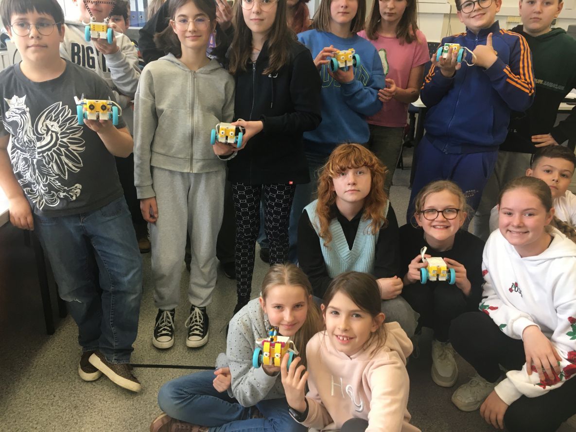 Uczniowie klas 1b, 1d, 2b, 2d, 3b i 3c w listopadzie odwiedzili szkolną pracownię informatyczną i wzięli udział w cyklu lekcji kodowania z inteligentnym pociągiem INTELINO. Pociąg wykorzystuje najnowszą technologię w dziedzinie robotyki, dzięki czemu można sterować nim zdalnie za pośrednictwem aplikacji. Uczniowie uczyli się programowania w zabawnej grze i wykorzystywali nowoczesne technologie w praktyce. Dodatkowo dzieci zapoznały się z robotami DASH , CUE i tancerzem LEGO SPIKE PRIME.