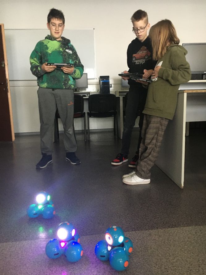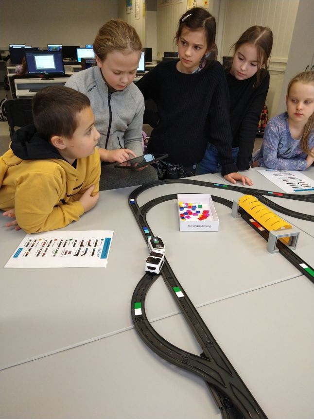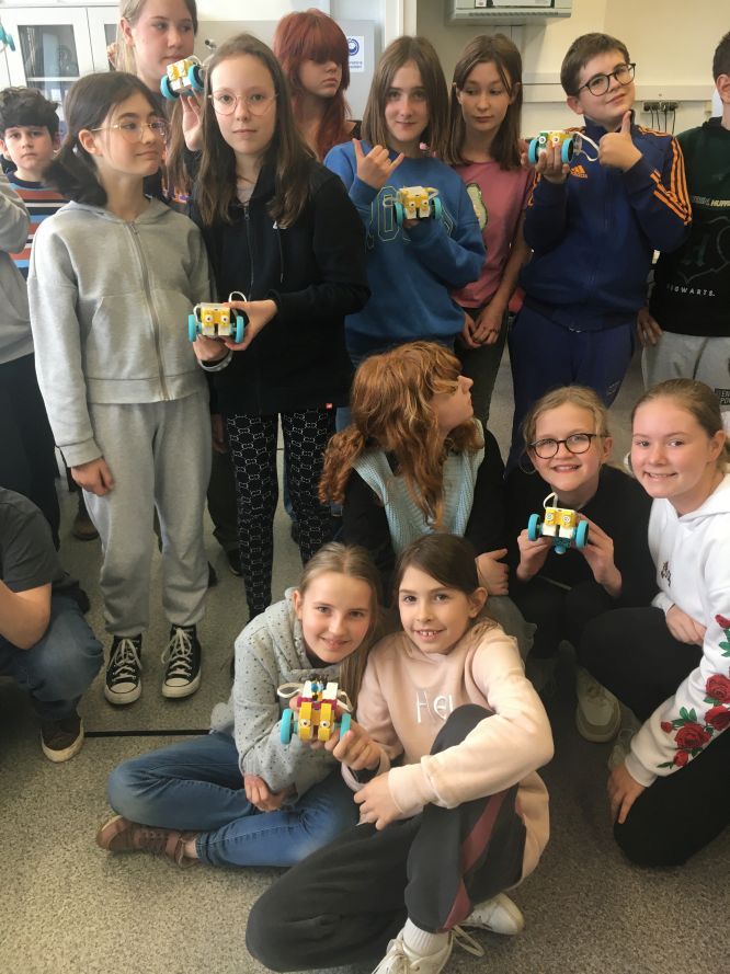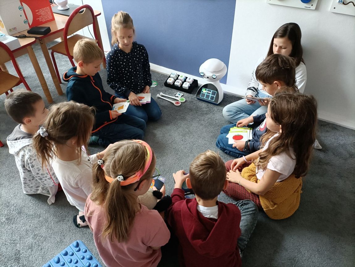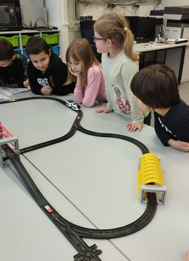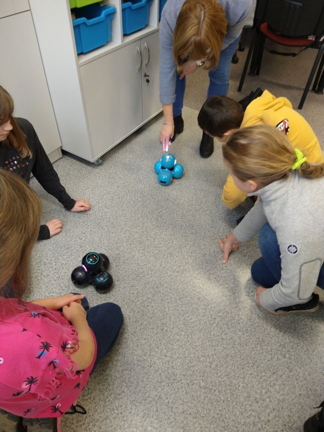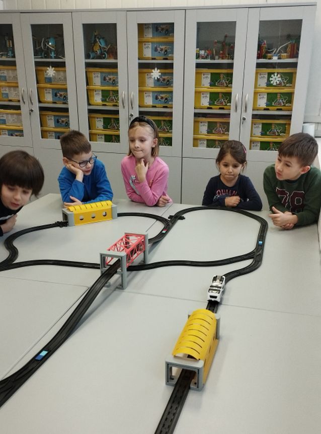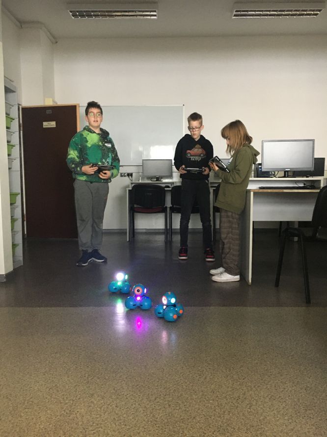 Uczniowie klas 1b, 1d, 2b, 2d, 3b i 3c w listopadzie odwiedzili szkolną pracownię informatyczną i wzięli udział w cyklu lekcji kodowania z inteligentnym pociągiem INTELINO. Pociąg wykorzystuje najnowszą technologię w dziedzinie robotyki, dzięki czemu można sterować nim zdalnie za pośrednictwem aplikacji. Uczniowie uczyli się programowania w zabawnej grze i wykorzystywali nowoczesne technologie w praktyce. Dodatkowo dzieci zapoznały się z robotami DASH , CUE i tancerzem LEGO SPIKE PRIME.