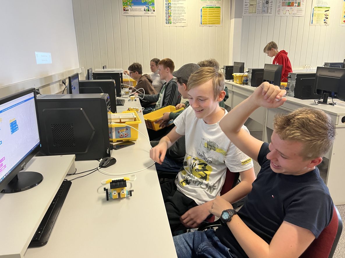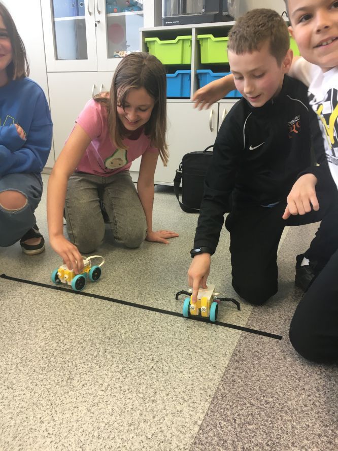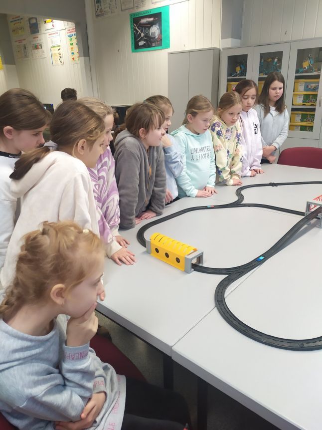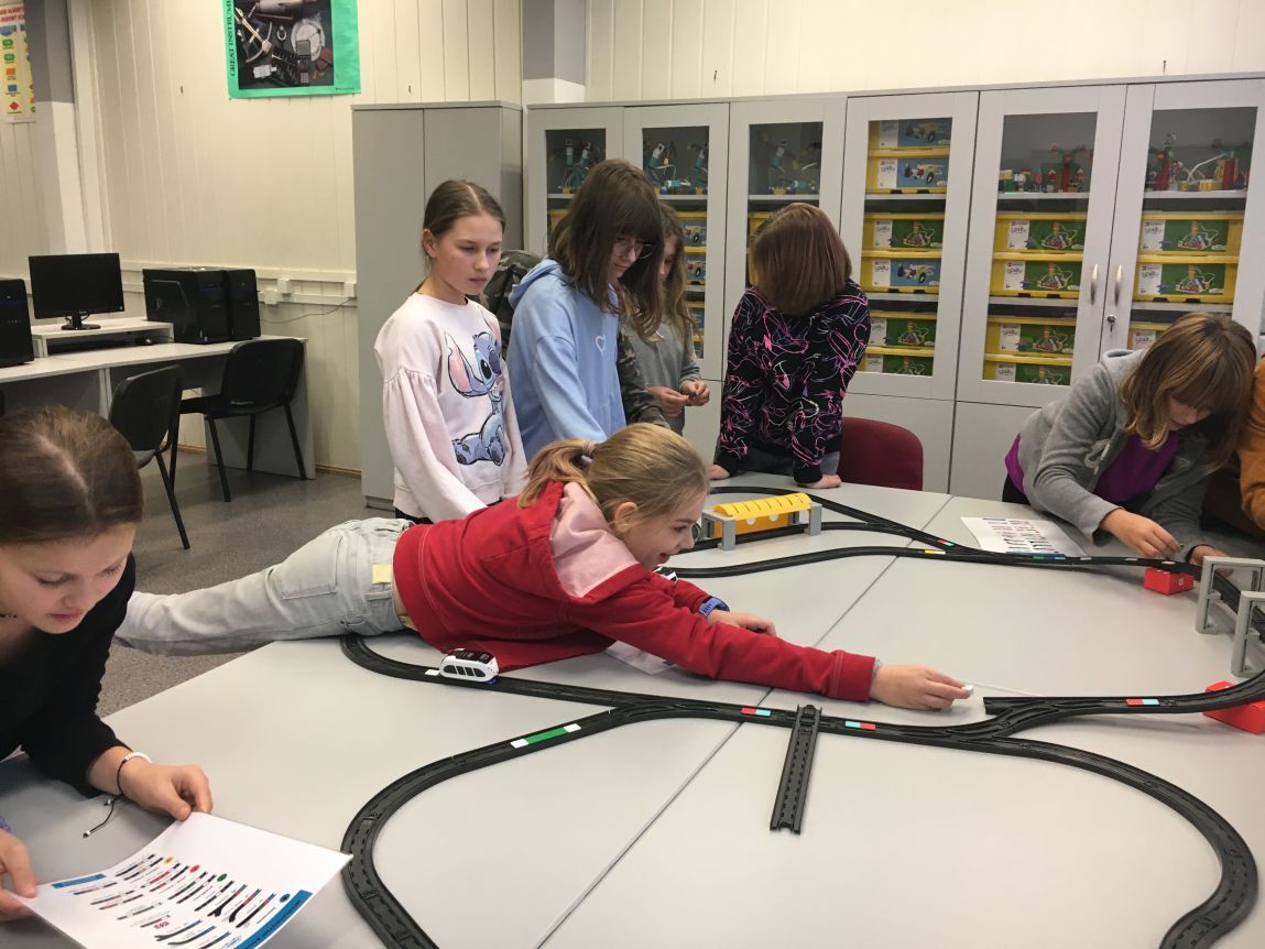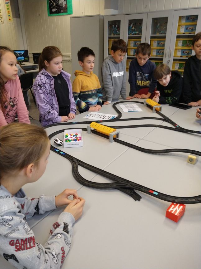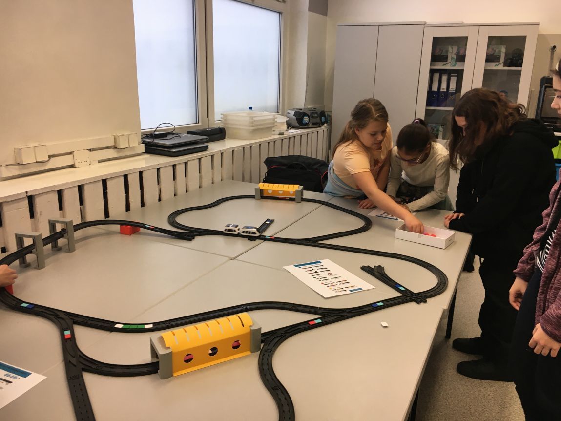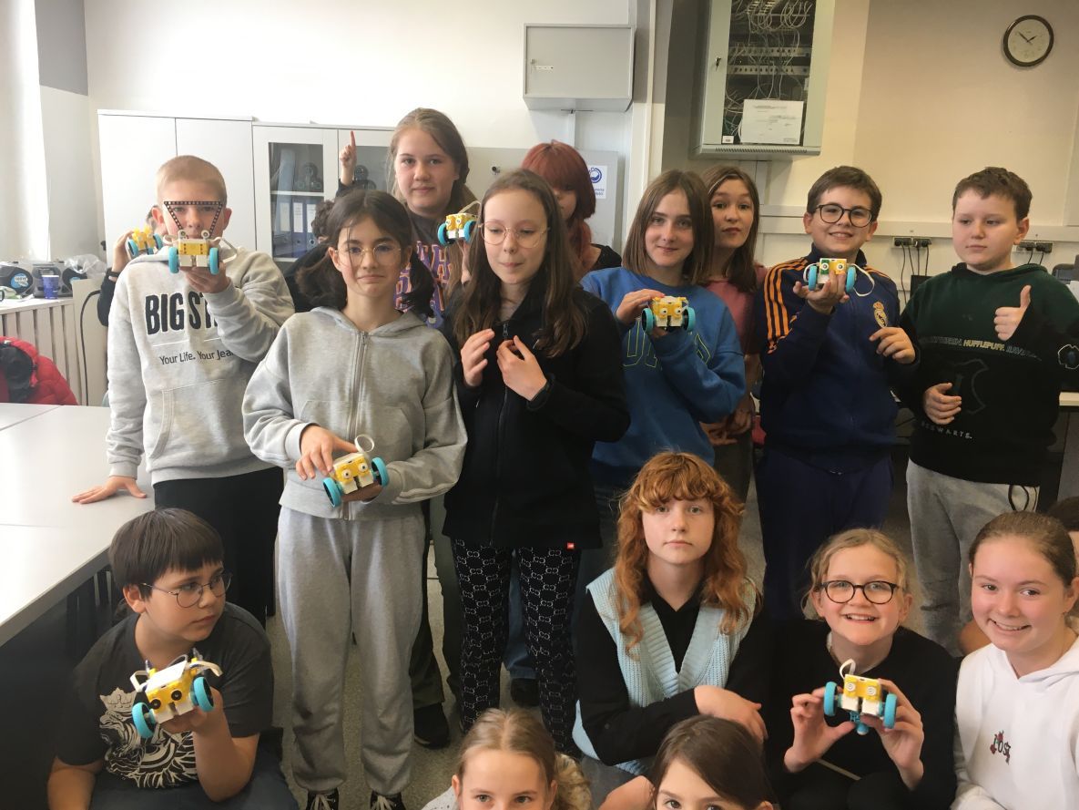 Uczniowie klas 1b, 1d, 2b, 2d, 3b i 3c w listopadzie odwiedzili szkolną pracownię informatyczną i wzięli udział w cyklu lekcji kodowania z inteligentnym pociągiem INTELINO. Pociąg wykorzystuje najnowszą technologię w dziedzinie robotyki, dzięki czemu można sterować nim zdalnie za pośrednictwem aplikacji. Uczniowie uczyli się programowania w zabawnej grze i wykorzystywali nowoczesne technologie w praktyce. Dodatkowo dzieci zapoznały się z robotami DASH , CUE i tancerzem LEGO SPIKE PRIME.