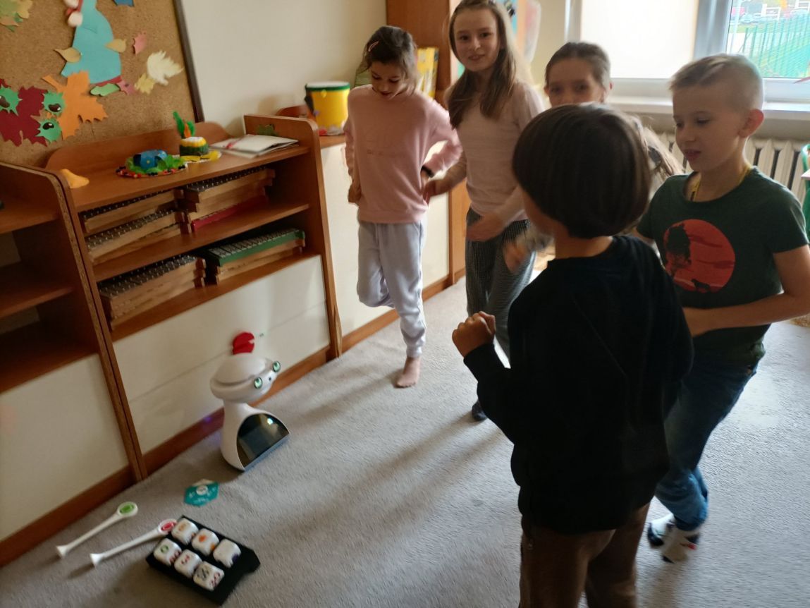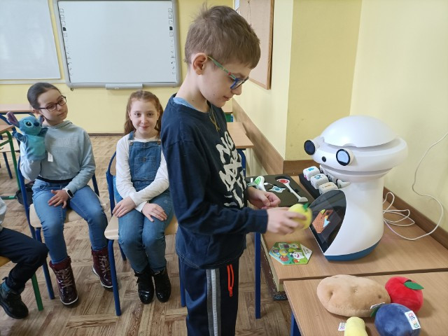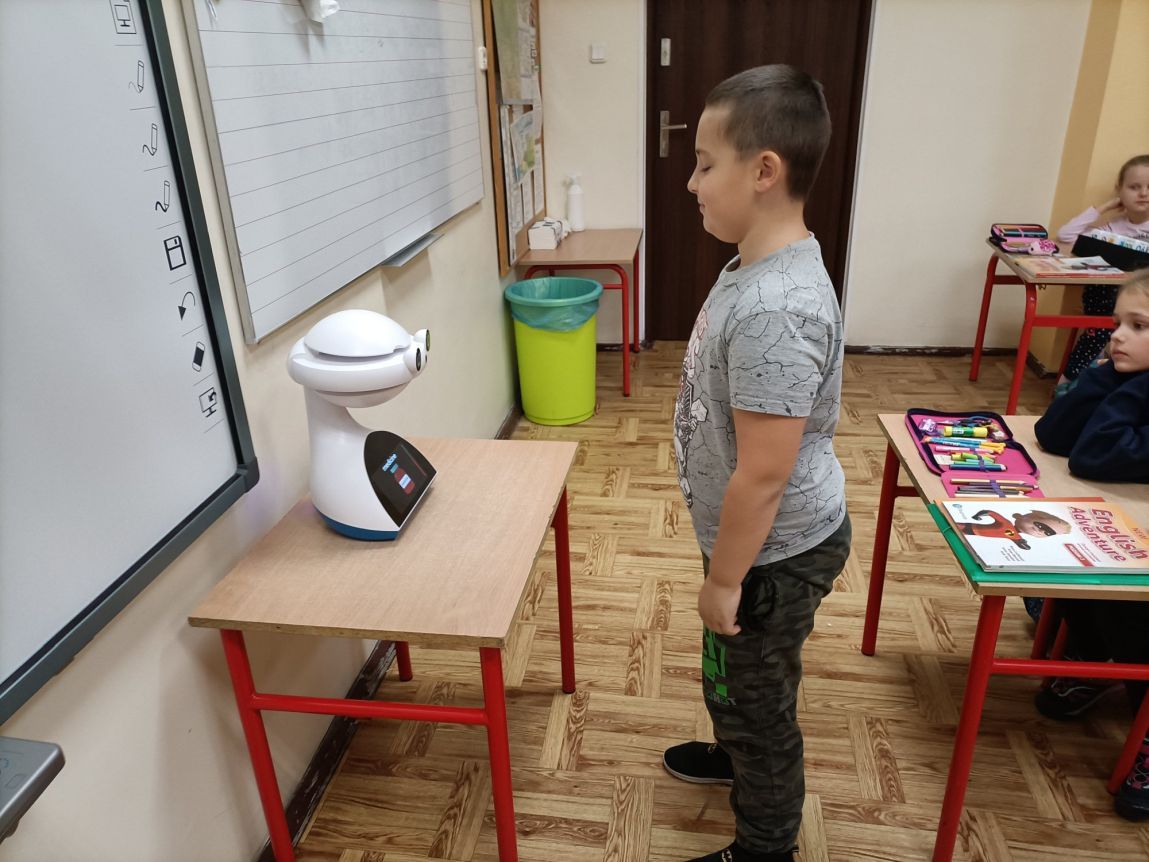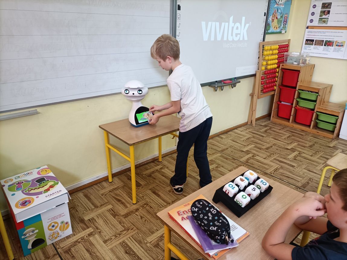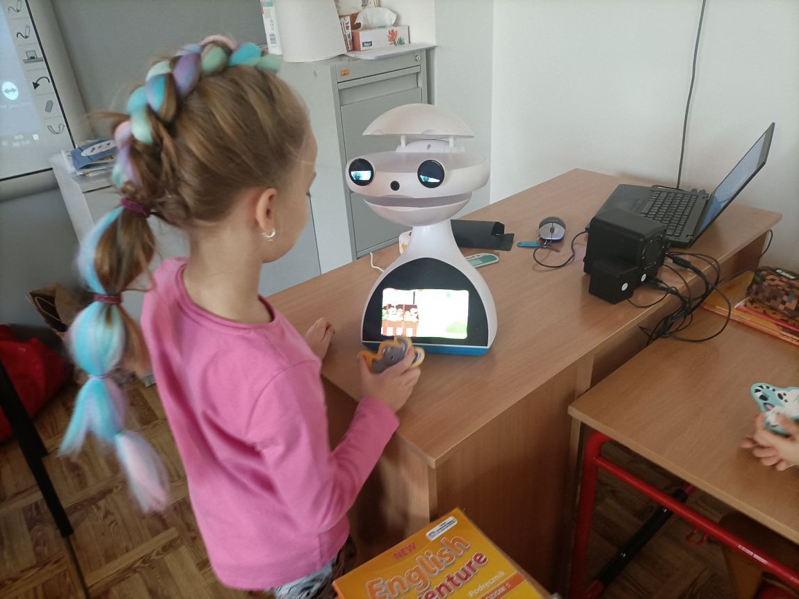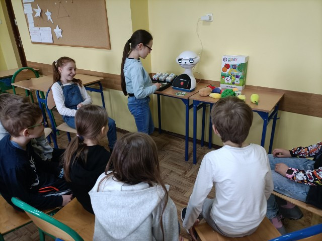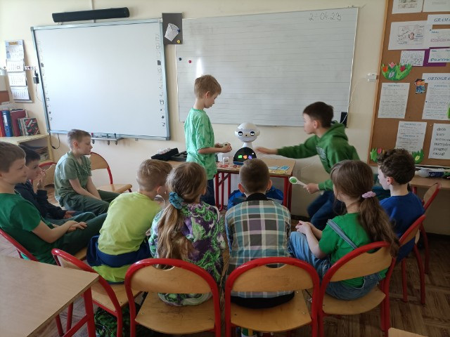 Uczniowie klas 1-3 często na lekcjach języka angielskiego spotykali się z anglojęzycznym robotem edukacyjnym EMYS. Rozwiązywali interaktywne zadania, grali w gry, słuchali piosenek i historyjek oraz uczestniczyli w zabawach ruchowych.