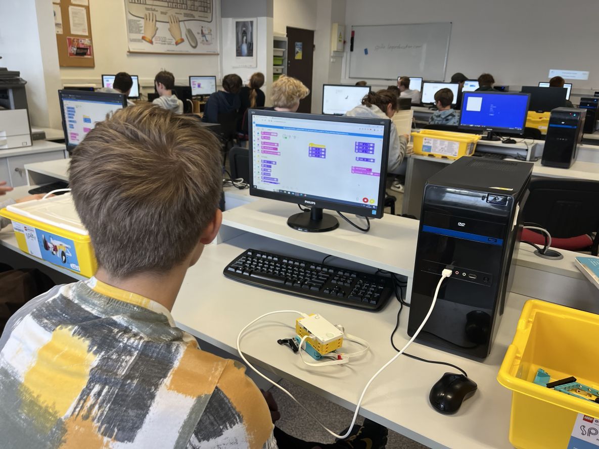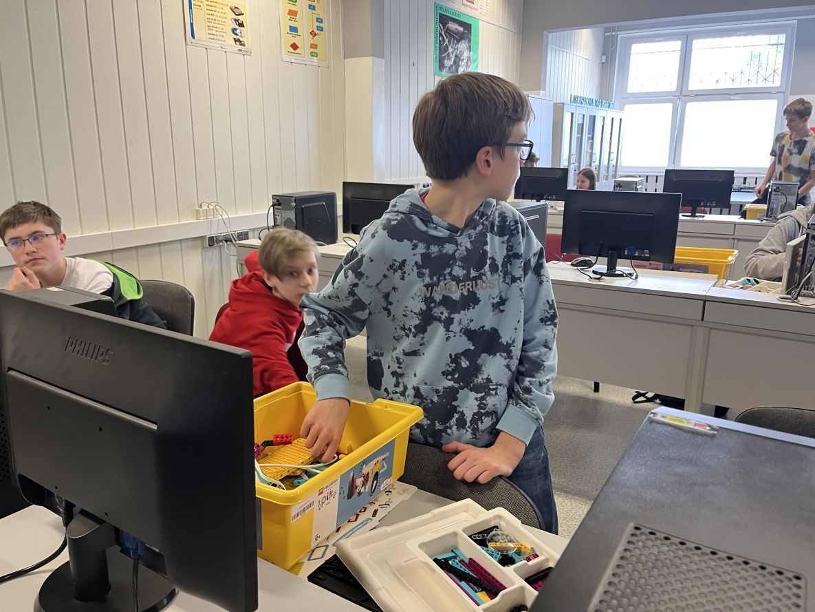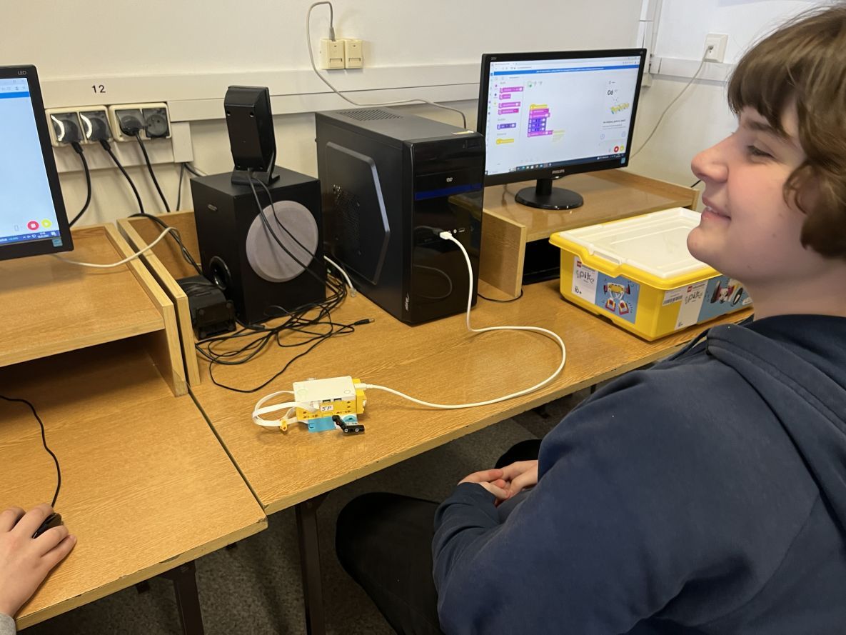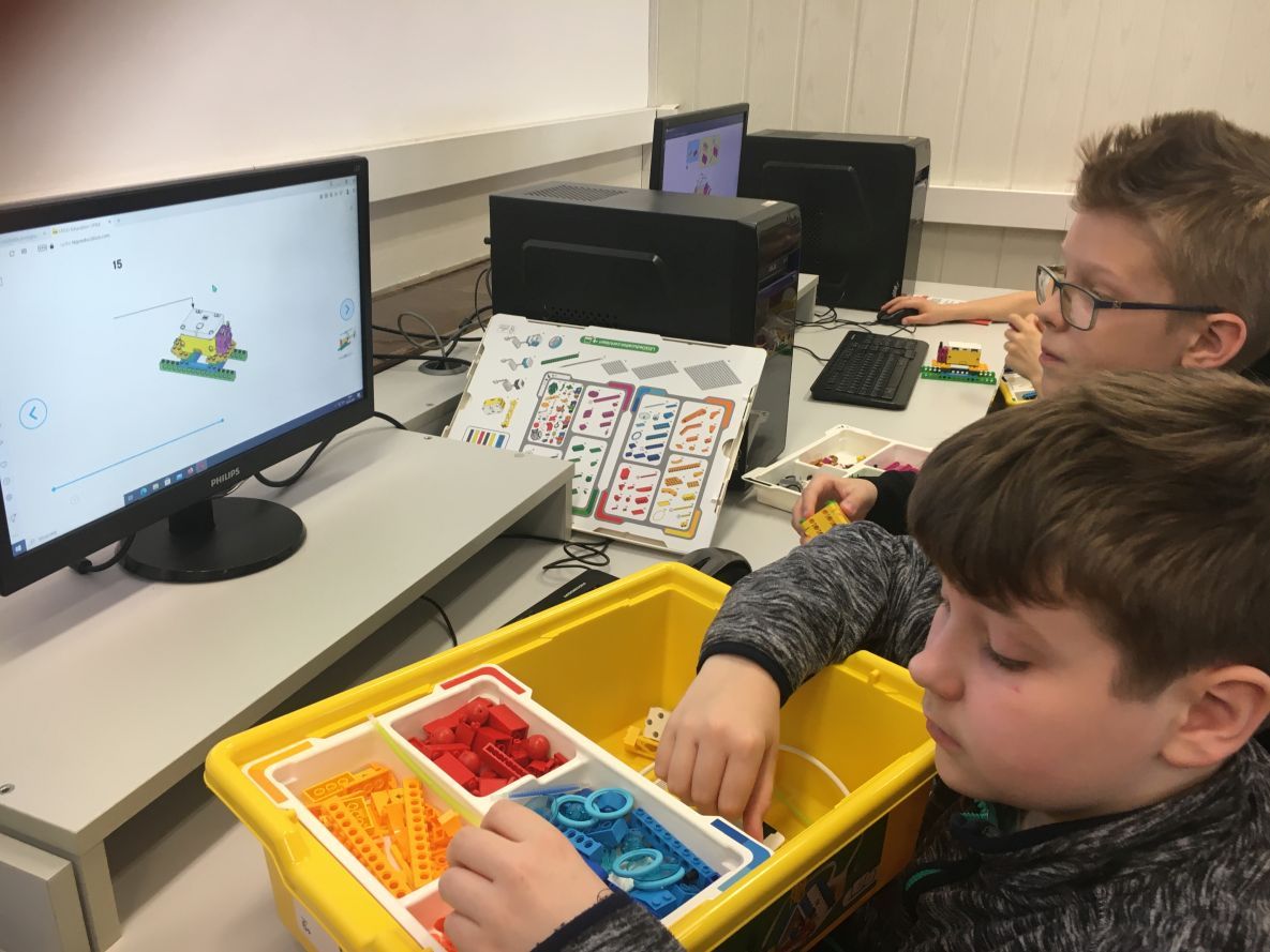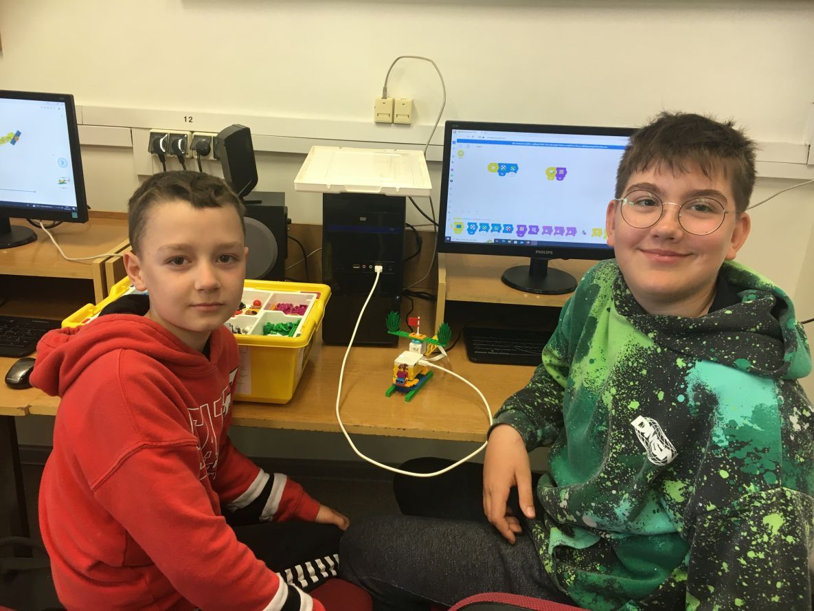W klasie szóstej na lekcji informatyki chłopcy realizowali dowolne projekty Lego Spike Prime.
