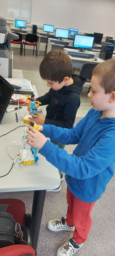 Na zajęciach robotyki chłopcy budowali własne modele z klocków Lego Spike Prime. Bez instrukcji, własne projekty, twórcze rozwiązania w których wykorzystali czujniki (koloru, siły) znajdujące się w zestawie.