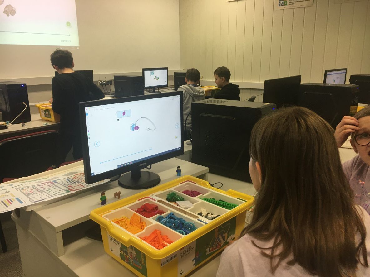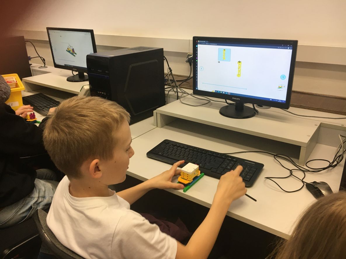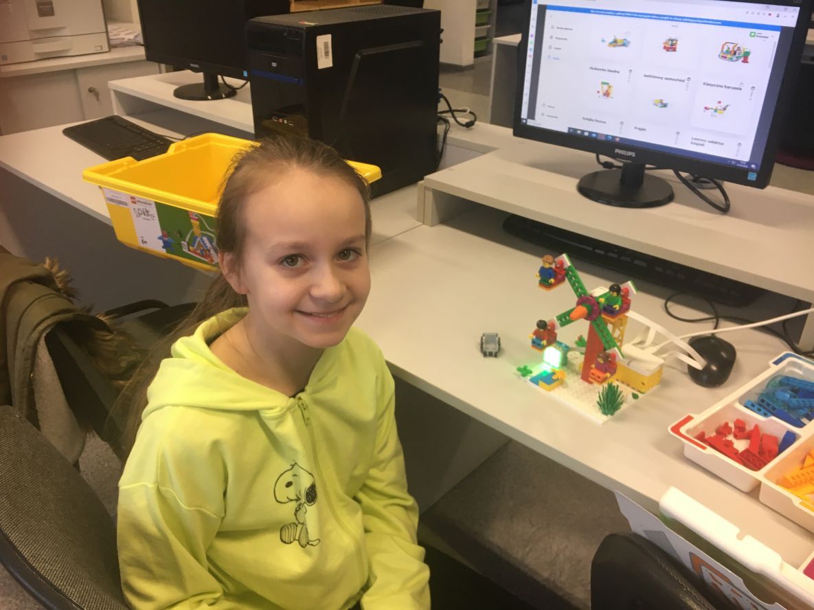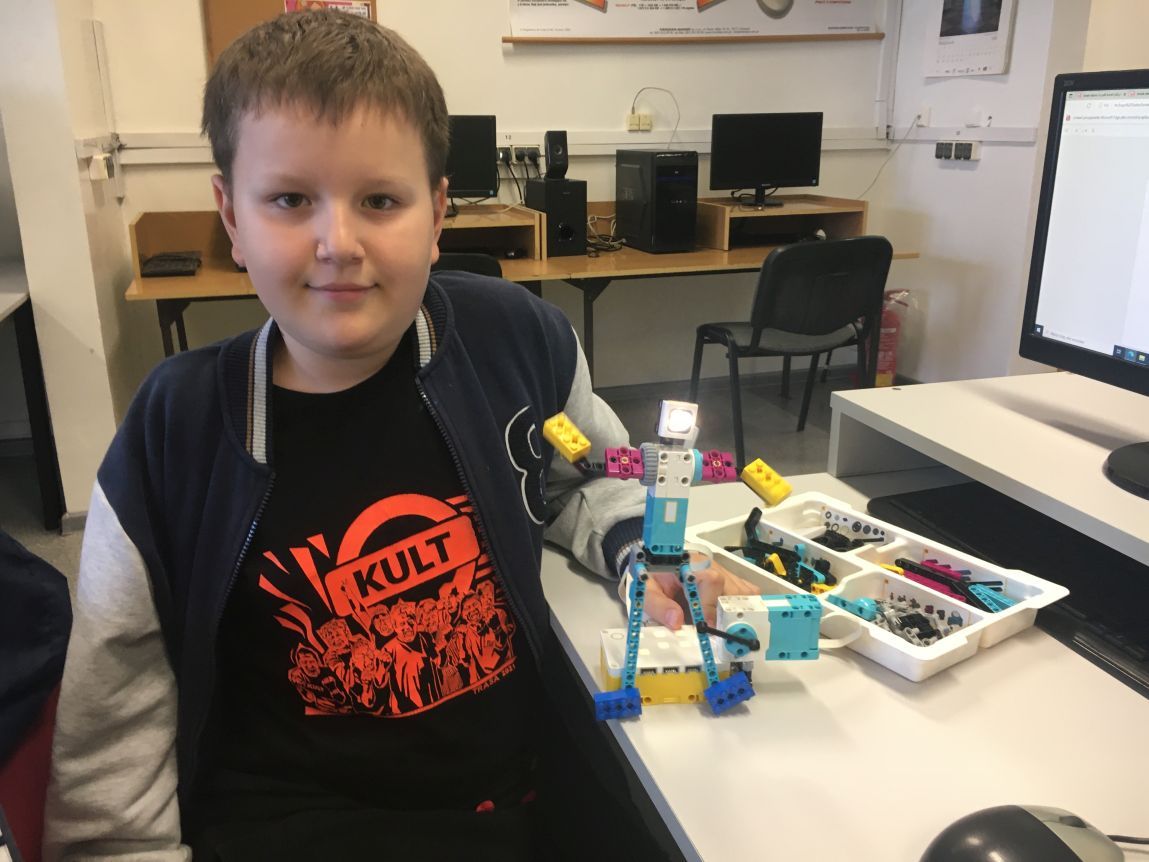 Na zajęciach robotyki uczniowie klas 4 i 5 konstruowali tancerza z zestawów Lego Education Spike Prime. Uczniowie poznali zasady pracy z klockami, rozwijali kompetencje społeczne oraz kształcili umiejętność pracy zespołowej. Zabawa z tancerzem przy muzyce dała młodym konstruktorom satysfakcję z efektów swojej pracy i dużo radości.