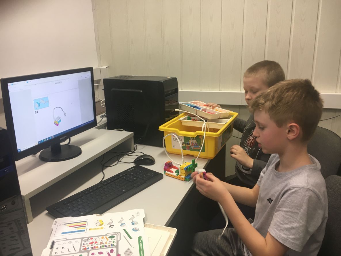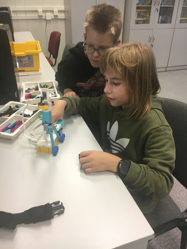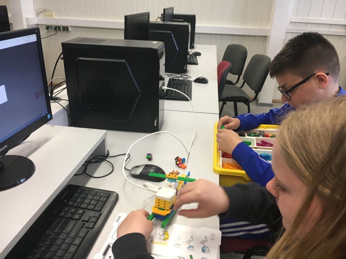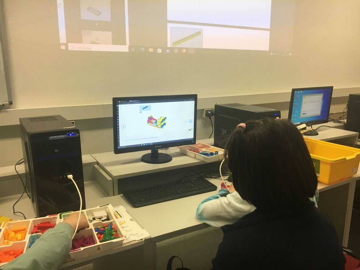 Na zajęciach robotyki uczniowie klas 4 i 5 konstruowali tancerza z zestawów Lego Education Spike Prime. Uczniowie poznali zasady pracy z klockami, rozwijali kompetencje społeczne oraz kształcili umiejętność pracy zespołowej. Zabawa z tancerzem przy muzyce dała młodym konstruktorom satysfakcję z efektów swojej pracy i dużo radości.