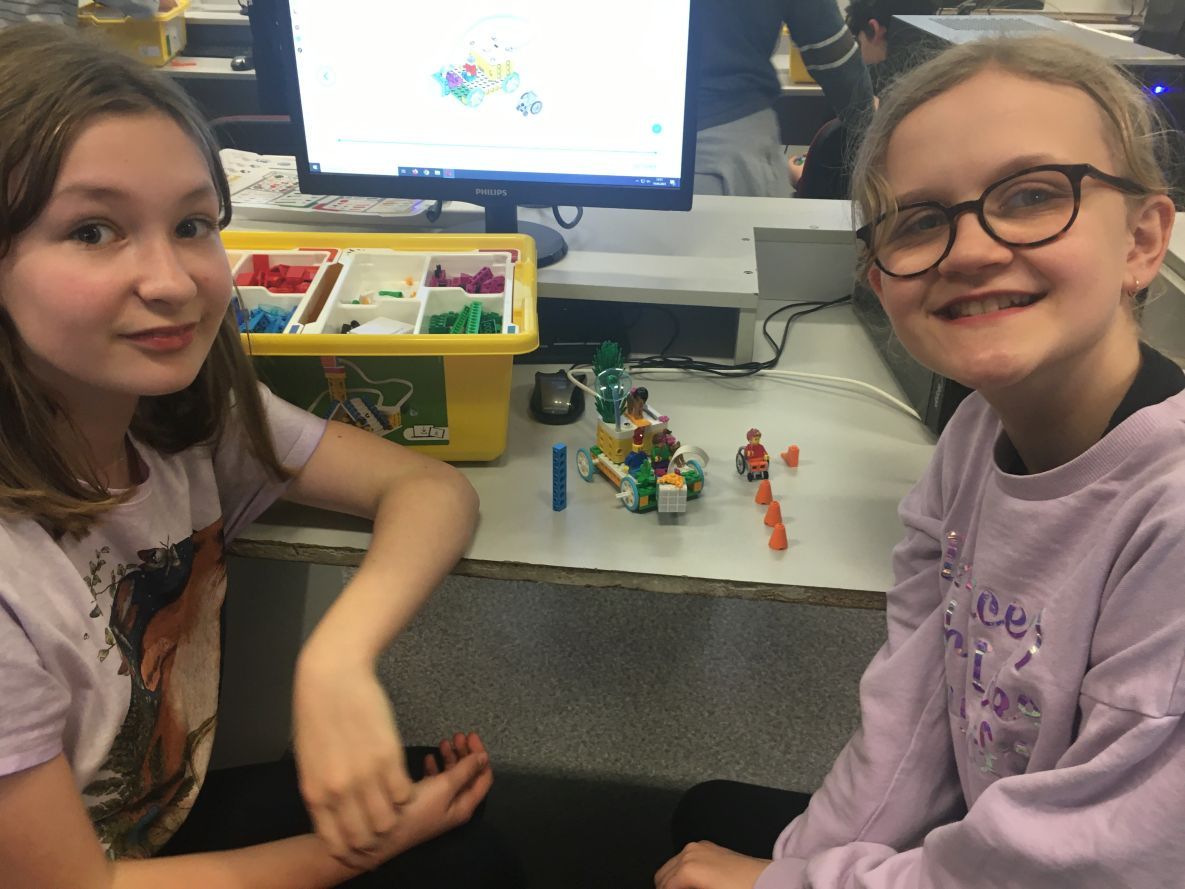 W ramach przygotowań do nadchodzącego Festiwalu Nauki i planowanego pokazu robotów, uczniowie klasy 7b oraz uczennice klasy 8d konstruowali na lekcjach informatyki inteligentny rower z zestawów Lego Spike Prime.