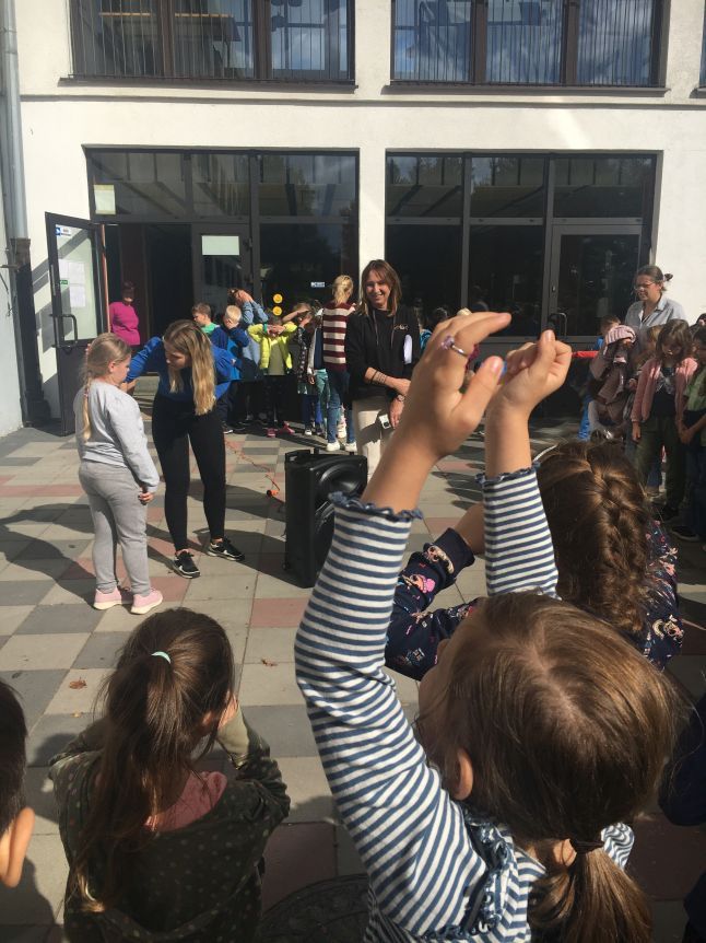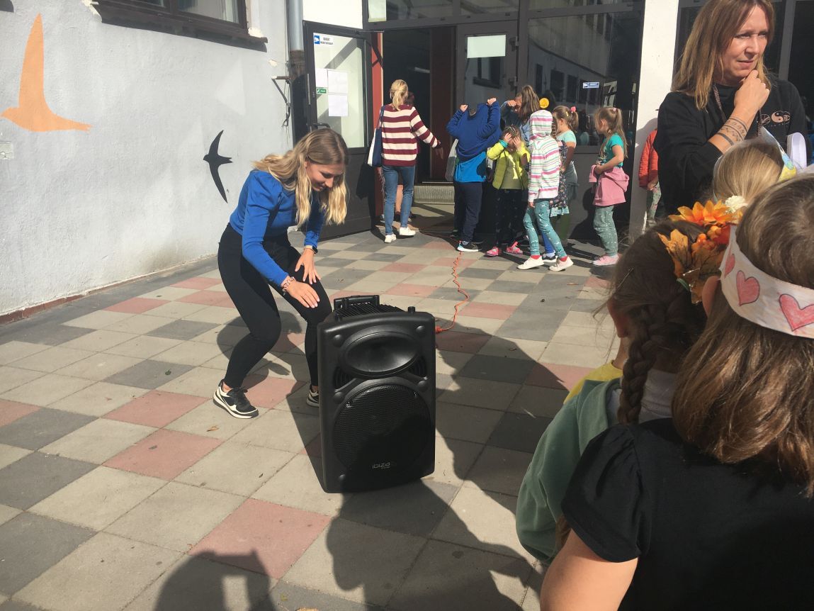 W czasie jesiennych zajęć na boisku szkolnym korzystaliśmy z mobilnego zestawu nagłośnieniowego.