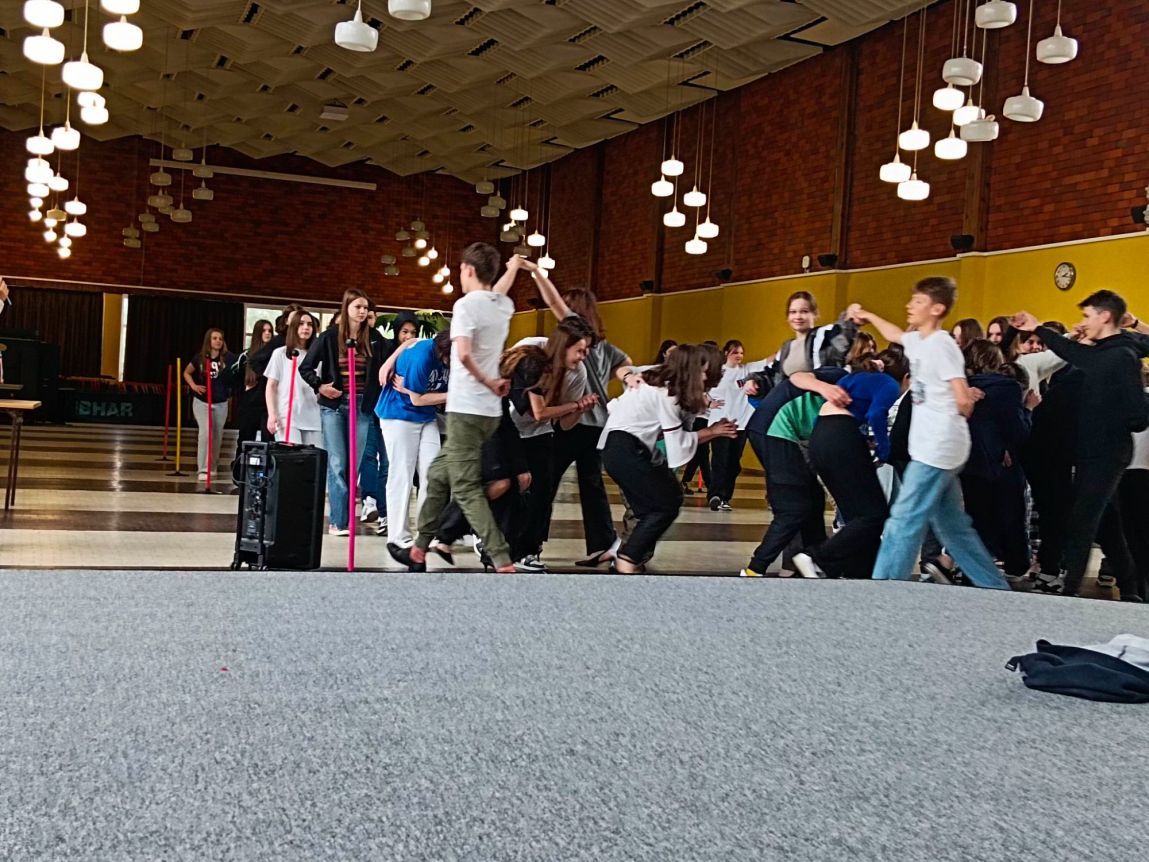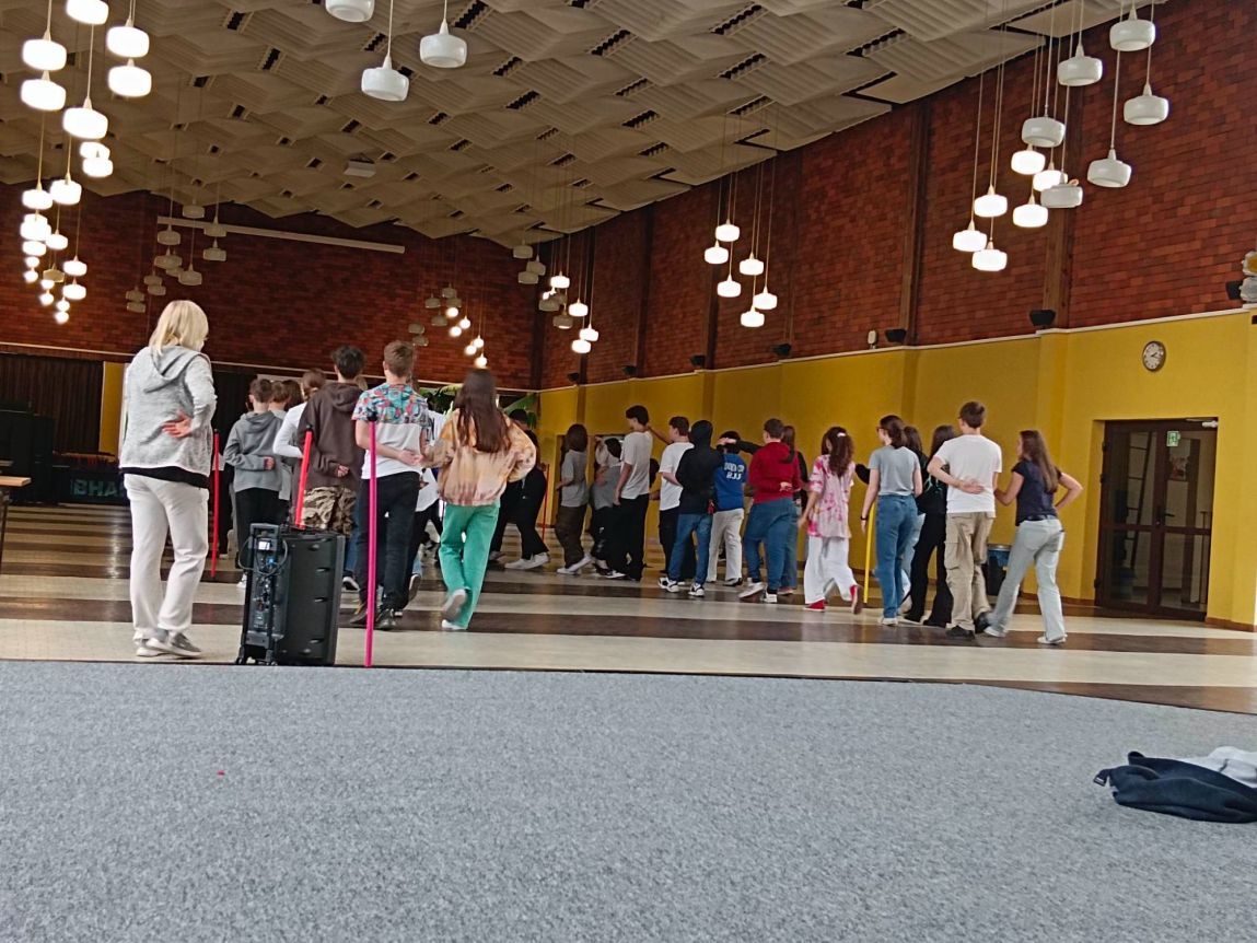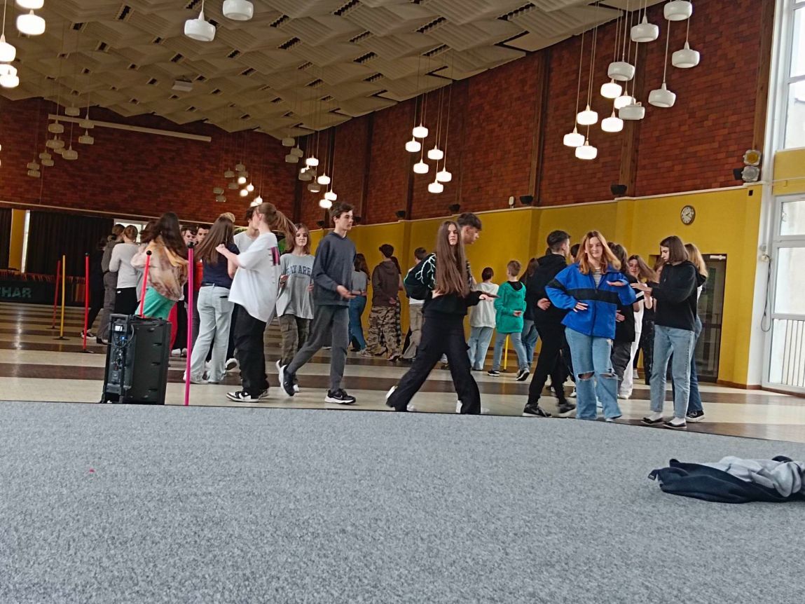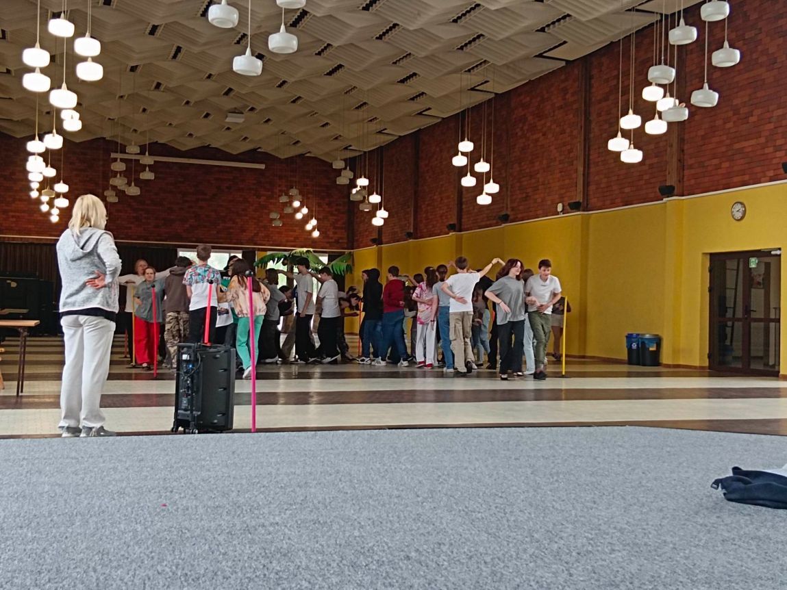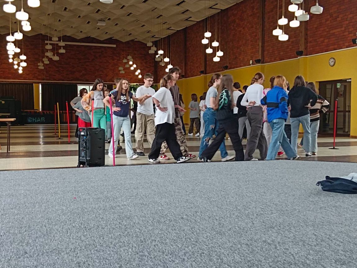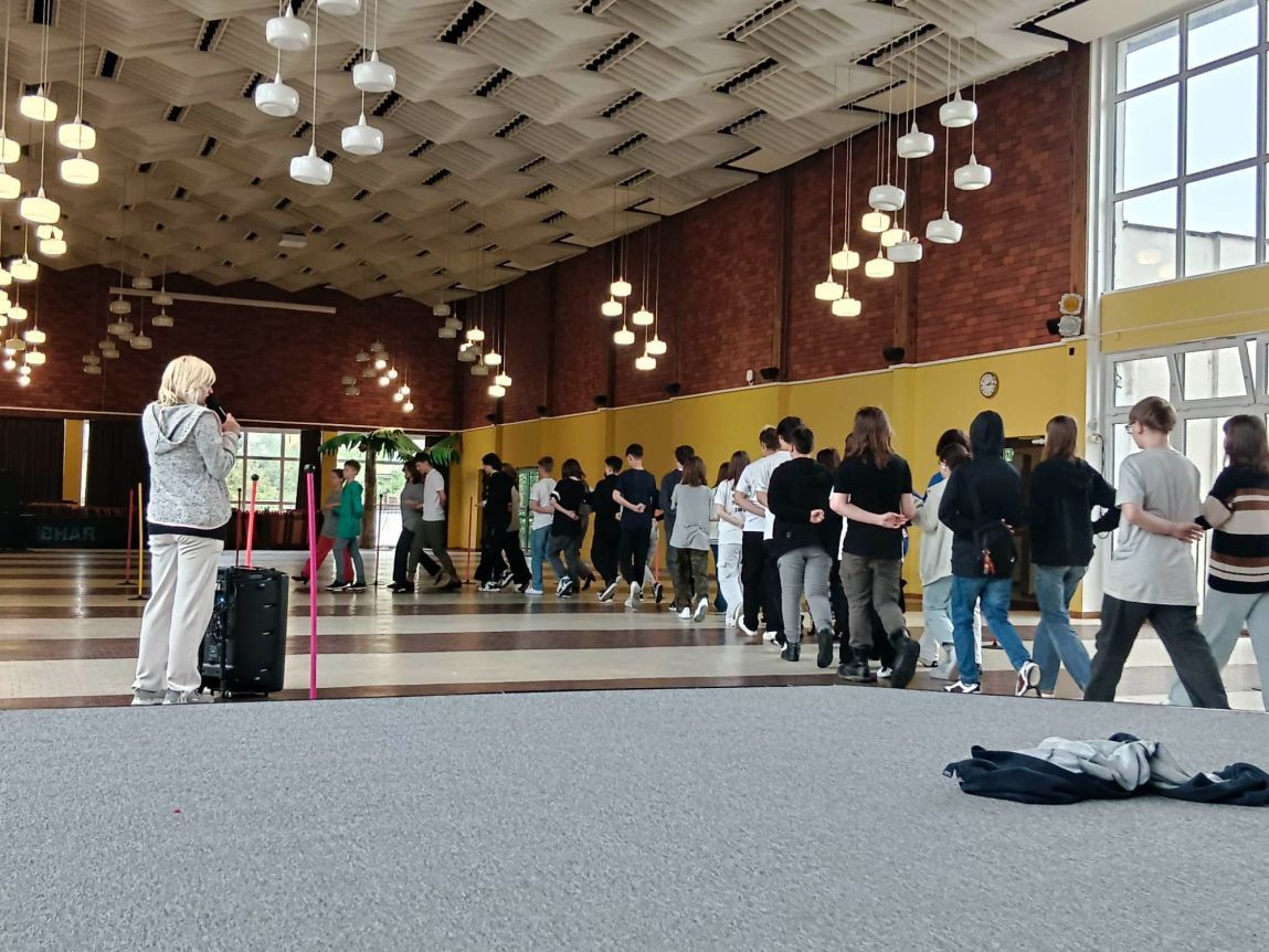 Mobilny zestaw nagłośnieniowy zakupiony w ramach programu „Laboratoria przyszłości” towarzyszył często ósmoklasistom na zajęciach nauki poloneza przed zbliżającym się balem.