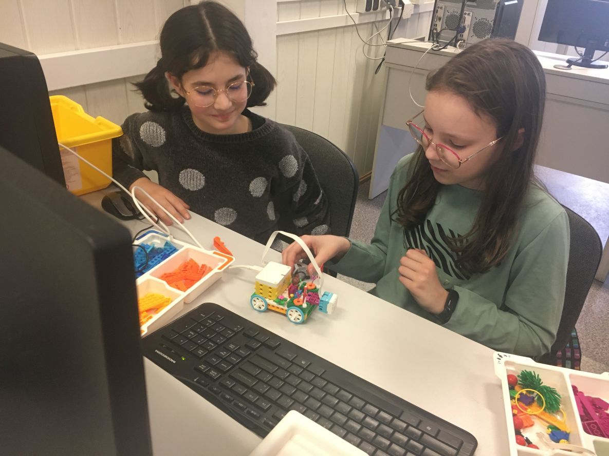 Uczniowie klas 4 i 5 na lekcjach informatyki konstruowali i programowali wizualnie jaskiniowy samochód z klocków Lego Spike Essential. Po zbudowaniu modelu tworzyliśmy program kontrolujący światło pojazdu.