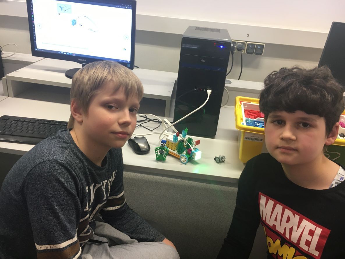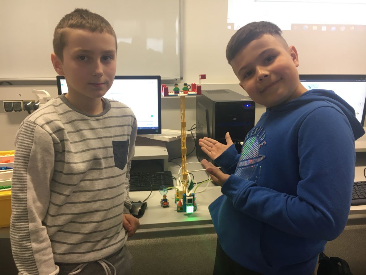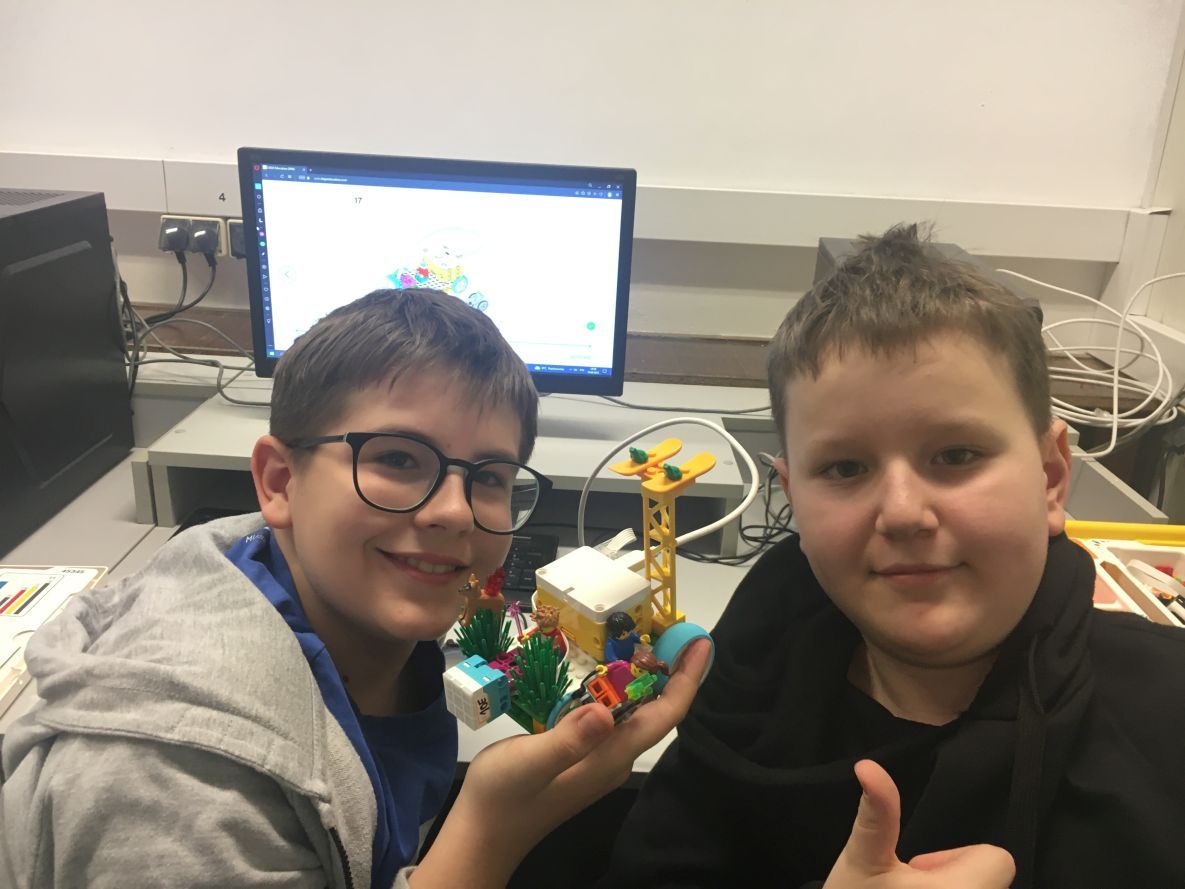 Na zajęciach robotyki chłopcy budowali własne modele z klocków Lego Spike Prime. Bez instrukcji, własne projekty, twórcze rozwiązania w których wykorzystali czujniki (koloru, siły) znajdujące się w zestawie.